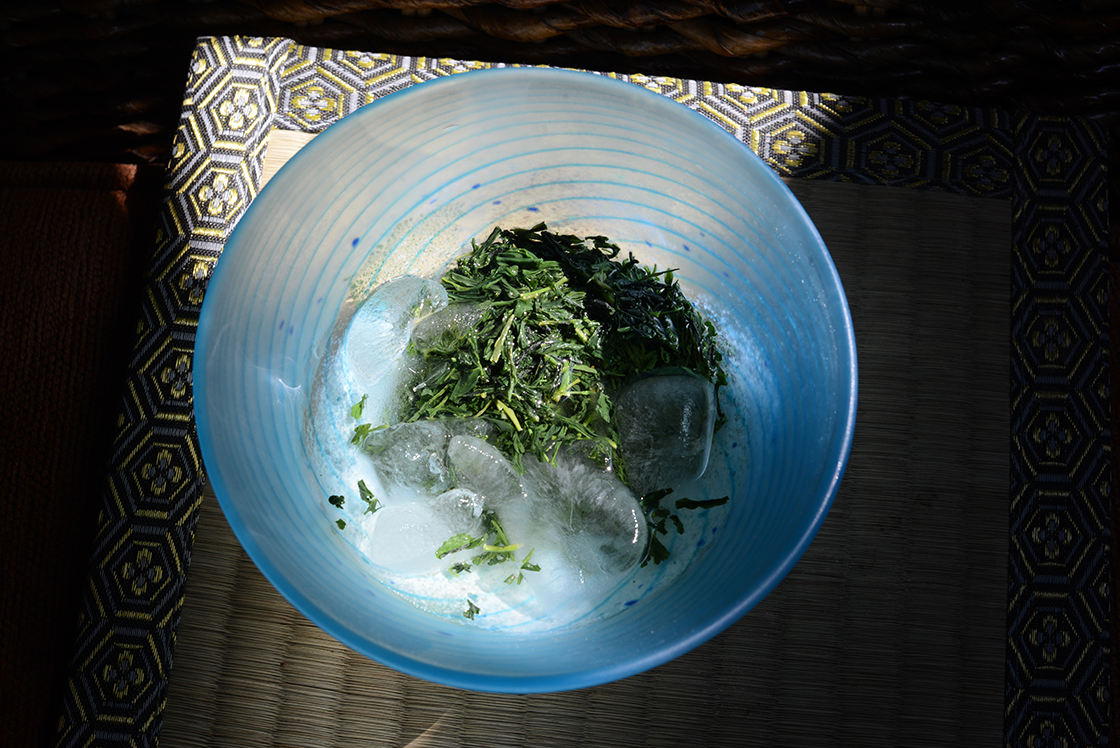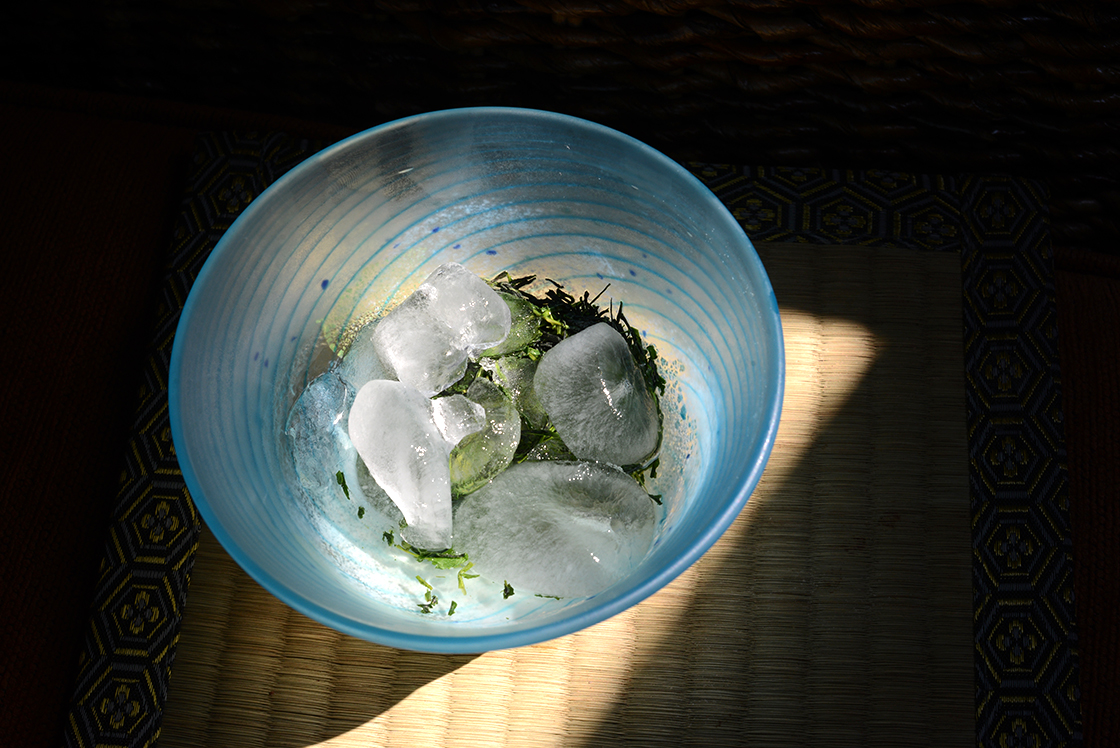 Itt pedig legyen rendhagyó módon üveg chawanban egy csak olvadó jéggel készített Gyokuro Jyoshu