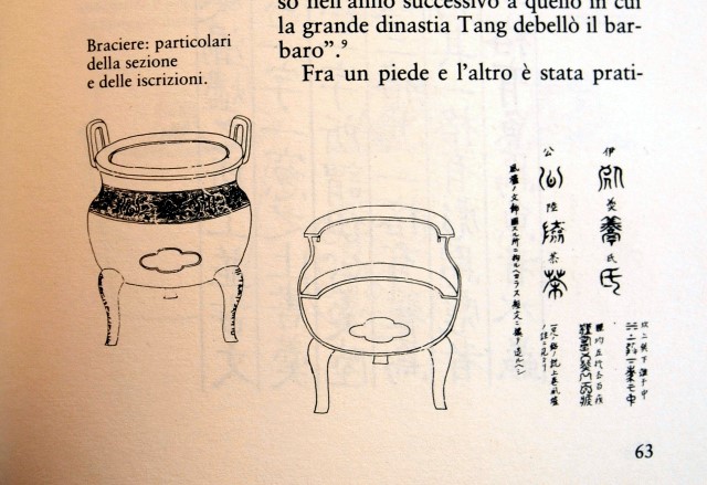 a harmadik felett pedig az „úr” és a „tea”. Ez egybeolvasva annyit tesz: „Levesnek Ji herceg; teának Lu úr.” A parázstartó belsejében magas támaszték találhatóa parázs számára, felsõ részében három négyszögletes nyúlvánnyal. Ezek közül az elsõn a „fácán” (dí) írásjegyáll, mivel ez az állat a tûzhöz kötõdik, a hozzá kapcsolódó trigramm pedig a li. A másodikon a „tigris” (hû)írásjegy található, mivel a tigris a szélhez kötõdõ vadállat,és a neki megfelelõ trigramm a xún. A harmadik kiszögellésen a „hal” (yú) írásjegy szerepel, merthogy a hal vízi teremtmény, így hozzá a kân trigramm kapcsolódik.