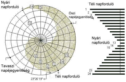 Összekötve a gondosan regisztrált és a kör síkján ábrázolt árnyékokpontokat a kínai naptérkép a baloldalt látható mintát adta. A térkép voltaképpen a az ekliptika és a föld forgástengelyére húzott merőleges síkja metszéspontjának szögértékét (23 26 19) ábrázolja.