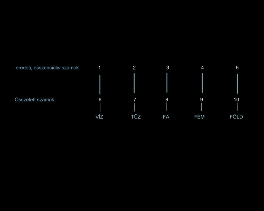 Az első három csupán szabályzó folyamatoknak tekinthető, míg az utolsó három olyan eszközöket jelent, amik lehetővé teszik az univerzumban működő erők érzékelését, felfogását és végsősoron – megértését. A Ji King szerint a számok és azok sorrendje alapvetően fontos szerepet kapnak a rend megértésében. A számoknak is vannak tulajdonságaik, ezek közül a legfontosabb, hogy tíz alapvető szám létezik: 1-10-ig. Ezek közüllényegi (az éghez tartozó ) számok az 1-5;összetett (a földhöz tartozó ) számok a 6-10. Az ég számainak belső összege 25, míg a föld számaié 30, ami együtt, tehát és és föld 55-öt ada páratlan számok az ég számai, a párosak a földé Így a következő párosítást adják Az 1-től 5-ig terjedő számok esszenciális, tiszta, nem összetett számok, szemben a 6-tól 10-ig terjedőekkel, amelyek az első ötből levezethetőek. Ezeket az ábrán látható módon lehetésges párosítani. A világmindenségben megjelenő elemeket, egymásból levezetve e számokhoz lehet rendelni, így jelenik meg a ji king öt alapeleme a víz, tűz, fa, fém és föld..