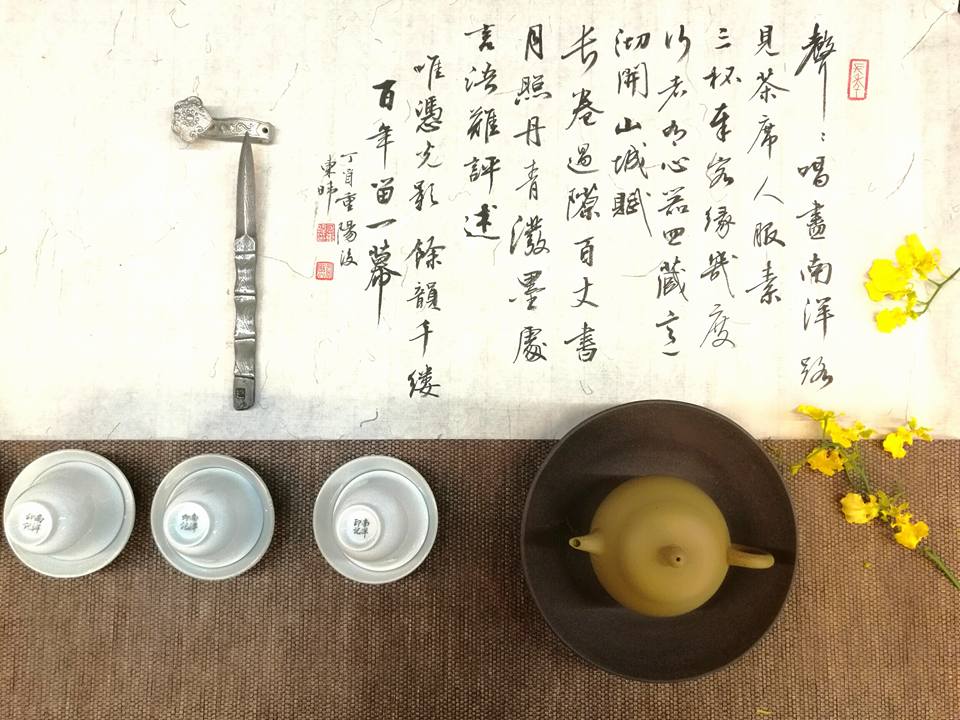 - Ez a gallyacska indulóhelyzetben a fa teamutatón (Cha Shao 茶勺) nyugszik, amivel esetenként a teát is ki lehet szedni a teatartóból. De a fa teamutató már megtette az egész kört, Kínából került Japánba, onnan Tajvanra és vissza a gongfu teába. Az arisztokrata fogadásokon nem volt divat a rusztikus eszközök használata, ott teamutatónak is szabálytalan, vagy lótusz alakú porcelán teamutatót használtak, ez a Cha He茶盒.
