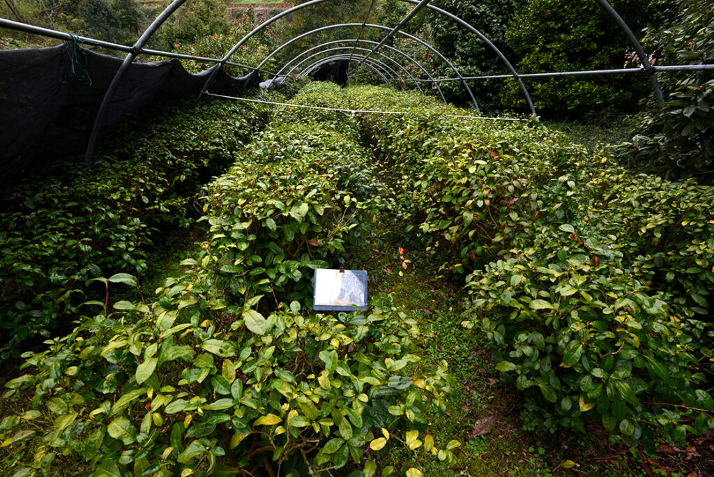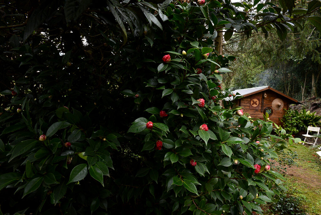 1990 óta kis teakertjük is van, amit folyamatosan bővítenek és saját teát gyártanak persze nem nagyüzemi mennyiségben. Erről elég hosszasan beszélgetünk mindenféle eredmény nélkül, még a fesztivál prospektusa is megemlíti, hogy teájuk japán szakértők szerint is egészen kiváló, miközben nyilvánvaló, hogy ekkora ültetvényről a legjobb körülmények között sem szedhetnek le pár kilónál több nyers levelet, nyoma sincs a feldolgozáshoz szükséges eszközöknek sem. No de mindegy, a gyönyörű kertben néhány sinensis mellett most assamica fajtával is próbálkoznak, valamint Camellia japonica és a sinensis magból olajat is előállítanak. Ez már érdekesebb, mert az olajhoz mindenféle kísérletekkel kapcsolódtak, még az űrkutatásban való felhasználásról is beszéltek, de a hely szelleméhez leginkább illő módon a giroszkópok kenése helyett inkább kozmetikai célra ajánlják. A hidegen sajtolt kaméliaolaj gazdag zsírsavakban (omega-9 és omega-6), ami alkalmassá teszi bőrünk és hajunk ápolására, amit a kihelyezett tájékoztató táblánkról ránk mosolygó japán hölgy is megerősít. (Itt kell megjegyeznünk, hogy a Borrini teakert tényleg csak szuvenír ültetvény barátunk Salvatore Pellegrino szicíliai kertjéhez képest, ami immár többezer növényt számlál és a migráció révén a teaszedésben, gyártás során egyebekben túl drága munkaerő kérdését is sikerült megoldania. Film is készült róla, a tea ember címmel.) A hosszú tél még itt ólálkodik, a tea még nem bontotta ki a virágát.