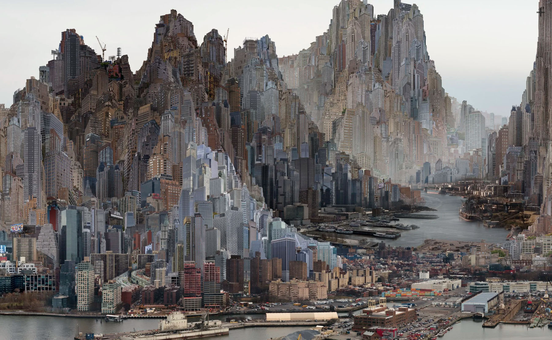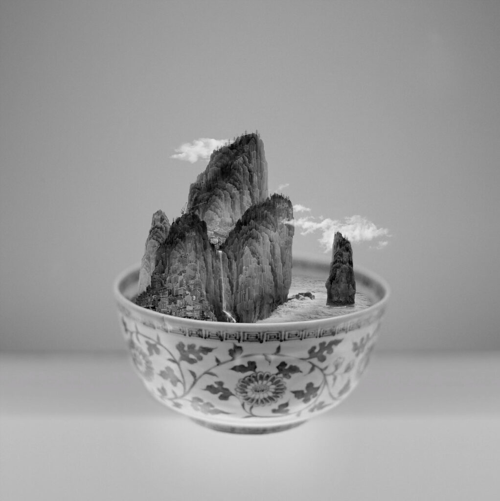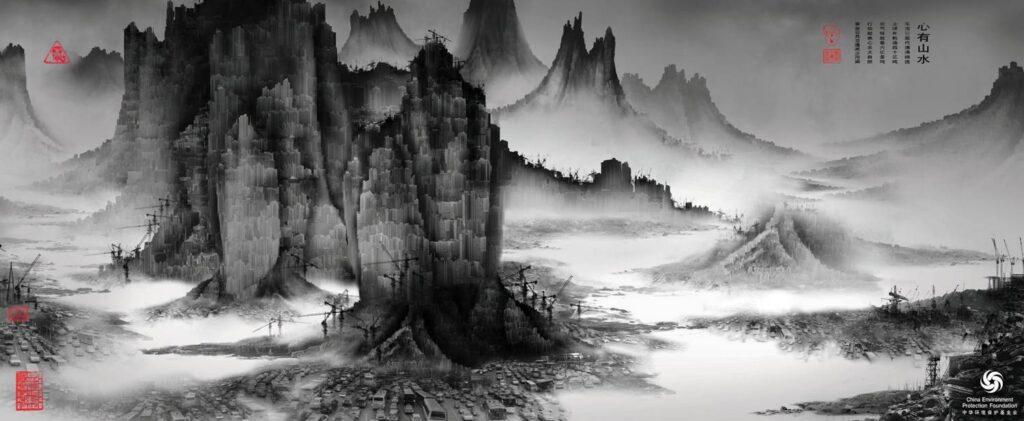 Ide jutottunk. A képzőművészet kínai kézikönyve óta majd 2000 év telt el, abban arról írtak, hogyan kell áttenni a papírra a kép lelkét, a másolás különféle technikáival. Yang Yongliang képei minden tekintetben megfelelnek ezeknek a szabályoknak. Ember alig fordul elő a képeken, tájak, hegyek, ködbe vesző láthatár, magányos fák a hegyek alján. Bármelyiket kiválaszthatnánk egy teaszertartásra, mint a harmónia, költészet és egyensúly szép mintáját. De hopp az a fa a hegy alján nem fa. Tűszerű, éles és huzalok lógnak róla, daru az, fémből épületeket épít, mit épületeket, hisz maga a hegy is roppant, monstrum, mérnöki erekció, ember rittyentette szörnyedmény. A hegy oldalát nem fenyők népesítik be közöttük szarvasokkal, hanem távvezeték oszlopok. Fantazmagória tehát, fantom tájkép, futurisztikus fotókollázs. Vagy mégse. Világszerte mégse. Nem árt ha körülnézel, amikor kilépsz, mi is vesz körül. 1000 éve a ködbe vesző városok, és templomok a spiritualitás koncentrált erejű festményei voltak, most a technika köhög át a ködön, az se köd már, hanem szmog. Érdemes közelebb menni a képekhez, amelyek valóságos mérete sem engedi meg, hogy átfussunk a részletek fölött. A történelmi hagyományokat követve némelyik tekercs 10 méter hosszú is lehet. Elképesztő részletességgel és aprólékossággal összeállított képtelenségekből álló képek, fekete fehér fotódarabkákból kollázsolt tájképek. (Lásd lentebb a képek között)