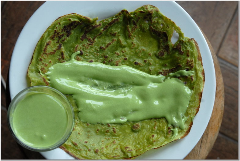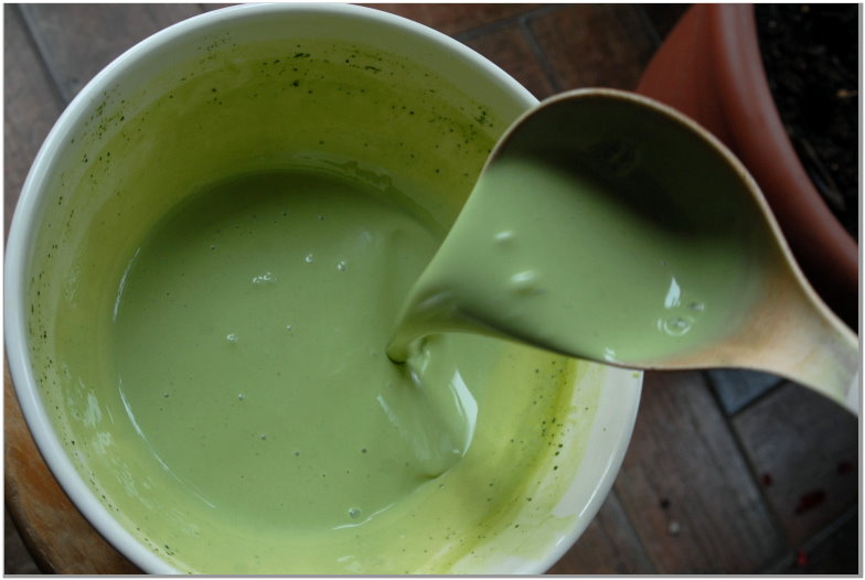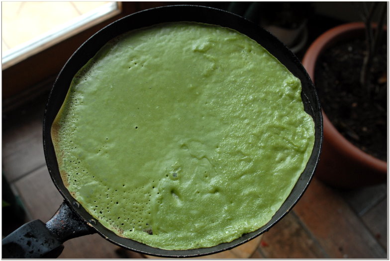 Mi 1 liter tejet, 4-500 gramm átszitált lisztet, kevés olajat, sót és cukrot, továbbá 6-8 tojást használunk a palacsinta tésztájához, mindezt nagyjából szemrevételezés és a krém konzisztenciája alapján. Most viszont hozzátettünk egy evőkanálnyi Matcha Rindout és hozzáfogtunk a palacsinta normál kisütéséhez. Ez a képen látható zöld rugacs, avagy matchával készített palacsintatészta, ami már önmagában is finom.