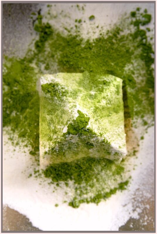 A süteményhez használt matcha mennyisége. Amennyiben az 1 adag vaj 250 gramm, akkor egy szűk evőkanálnyi teát használjunk. Összedolgozás közben ne essünk kétségbe,a tea színe csak a vaj megolvadásával fog előjönni, addig nagyon halvány.