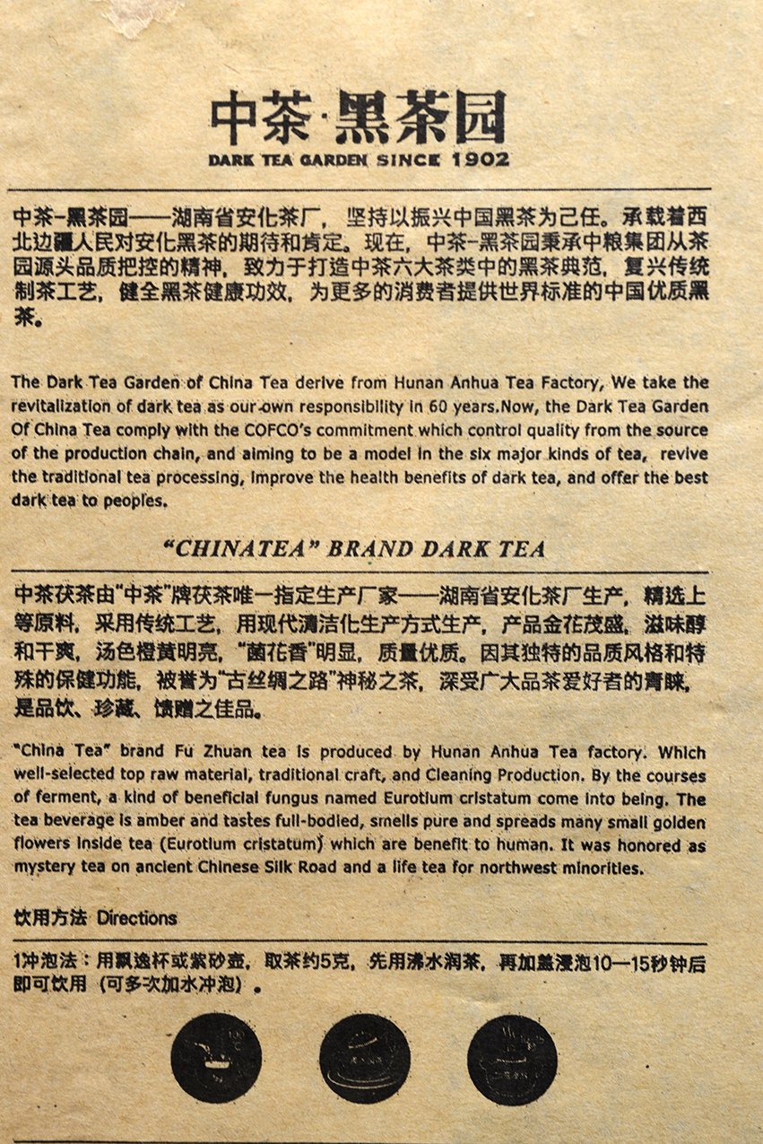 A tea neve Fu Zhuan Hei Cha, magyarra úgy lehet fordítani „Arany virág fekete tea tégla”, de a kínai névben az arany szó nem szerepel. Ez egy Hunan tartományban gyártott hei cha, azaz posztfermentált, préselt fekete tea, aminek a fermentációs fázisaiban saját és beoltott mikroorganizmusokat használnak.