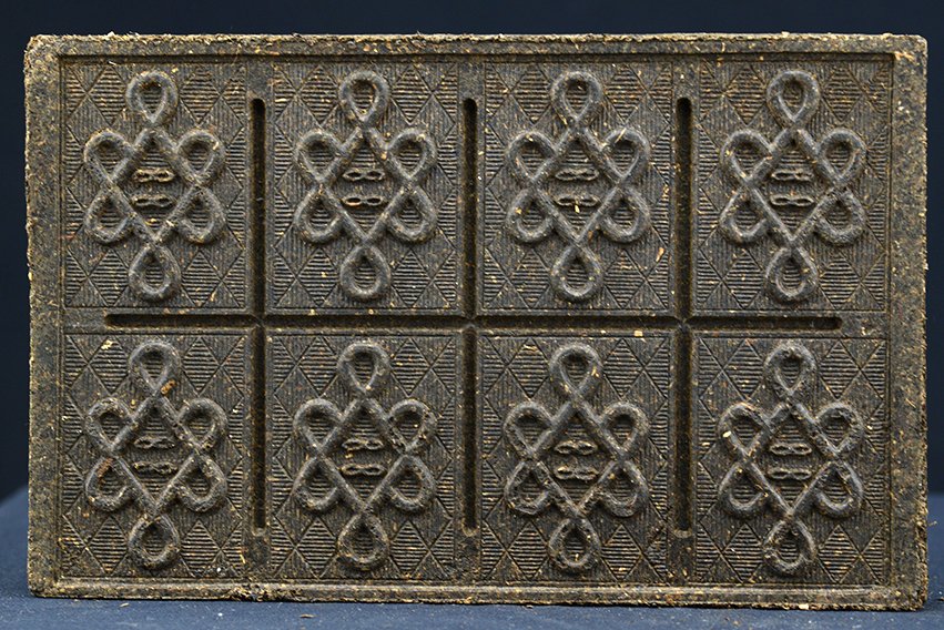 Ennek a különös teának hosszú története van, visszavisz bennünket abba a korba, amikor még Kínában is porrá őrölték, majd formába öntötték a tavaszi teákat, de akkor még nem fekete, hanem fehér formában. Ezt a Mi Zhuan Cha nevű teát is hosszas, bonyodalmas gyártási folyamat végén öntik különféle formákba, legtöbbször levélmintával, tájképpel, városképpel díszítve. Régen főnix és sárkány díszítette, ma a pártkongresszus, Chibi város piacának kapuja, itt meg ez a lokomotív. Lendületes, dinamikus, szó se róla. A Mi Zhuan Cha tea Chibi város teája Hubeiből, ez itt nagyon jó minőségnek tekinthető, az egészen apróra tördelt, porított teában felismerhető a tavaszi rügyek világosabb tónusa. Egy adag elkészítéséhez egyharmad kockányit kell felöntenünk sokszor, mintha puerh tea lenne. Az egész forma 350 gramm.