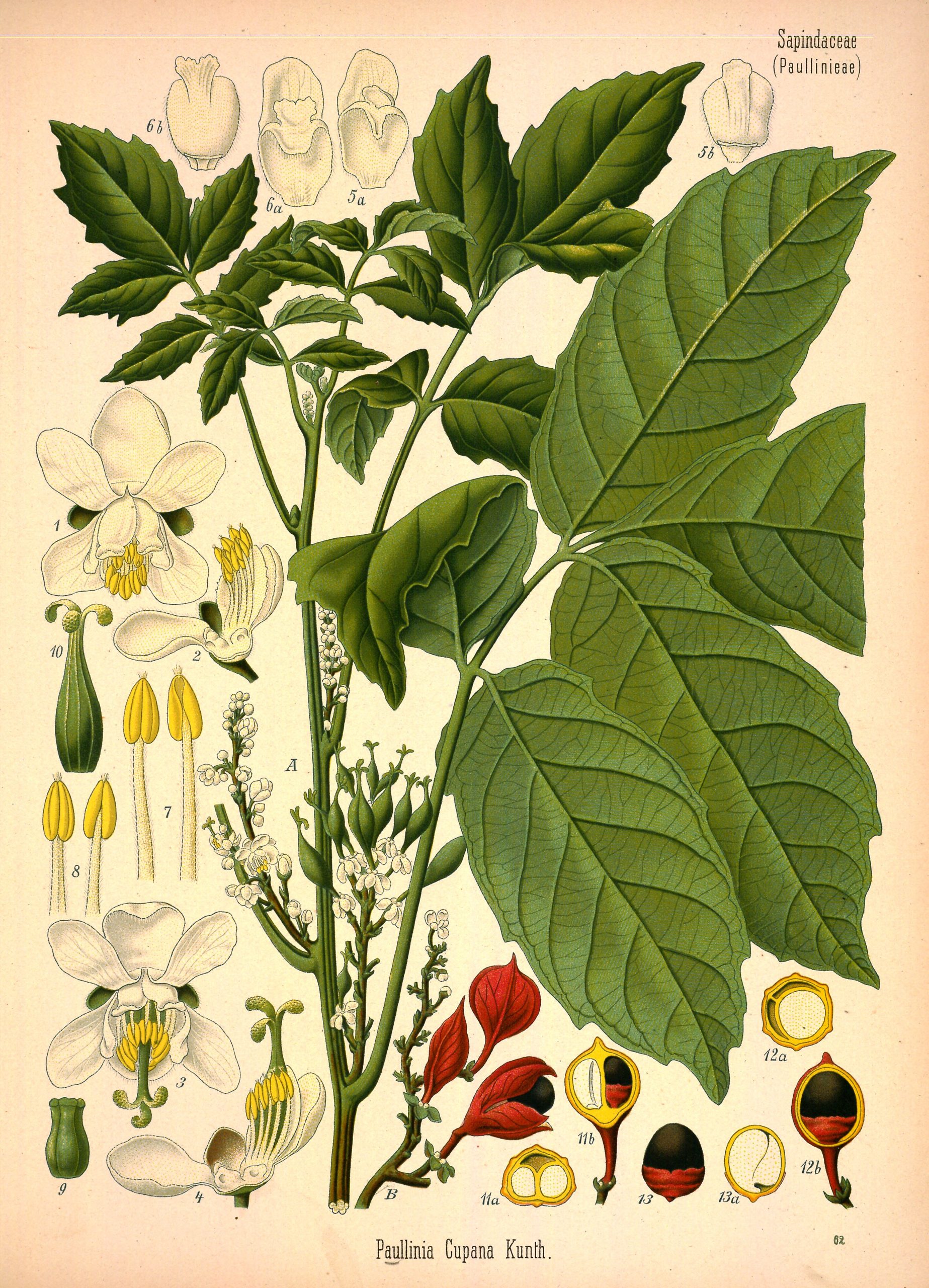 A guaraná ( Paullinia cupana) a Maués-Açu folyó vidékén, Északnyugat-Brazíliában őshonos növény. A guarana névadója a növény tulajdonságait felfedező, a guaranát domesztikáló Sateré-Maué törzs, az ő nyelvükön a warana, a gyümölcs, ami olyan, mint az emberi szem. Tényleg olyan, az érett piros guaraná bogyó kinyílik és a fehér húsban láthatóvá válik a fekete mag, mintha csak vérben forgó emberi szem lenne.
