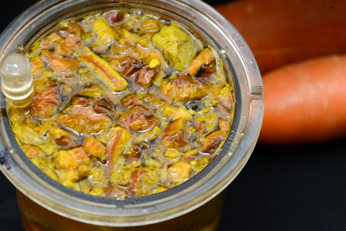 Ez itt most a legújabb irányzat, a gyümölcsteákat felváltó jövő, a BIO gyümölcsökből és zöldségeklből készített gyümölcstea. Én még ma is frusztrált álmokat ápolok az óvodából, amikor a névtelen dietetikus mézzel kevert reszelt répát írt elő nekünk tízóraira, de sok más között azóta ezzel is megbékültem. Dióval és olivaolajjal mostmár megeszem.