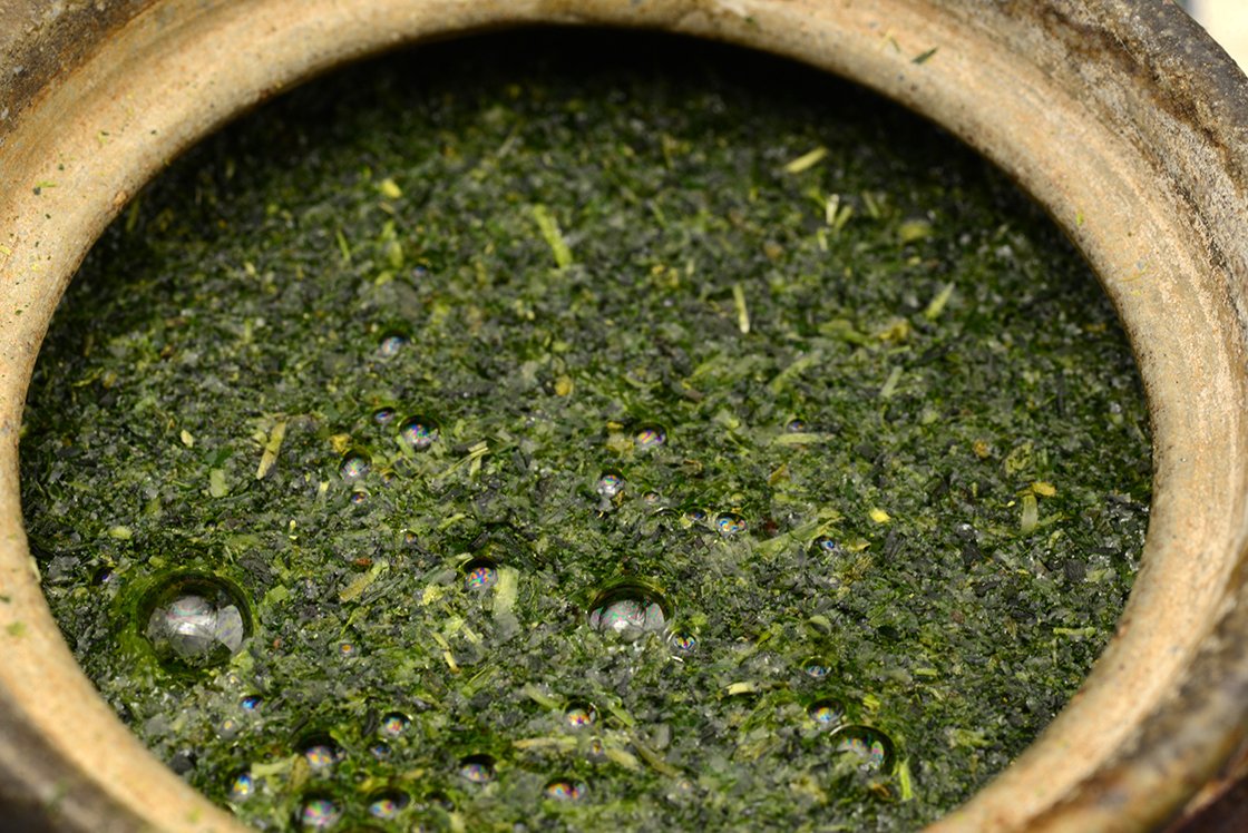 Gyokuro Konacha, azaz gyokuróból visszamaradt tea pelyhek. Gyors felöntésekkel nyolc, tíz alkalommal felönthető sűrű, finom tea.