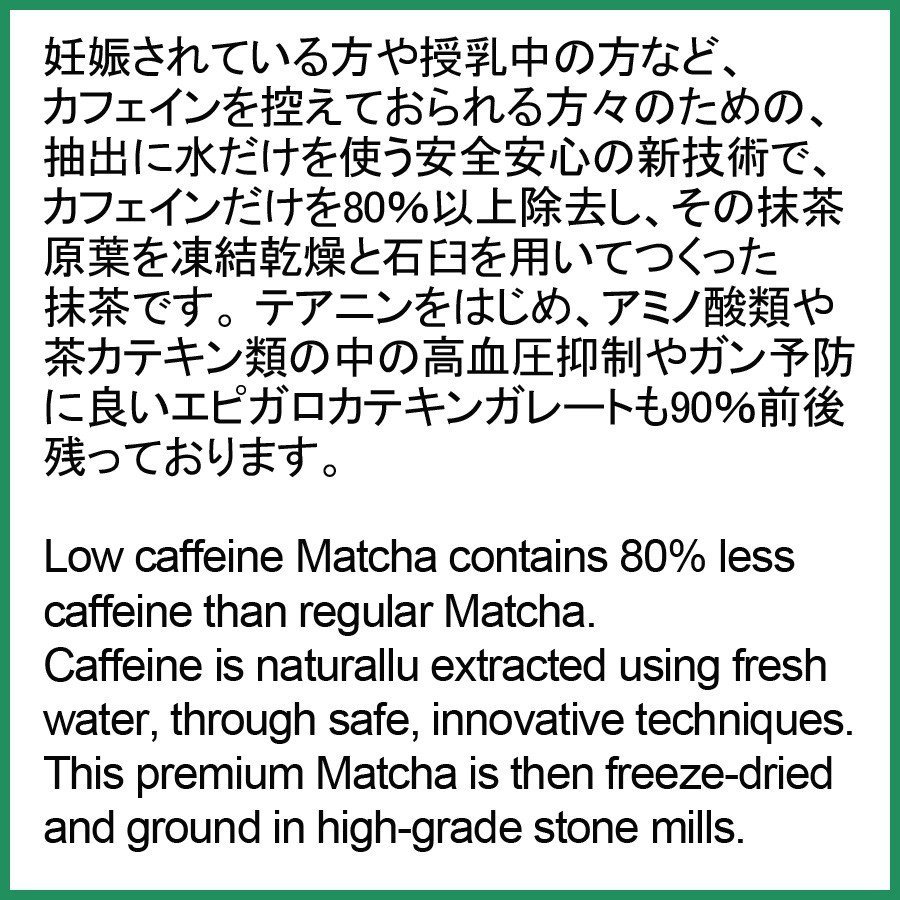 Mielőtt megtévesztéssel vádolnának: teljesen koffeinmentes tea és kávé nem létezik. Különféle módszerek léteznek a koffeintartalmú növények koffeintartalmának kivonására, a kémiai módszerek érthető módon nem túl bizalomgerjesztőek, ám elfogadottak. A tea esetében szerencsére a koffein olyan alkotórésze a teának, ami az első felöntések során nagyrészt kioldódik. Innen az ötlet az alacsony koffeintartalmú tea és az úgynevezett Koffeinmentes matcha előállítására. A csak rügy árnyékolt leveleket feldolgozás közben hideg vízzel többször átmossák, így a koffein jelenetős része, több, mint 80 %-a kioldódik, miközben az értékes polifenol frakció, ezen belül az ECGC jórészt érintetlen marad. Ezután a leveleket szárítják, osztályozzák, majd a már ismert módon gránitmalomban megőrlik.
