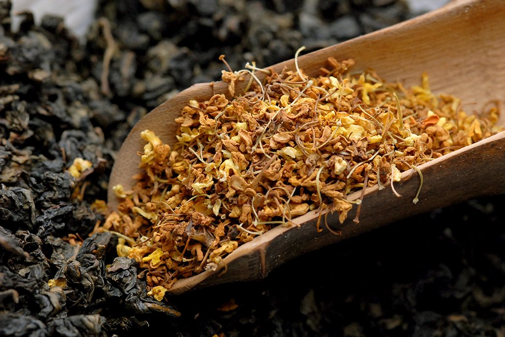 Az osmanthus elsőrangú herbárium és teaízesítő. jobb esetben csak a tea természetes módon, egy térben tárolva veszi át tűnékenyen finom aromáját. Mint az aranyfüst, hagyományos sütésű oolong tea osmanthus virággal keverve. Az osmanthus narancsszínűre sötétíti az öntetet, egyben fanyar és édes telt érzetet ad.