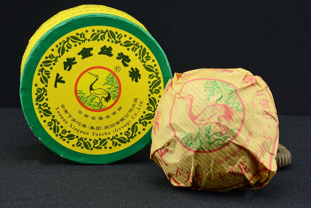 A Xiaguan Teaüzem egyik prémium, pontosabban az egyik legjobbnak tartott tuochája. Azért egyik, mert több is van, van kék és van rózsaszín dobozos, te ji levelekből készült tea. A különbség annyi, hogy ez az arany szalaggal (jin shi ) „jelzett” tuocha egy dali termelő alapanyagából táplálkozott 2006-os kiadásáig, aztán a forrás más okok miatt elapadt. Így maradt a tuochának három egymást követő kiadása, ebből az első a 2004-es. Az arany szalag és a teába nyomott „vízjel” (egy gomba) a gazdagság, a prosperitás és a legjobb minőség jele. A tuocha, amit épp a Xiaguan Cha Chang talált fel, illetve örökített tovább a hagyományból – egyebekben csészét jelent és jelképez. Azért nem gömb, mert nem tudna kiszáradni megfelelően.
