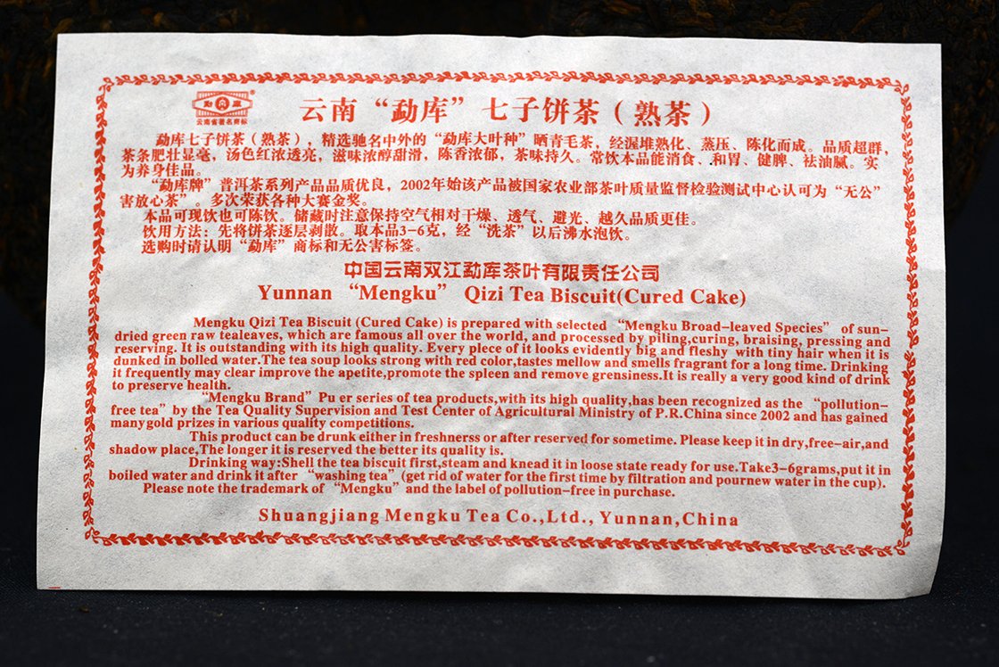 A Shuangjiang Mengku Teaüzem Mengku Rongshi márkájának (勐库戎氏 Mengku Rong család) 145 grammos mini lepénye. Az alapanyag nagy levelű menghai és lincangi teák 2003-as korai szedésű blendje, amit feldolgozás és fermentálás után 2005-ben préseltek formába. Kora tavaszi gong ting – különleges minőségű – rügyek, erősen sodort és megdolgozott anyag. A tea ugyanebben az évben aranyérmet nyert a shanghaji tea expon. Nagyon apró rügyes, sűrű, gépi préselésű tea. A levelek ennek ellenére szinte teljesen épek. A tea jelenleg 12 éves, most érkezett el az érésnek arra a fokára, amikor a finom, édességnek el kellene kezdeni uralkodi a nyers erő fölött, de ez itt még mindig inkább egymás mellé rendelő viszony. A sűrű préselés miatt könnyű eltéveszteni a fejadagot 3-5 gramm elég és 145 is nehezen osztható hattal.