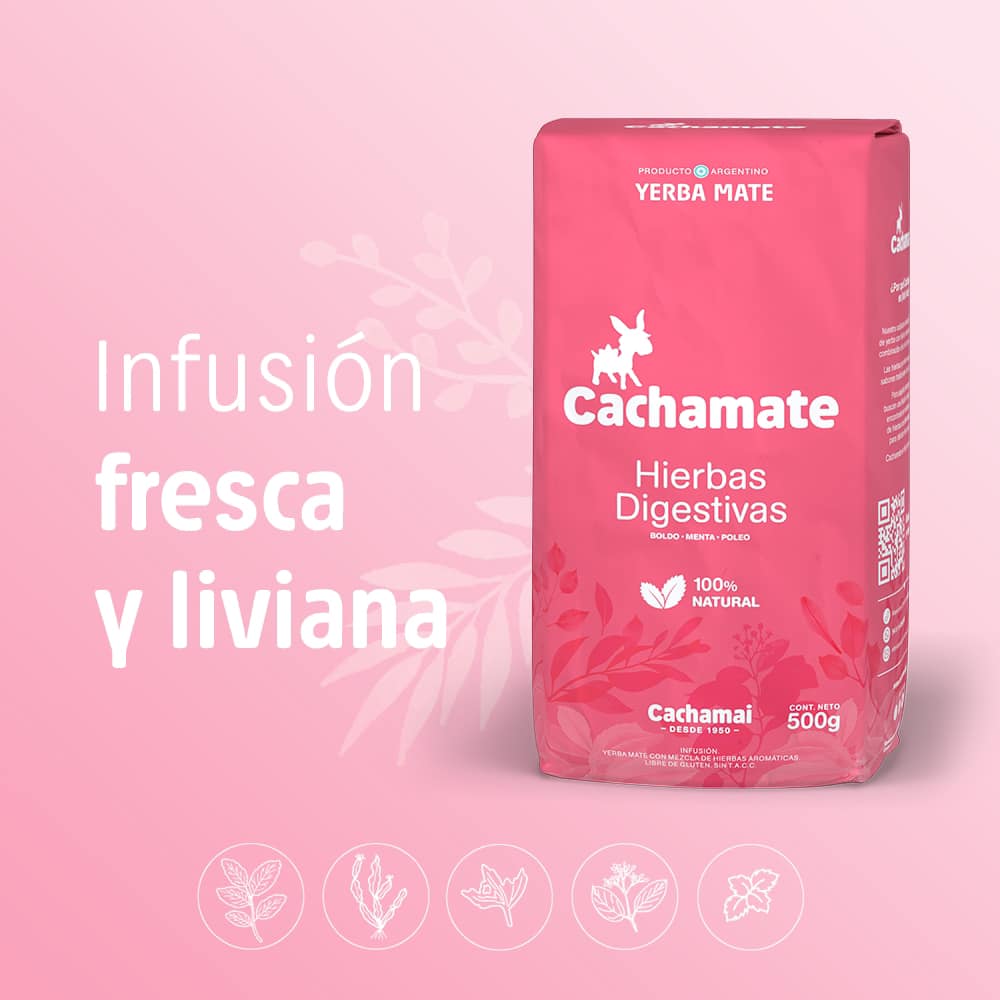 A Cachamate mate tea alapja mindig 12 hónapig érlelt mate és egy csomó herba keveréke. A pink rózsaszín cachamate összetétele: yerba mate szárral, csombormenta, muskotályos rózsa, édeskömény, boldó, cedrón, menta, fucus, vitaminok, cink). Ezt a receptjét a gyártó májvédő teának is javasolja.