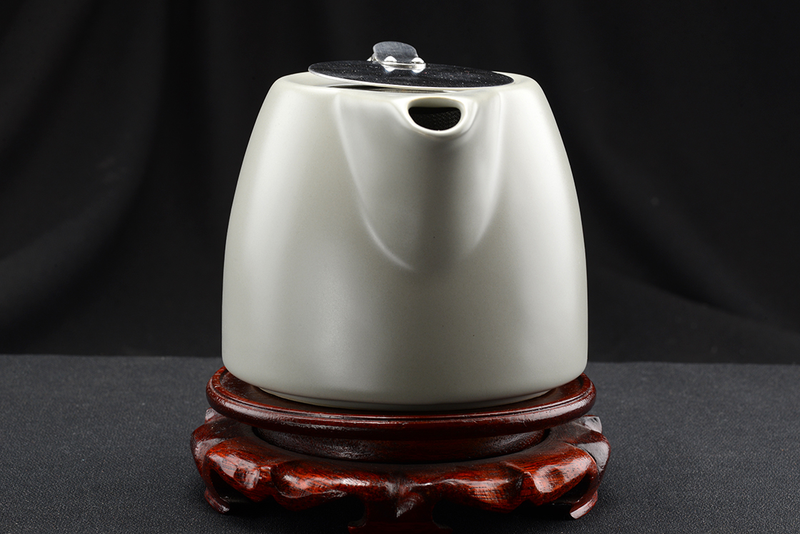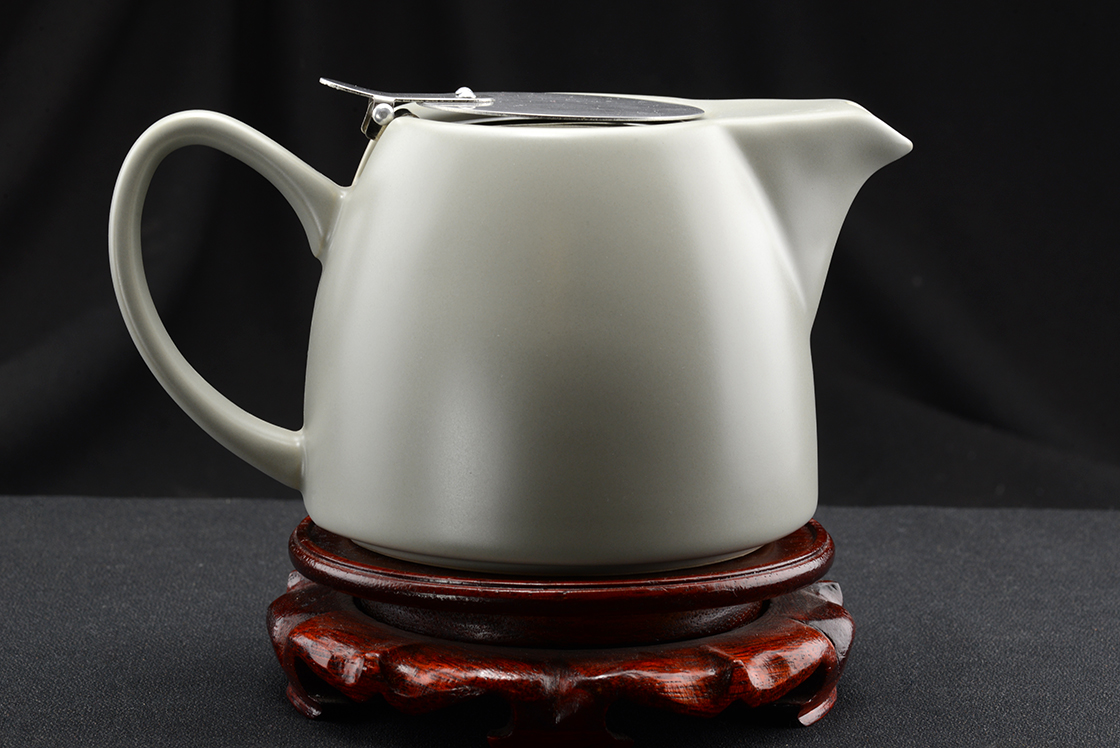Európai megrendelésre Japánban tervezett és gyártott matt platina színű kerámia teáskanna. A fedél alatt inox-acél teaszűrő.