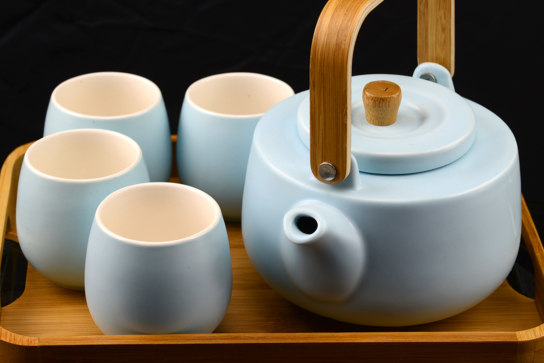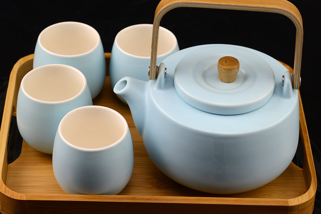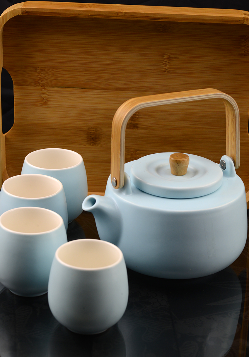 31 x 23 cm méretű bambusztálcán helyezkedik el ez a 0,9 literes, matt, égszínkék porcelán teáskanna, préselt bambusznyéllel, kivehető nyeles inox szűrővel és négy csészével, melyek űrtartalma 1,8 dl.