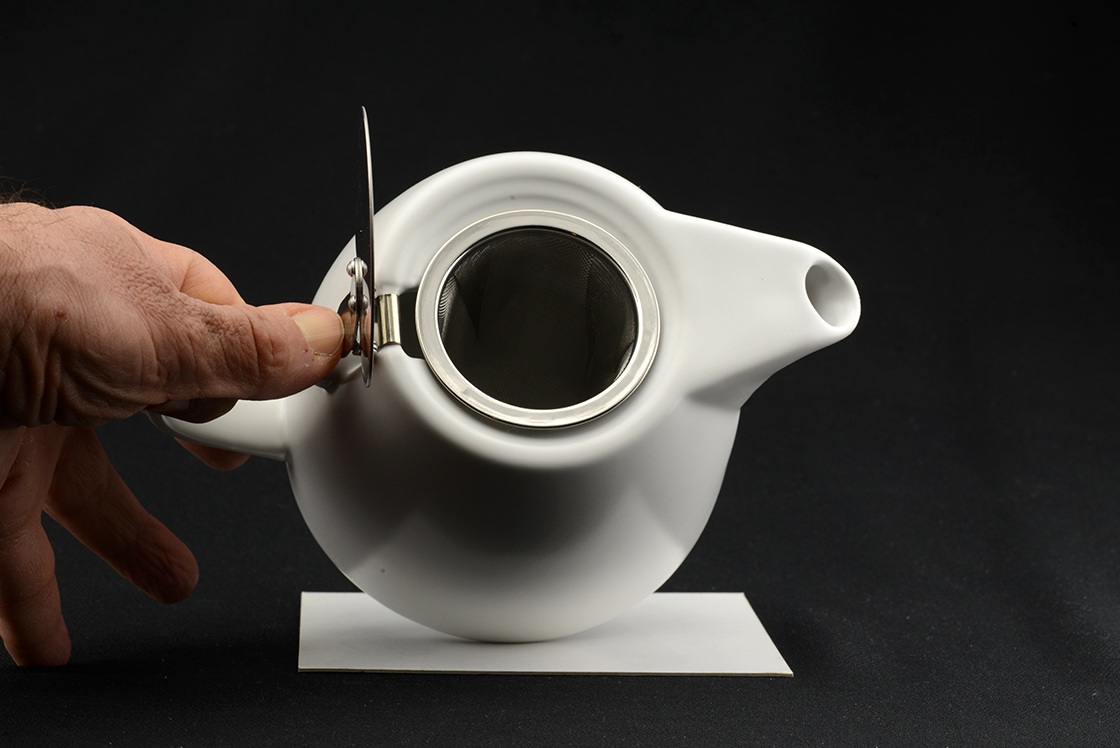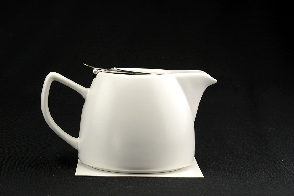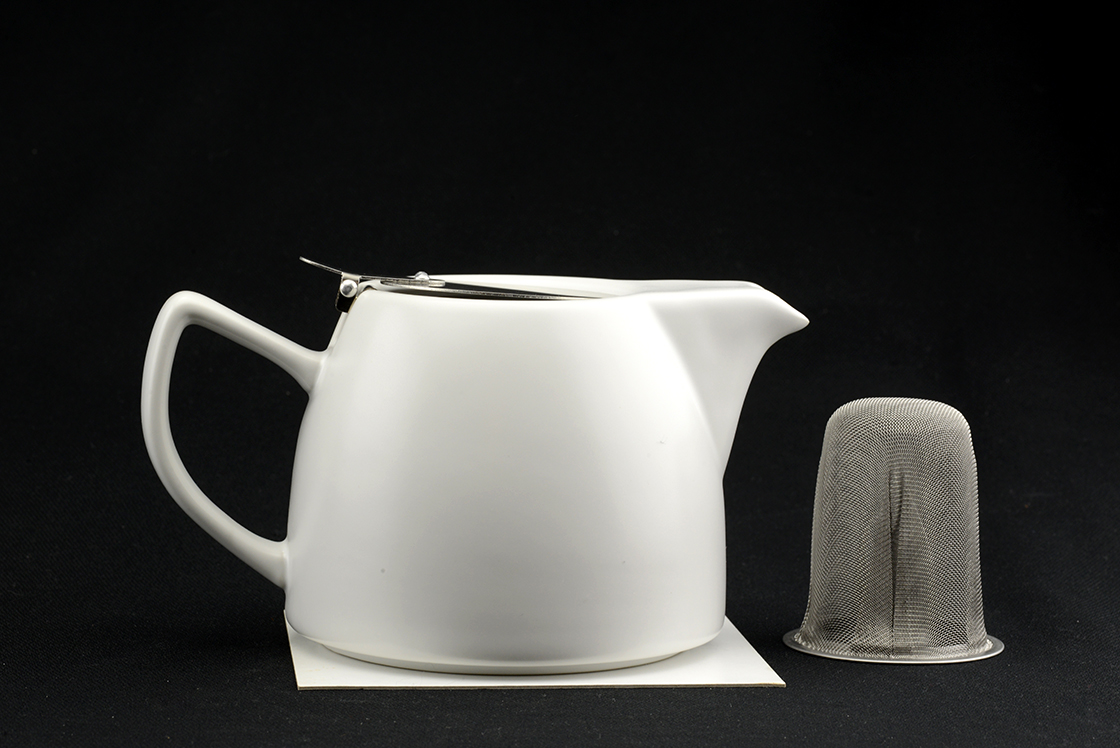 800 ml űrtartalmú modern mattfehér kerámia teáskanna rozsdamentes szűrővel. Német megrendelésre készült Japánban.