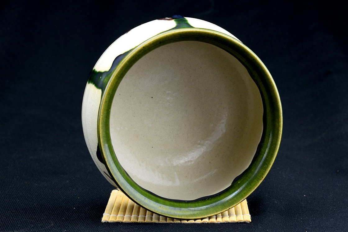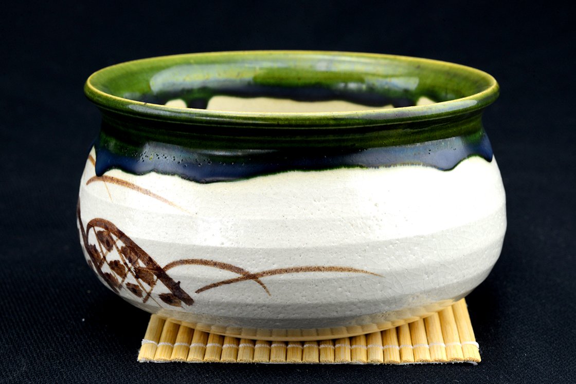 A teázás olyan, mint a lótuszvirág, sárban fészkel és gyönyörű termékeny, tápláló virágot hajt. A sár a teázás során keletkező mindenféle szenny, amit el kell tennünk az útból, tudja ezt mindenki, aki naponta ül le a csészéje elé. Erre való a kensui 建水, hulladék víz tároló. A kensui is lehet mindenből, de a legtöbbször bronzból, vagy kerámiából készül. Ez a kenui a jellegzetes oribe kerámia terméke, 14,1 cm széles 6 cm magas.