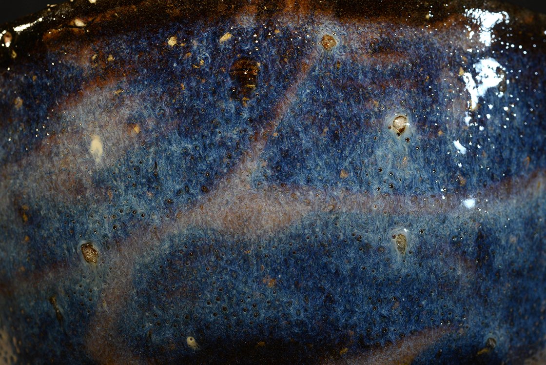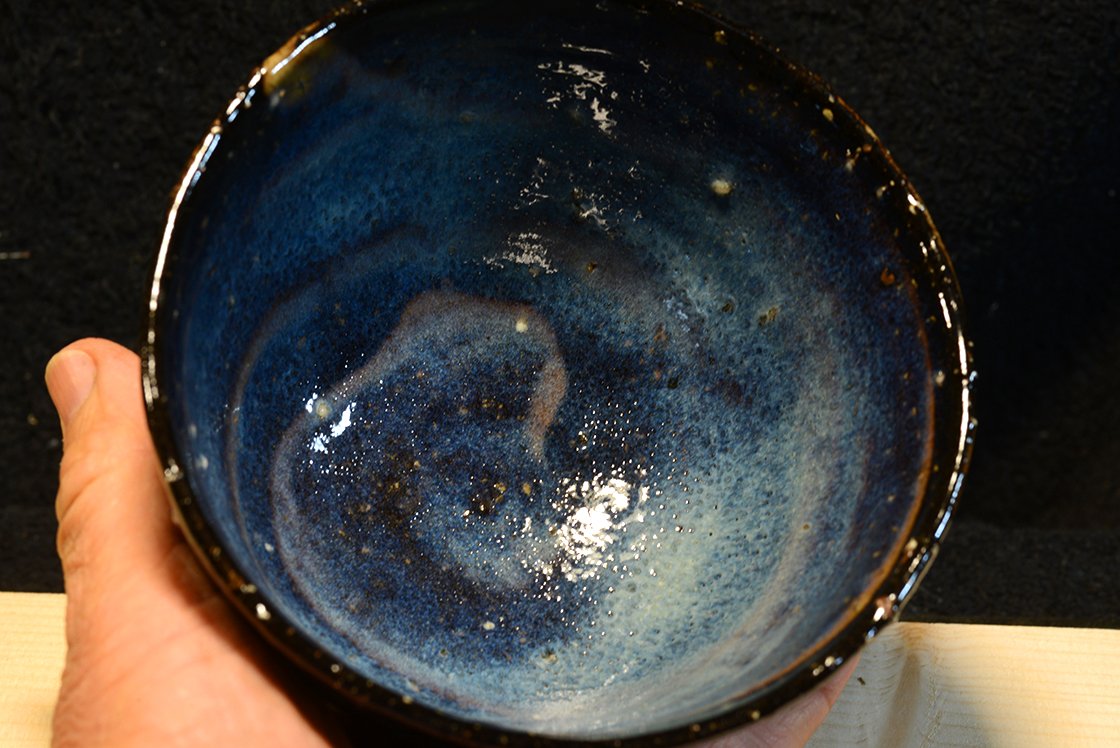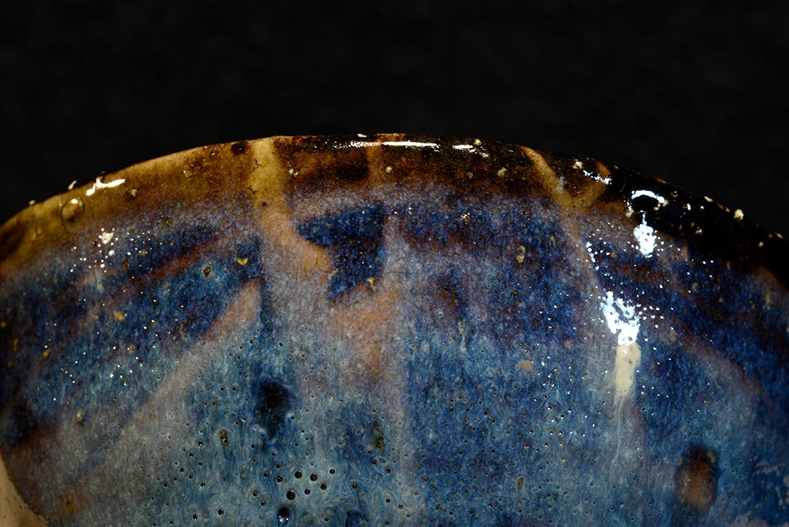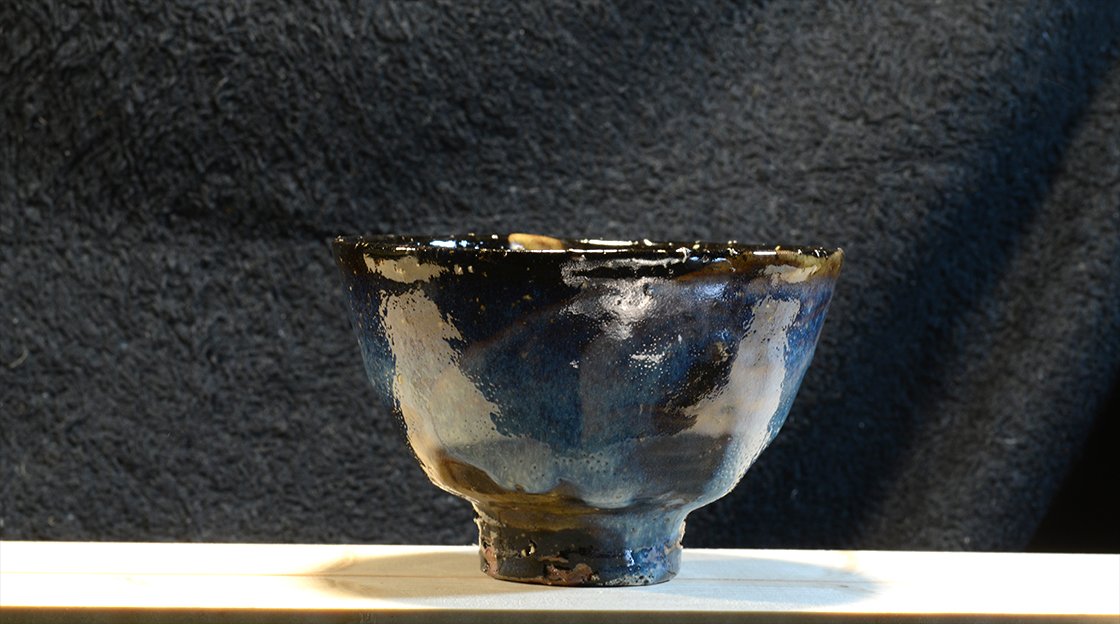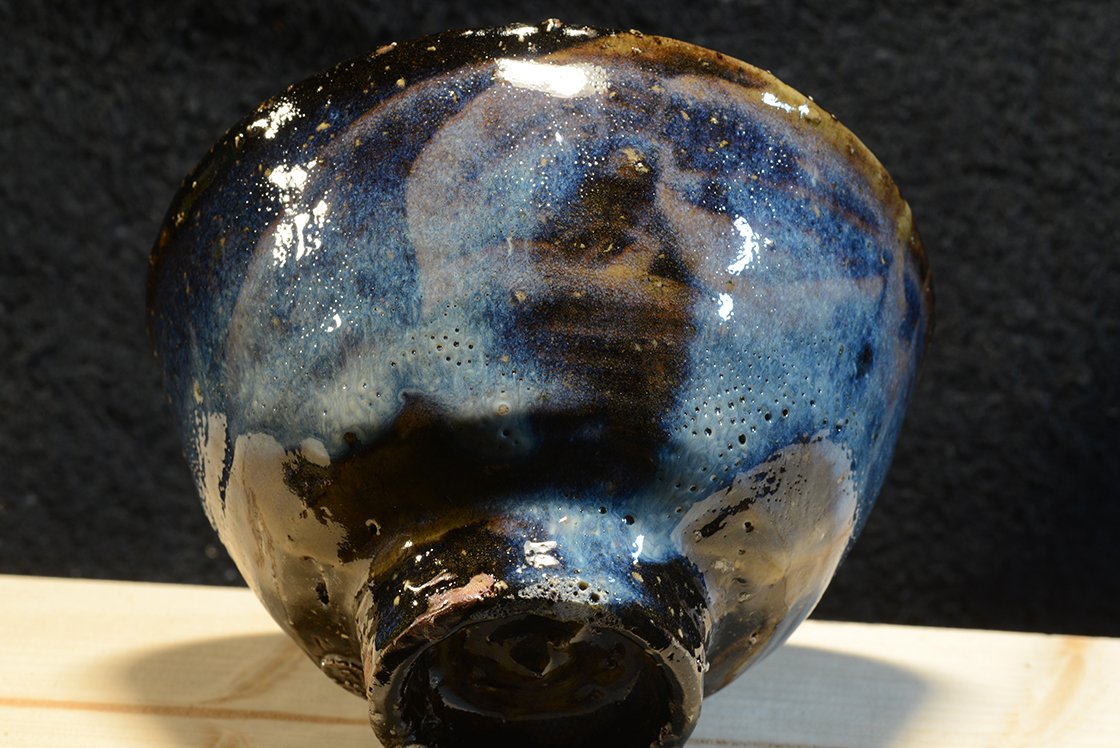 13,7 cm átmérőjű, 9 cm magas „seigan kék” Hagi chawan Yamane Seigan műhelyéből.