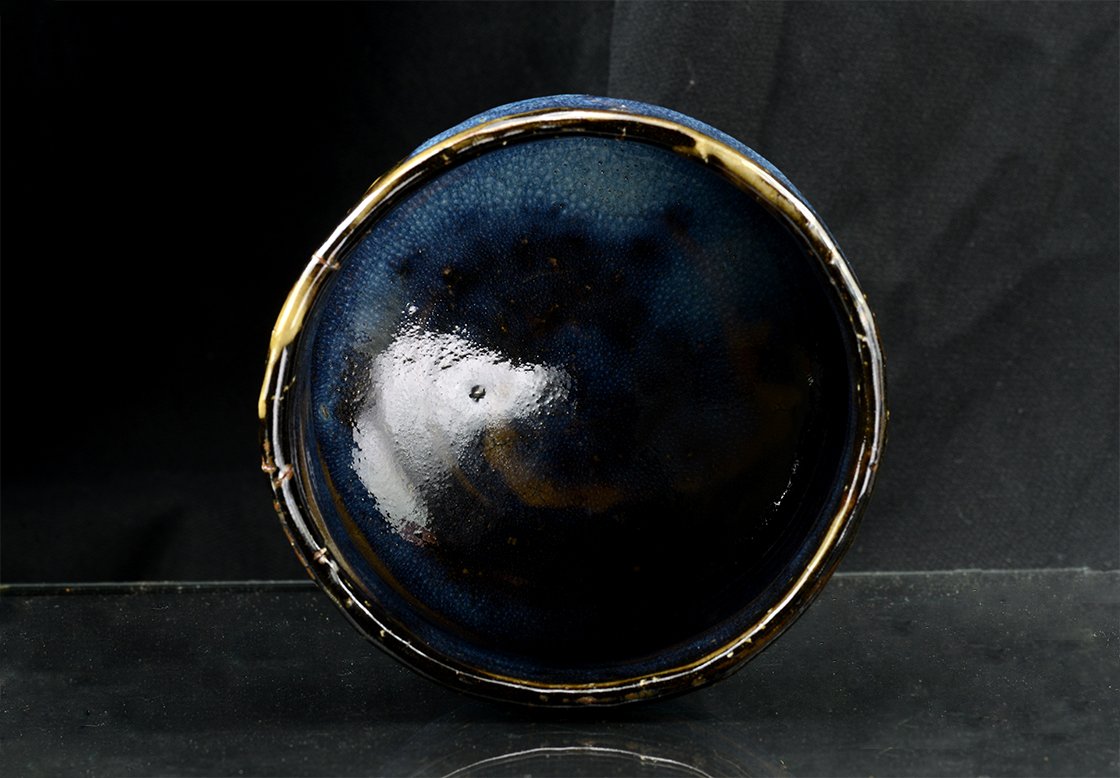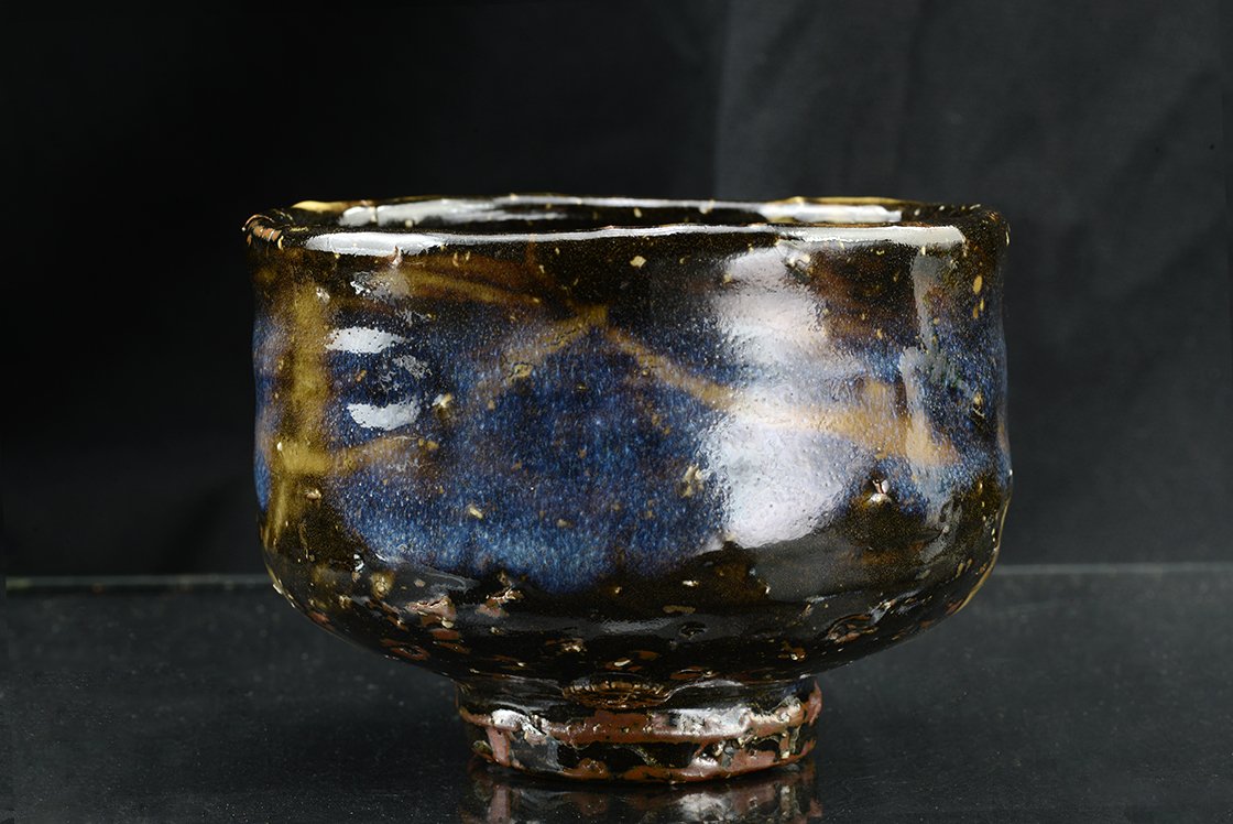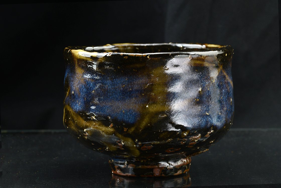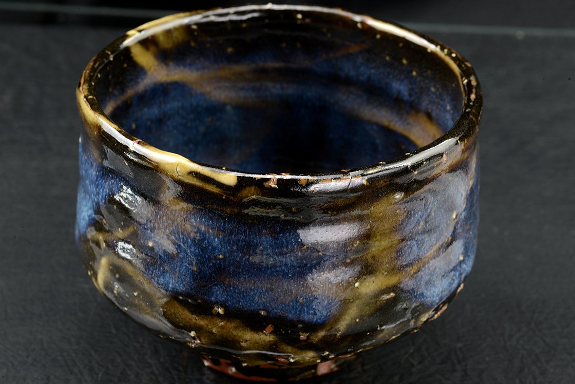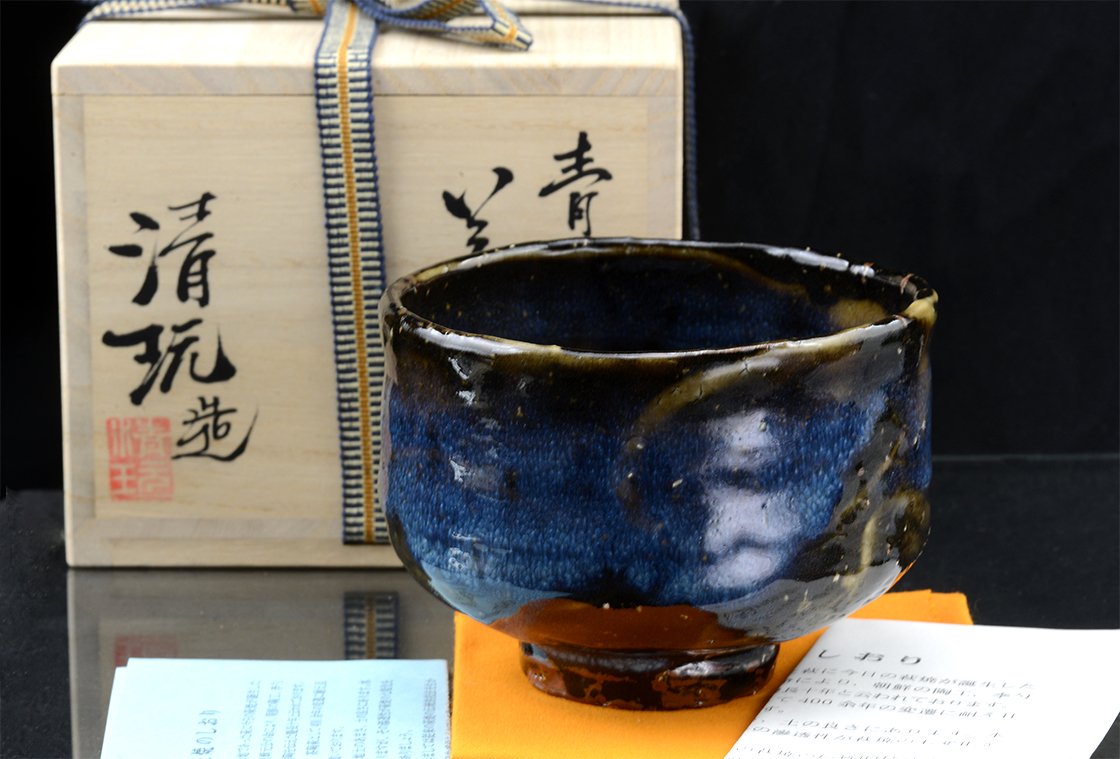 Yamane Seigan Ao hagi chawan teáscsésze, ami 13,8 cm átmérőjű, 9 cm magas.