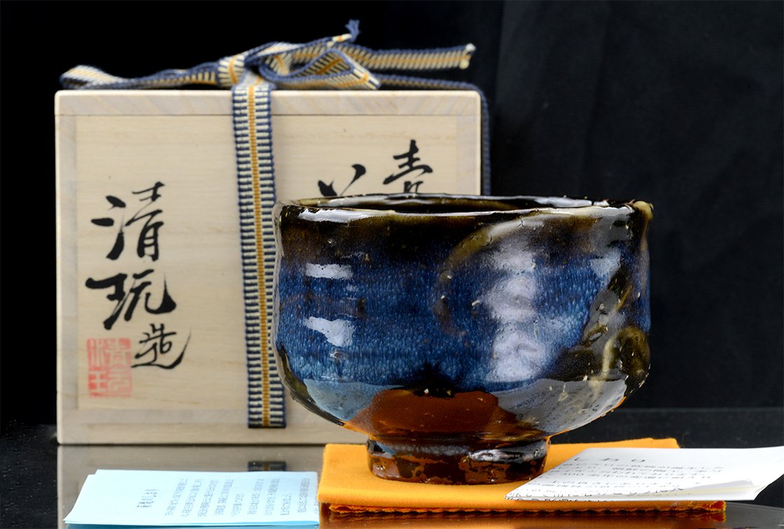 A Yamane Seigan 山根清玩 műhelyében készült csésze 13,5 cm átmérőjű, 9,5 cm magas, vágott, kereszttalpas, pecséttel és igazolással.