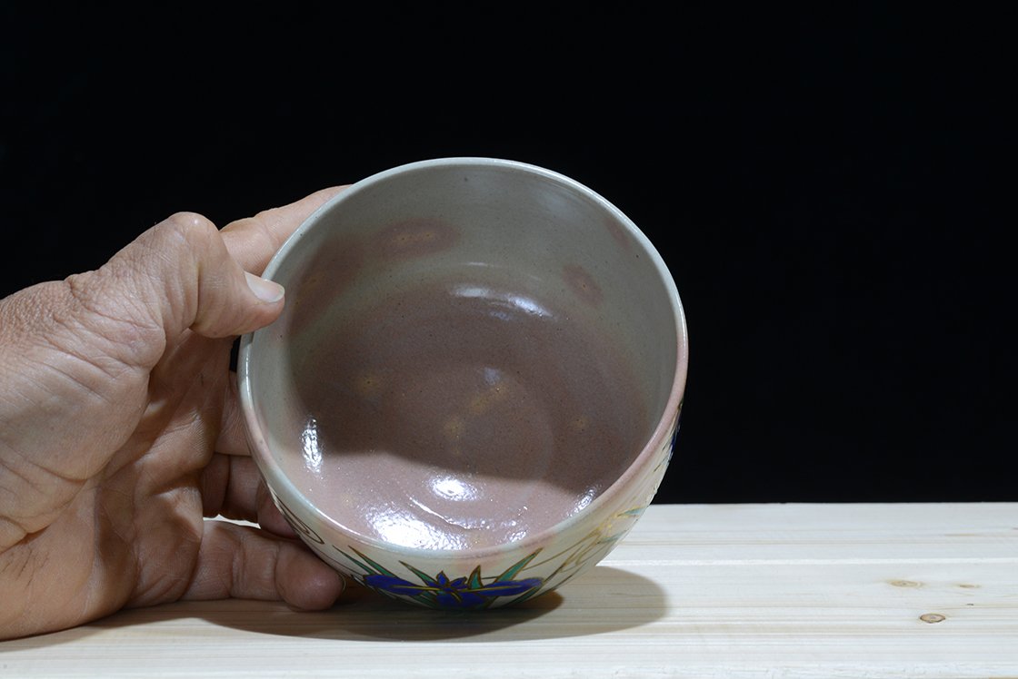 Ritka, kézzel festett Hagi teáscsésze Shozan Sakuma műhelyéből. Ő meglehetősen híres mesterember, aki a hivatalosan Urasenke Teaiskola által patronált, megbízott keramikus volt. A belül ún. őzsuta mintás égetés külön értéket jelent A csésze 12 cm átmérőjű, 7,5 cm magas.