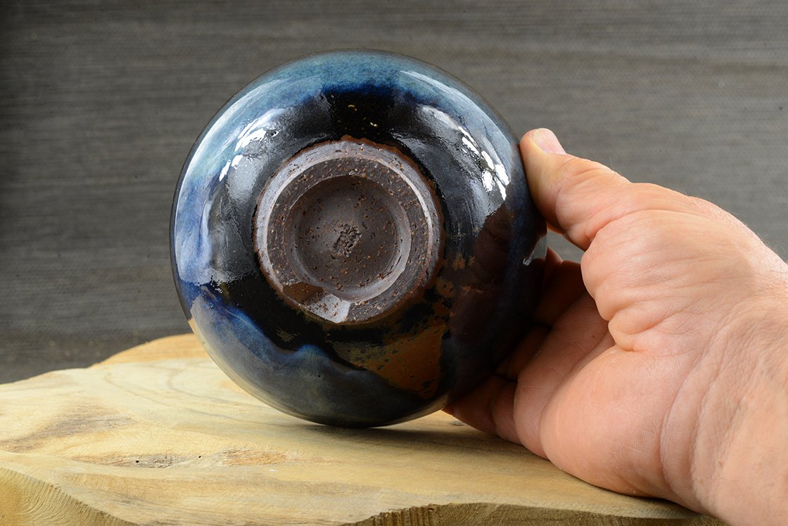 Yamane Seigan műhelyében készült kobaltkék Hagi teáscsészére, ami 12,5 cm átmérőjű, 7,2 cm magas. Különleges tónussal növeli a csésze érzetét és értékét a kék tengerben finoman ívelő világos fátyol.