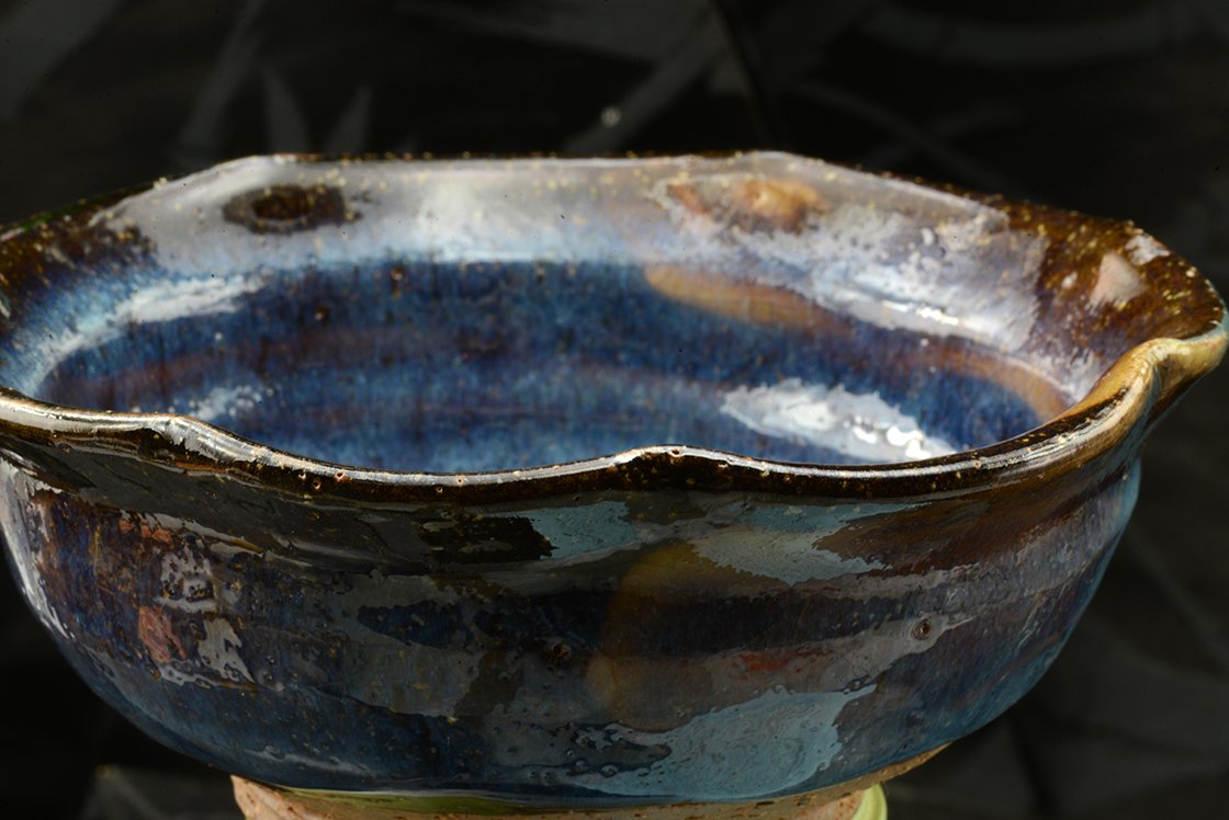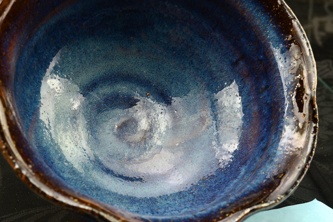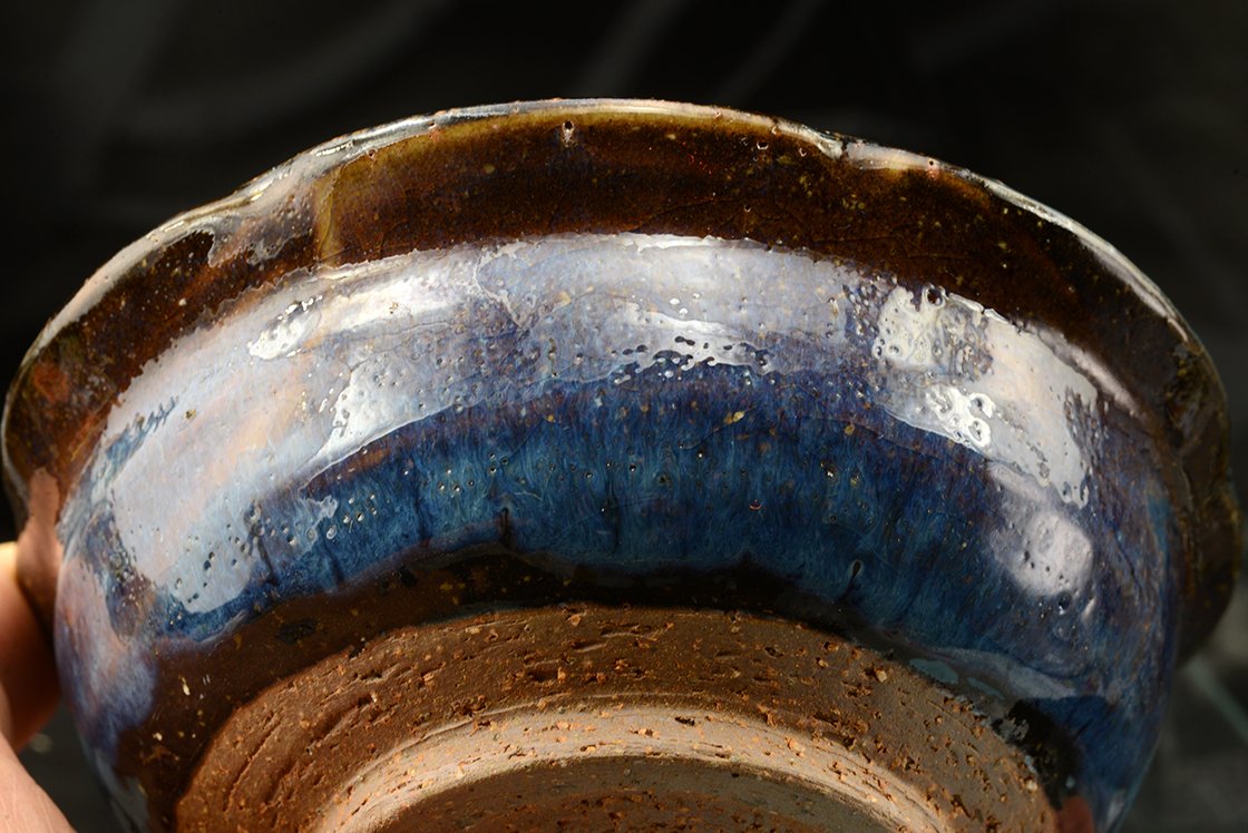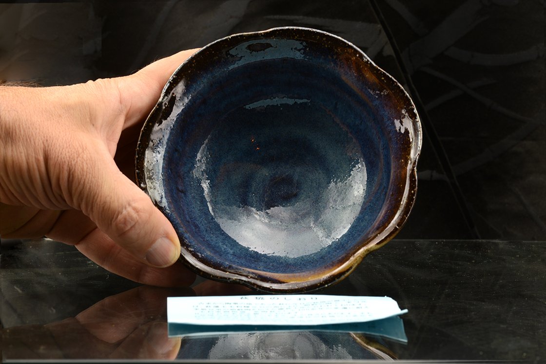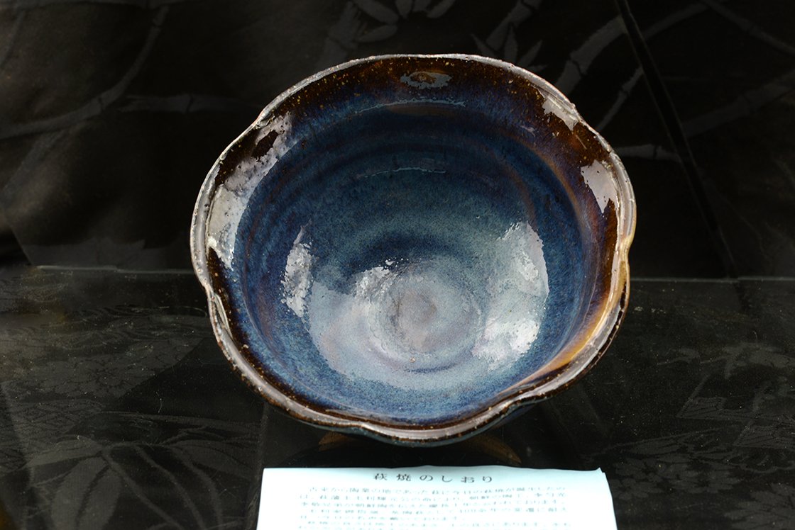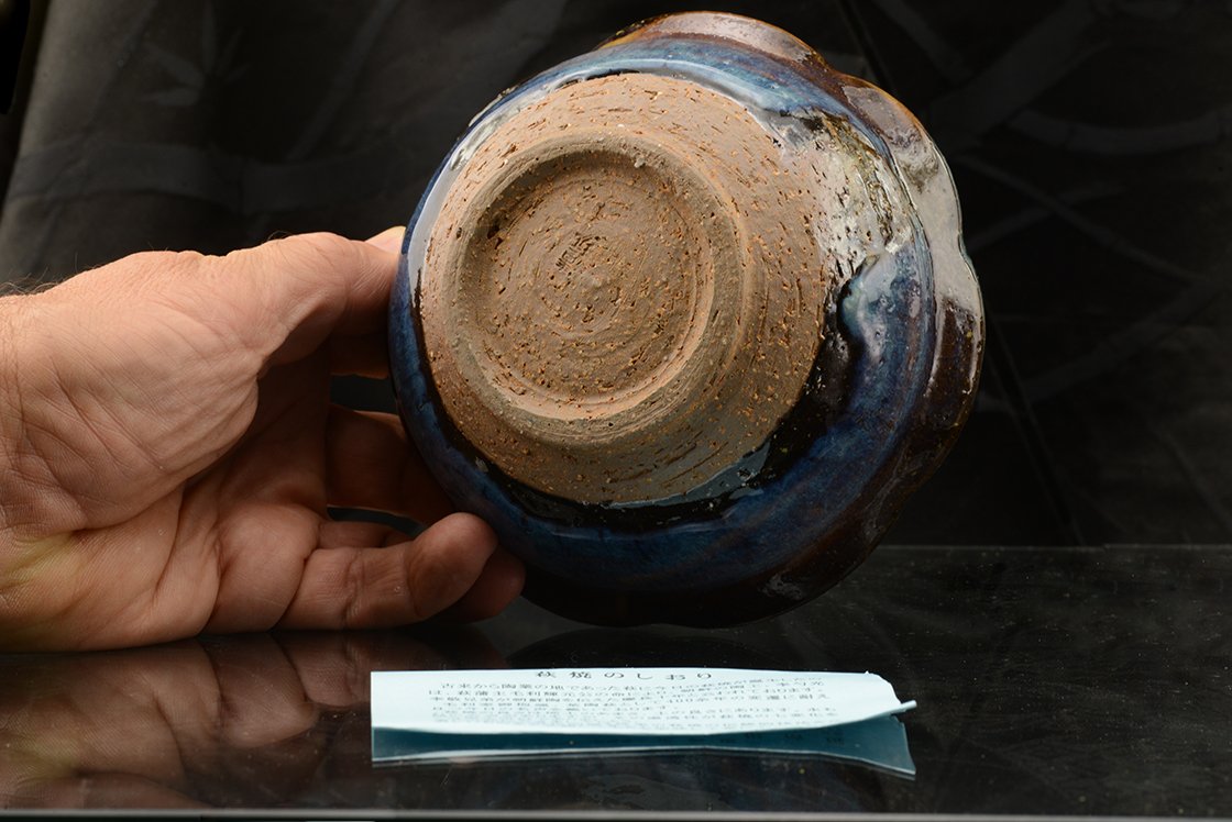 14,5 cm átmérőjű, 6 cm magas kék hagi chawan Yamane Seigan, a kobaltkék máz feltatlálójának műhelyéből és pecsétjével. A csésze a többihez képest nőiesebb, finomabb kék, felsejlő beige és rózsaszín árnyalatokkal.