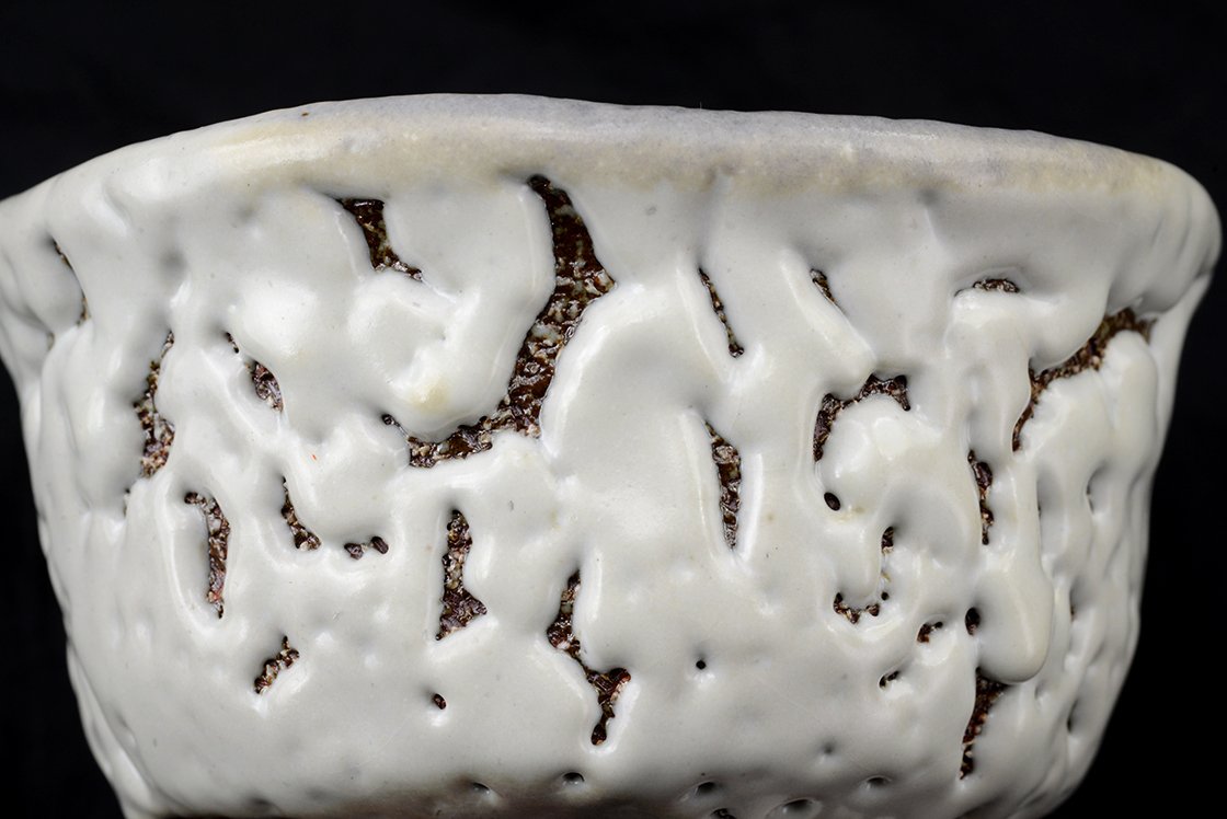 Gyönyörű Oni Hagi koudai chawan – fehér hagi japán teáscsésze vágott, vagy kereszt talppal, matca tea elkésztéséhez Yamane Seigan műhelyéből. A csésze átmérője 12,8-13,3 cm, magassága 10 cm. Keresztezett talpán a mester pecsétje. Gondosan csomagolva, de díszdoboz nélkül szállítjuk.