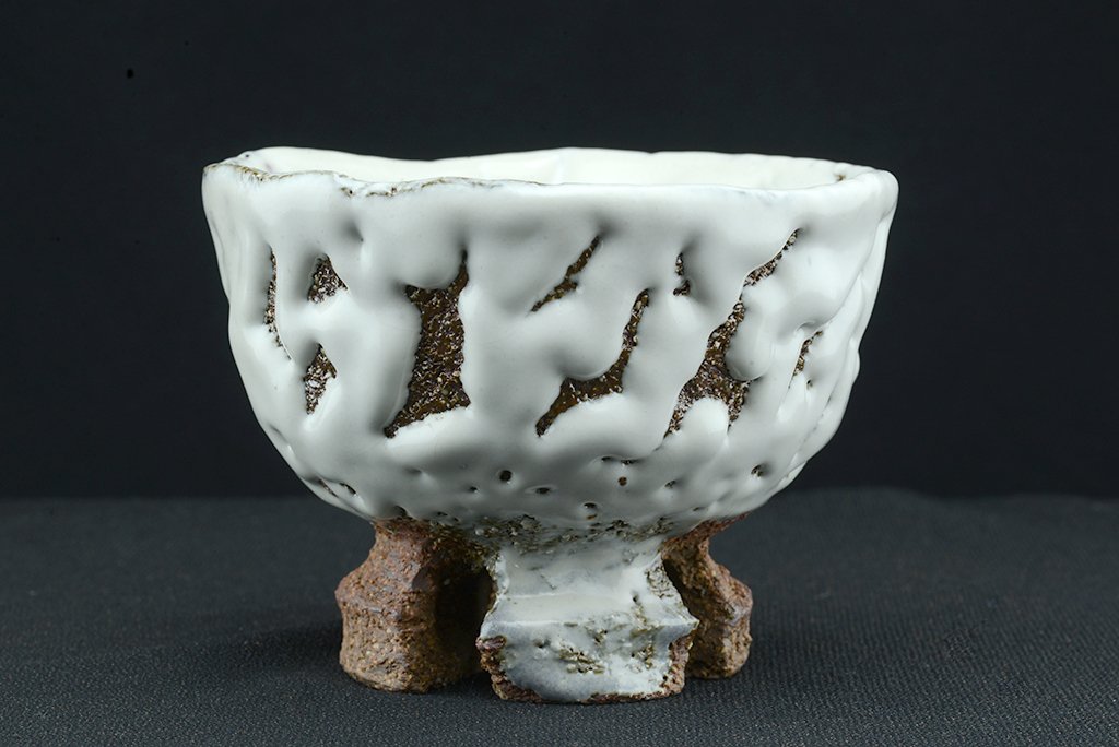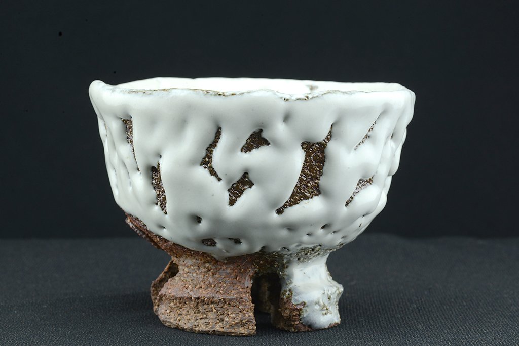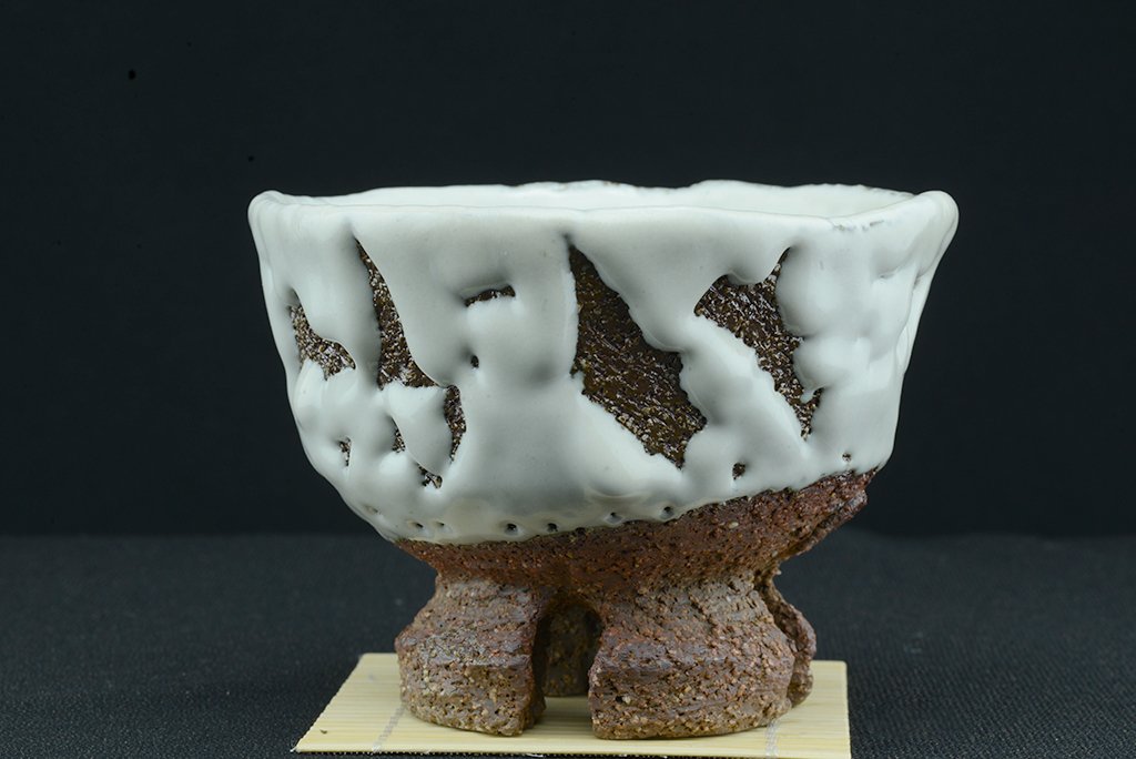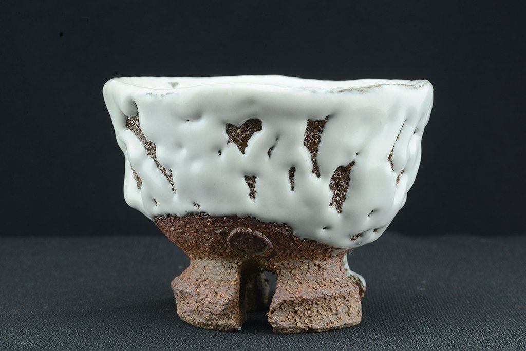 Yamane Seigan műhelyében készült, Seigan pecsétjével ellátott nagyszerű, fatüzelésű kemencében égetett fehér Hagi (Oni Hagi) chawan keresztezett talpakkal. A csésze átmérője 13,3 cm, magassága 10 cm. A fatüzelésű azért fontos, mert ez a fajta ún. hamu máz létrejöttében jelentős szerepe van a fából keletkező és a légáramlatok által felkapott izzó hamunak.
