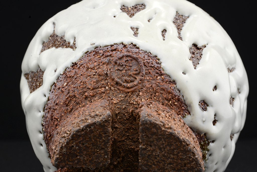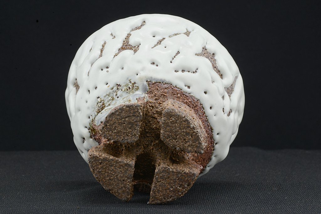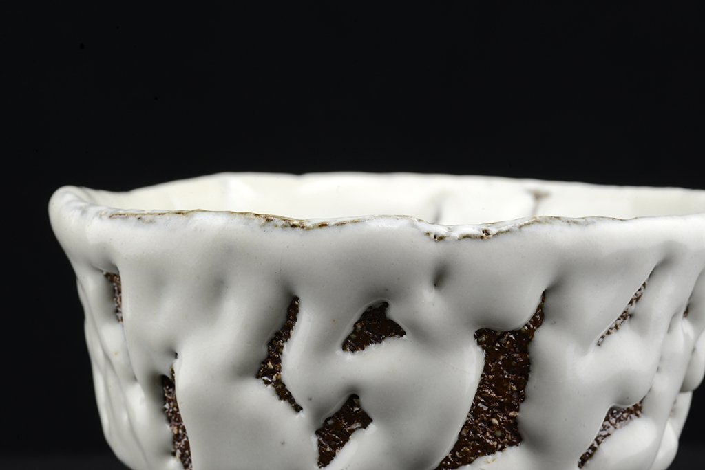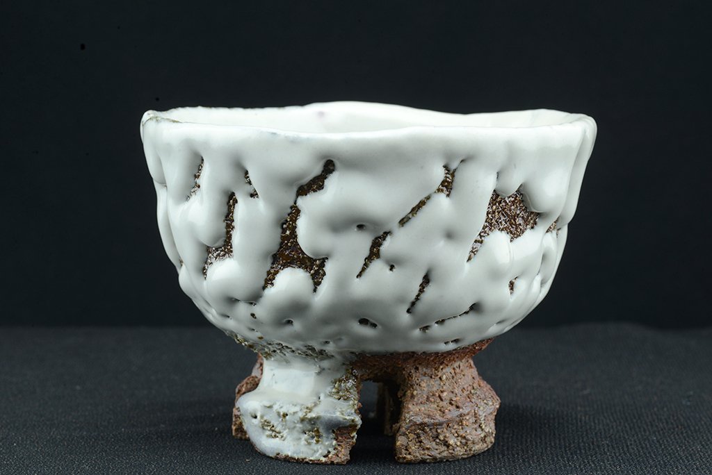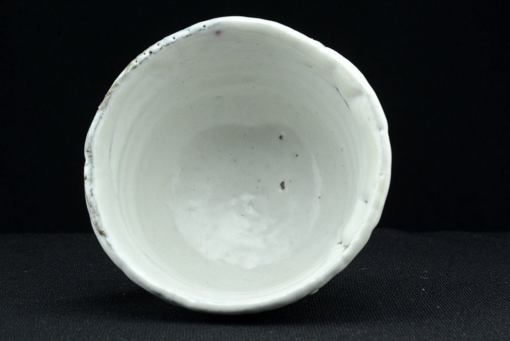 Yamane Seigan műhelyében készült, Seigan pecsétjével ellátott nagyszerű, fatüzelésű kemencében égetett fehér Hagi (Oni Hagi) chawan keresztezett talpakkal. A csésze átmérője 13,3 cm, magassága 10 cm. A fatüzelésű azért fontos, mert ez a fajta ún. hamu máz létrejöttében jelentős szerepe van a fából keletkező és a légáramlatok által felkapott izzó hamunak.