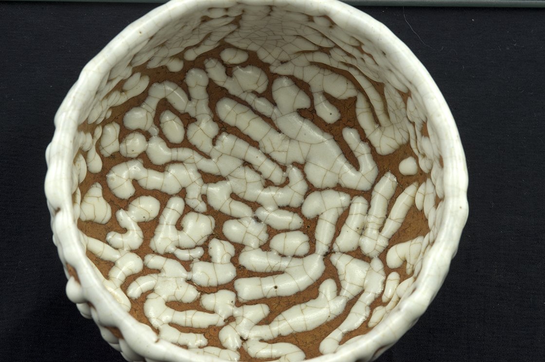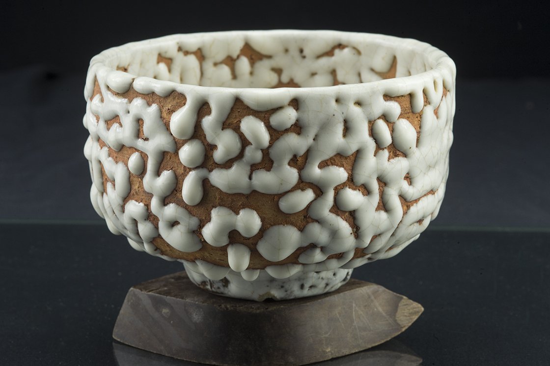 Az itt látható hagi chawan Eisen Watanabe műhelyében készült, aki a Hagi mellett más stílusokban is otthonosan mozog. A csésze enyhe rószaszín elszíneződése a mázba kevert hamu eredménye, részben véletlenszerűen, az égetési viszonyoktól függően alakul ki, és emeli a tárgy értékét.