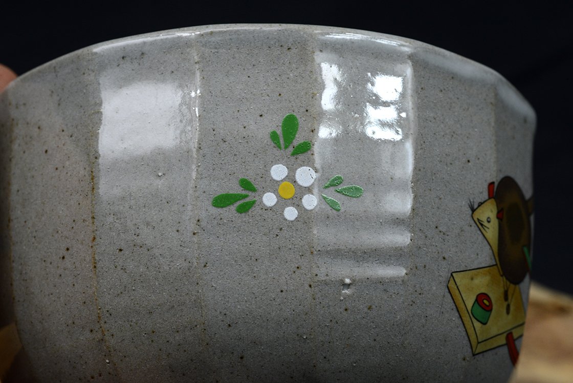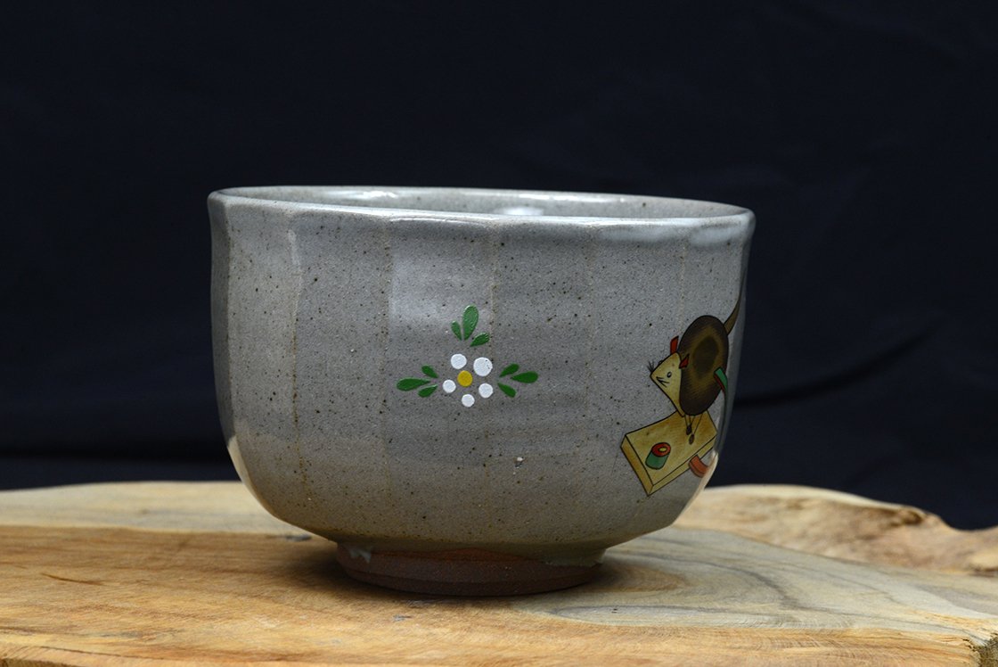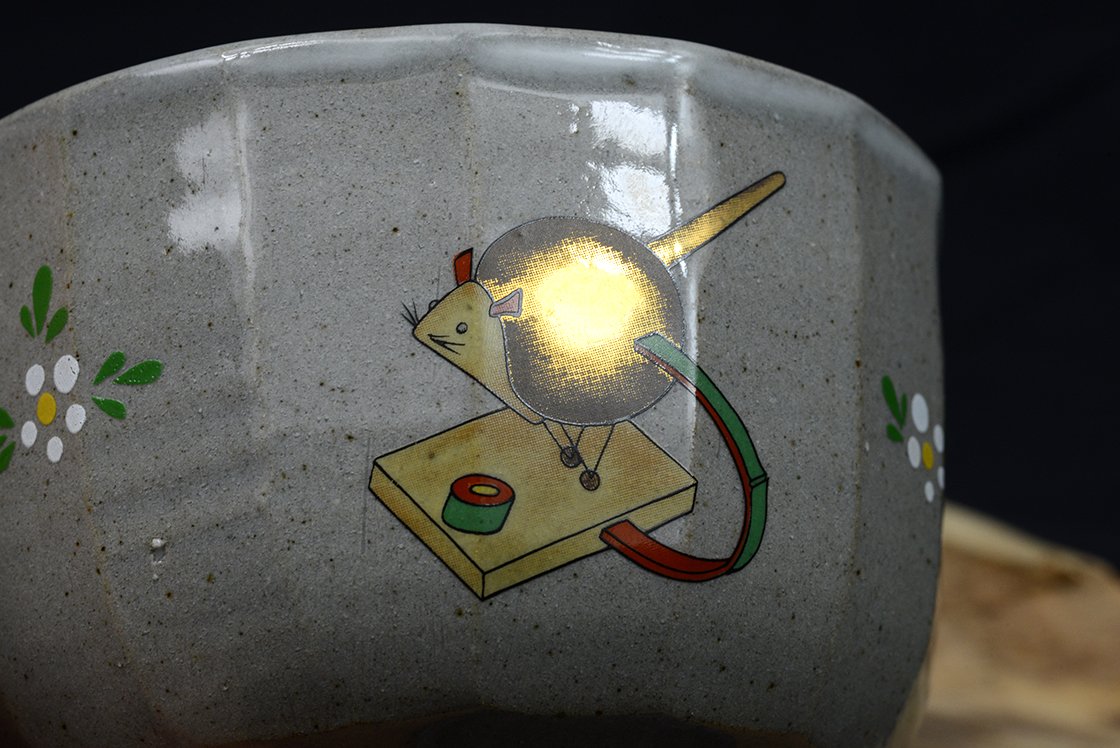 Ez a csészéje finom humorral készített mázas, matricázott és festett chawan, ami azt a zen megvilágosodás közbeni pillanatot ábrázolja, amikor az egér már benne van az egérfogóban, de még nem érintette meg a csalit. Még minden megtörténhet és mégsem, már minden megtörtént.A komoly fadobozban lakó komoly, pontos csészéhez tréfás törlőkendő jár.
