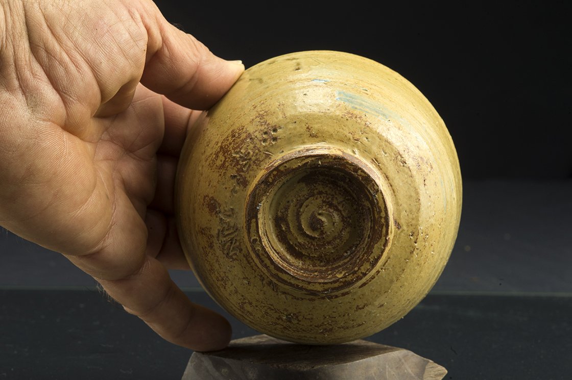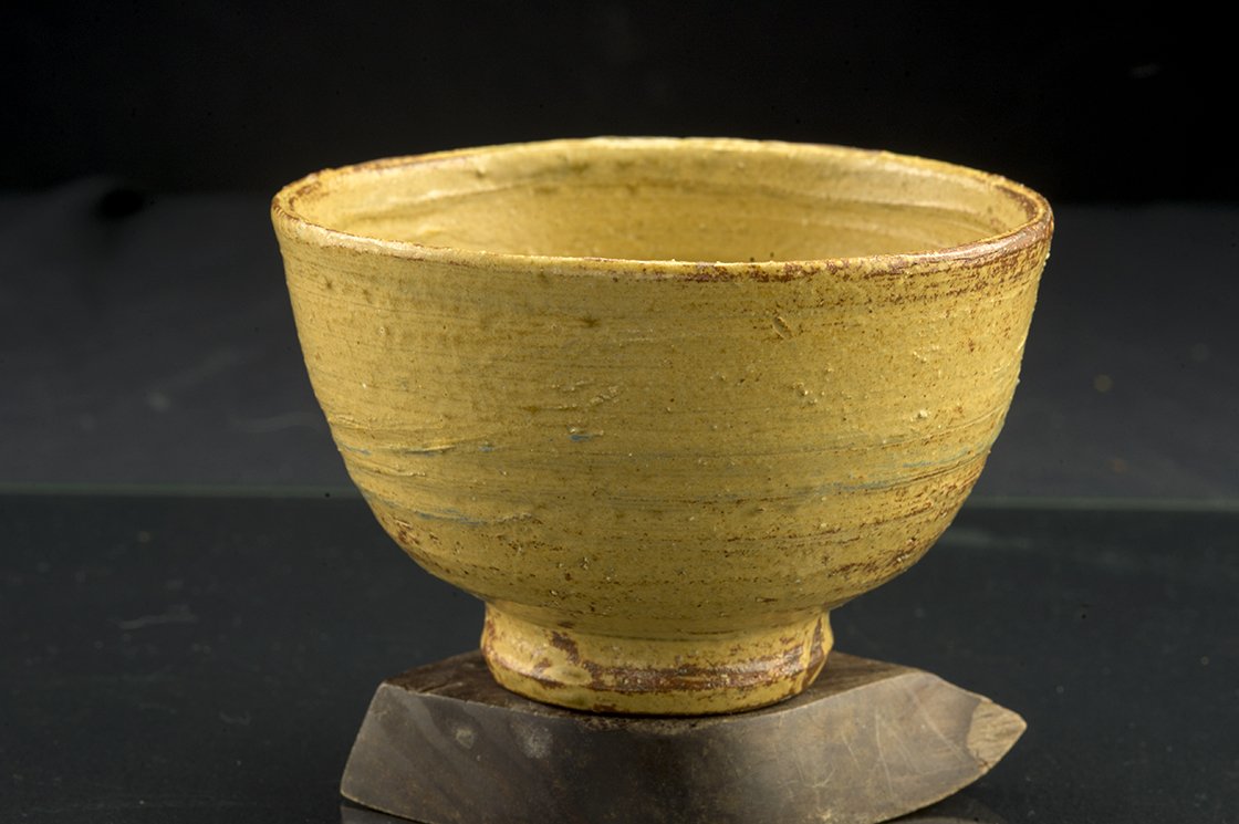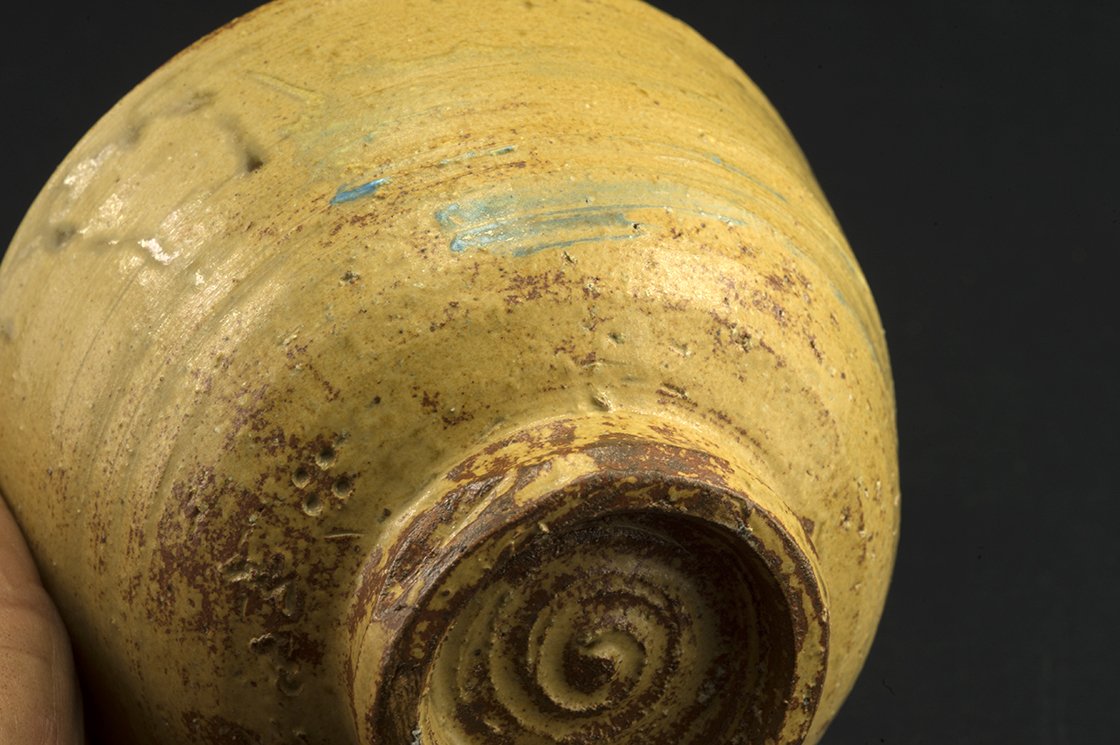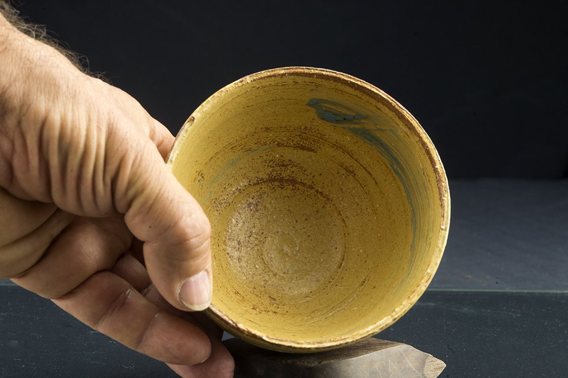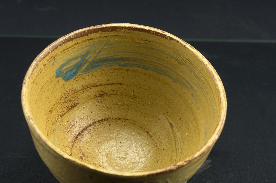 A csésze vasas sárga mázára egy-két ecsetvonásnyi, érintőleges minta kerül, kék, vagy zöld mázzal.