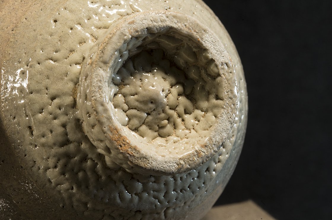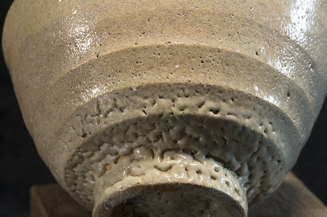 A csésze 14 cm átmérőjű, 8,2 cm magas igazi tágas, IDO chawan SEO SEON GIL (1937-) koreai keramikus műhelyéből.
