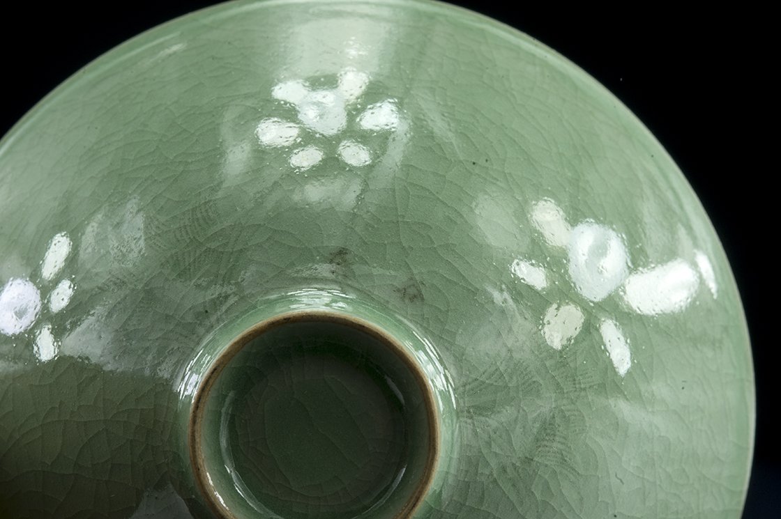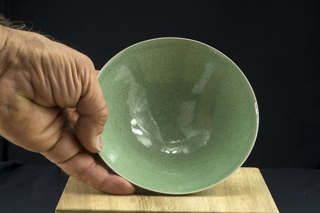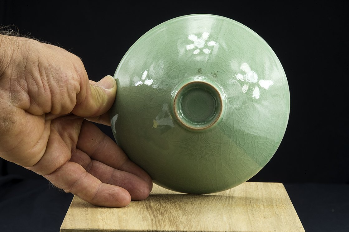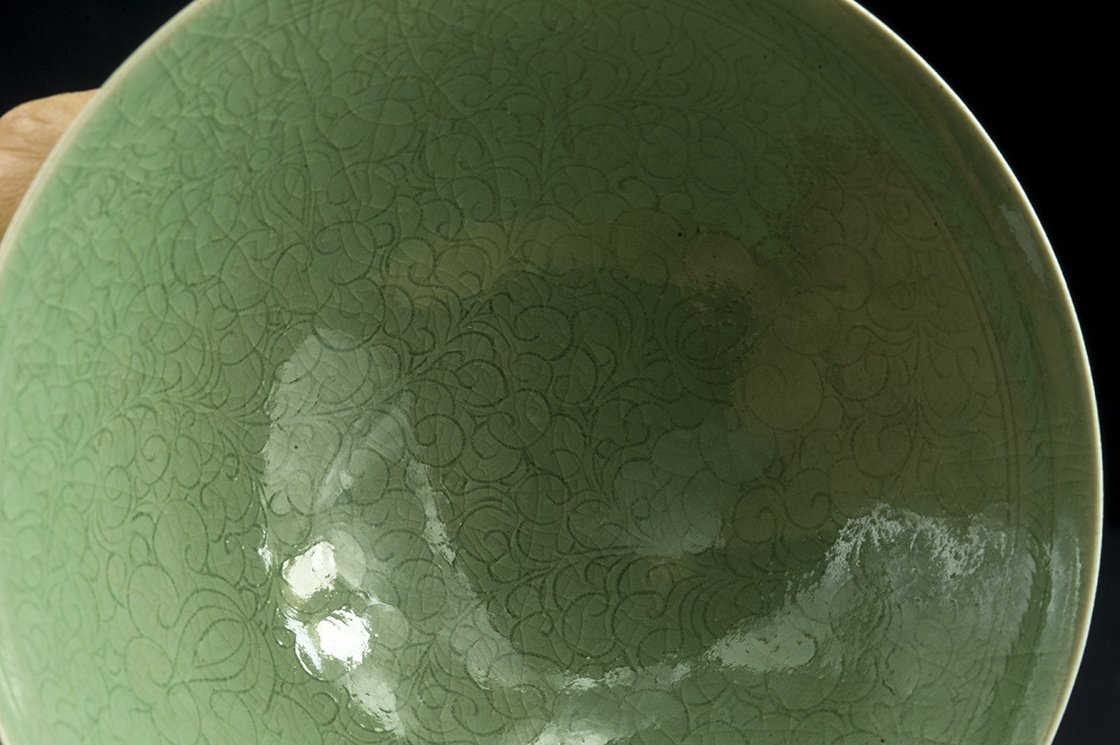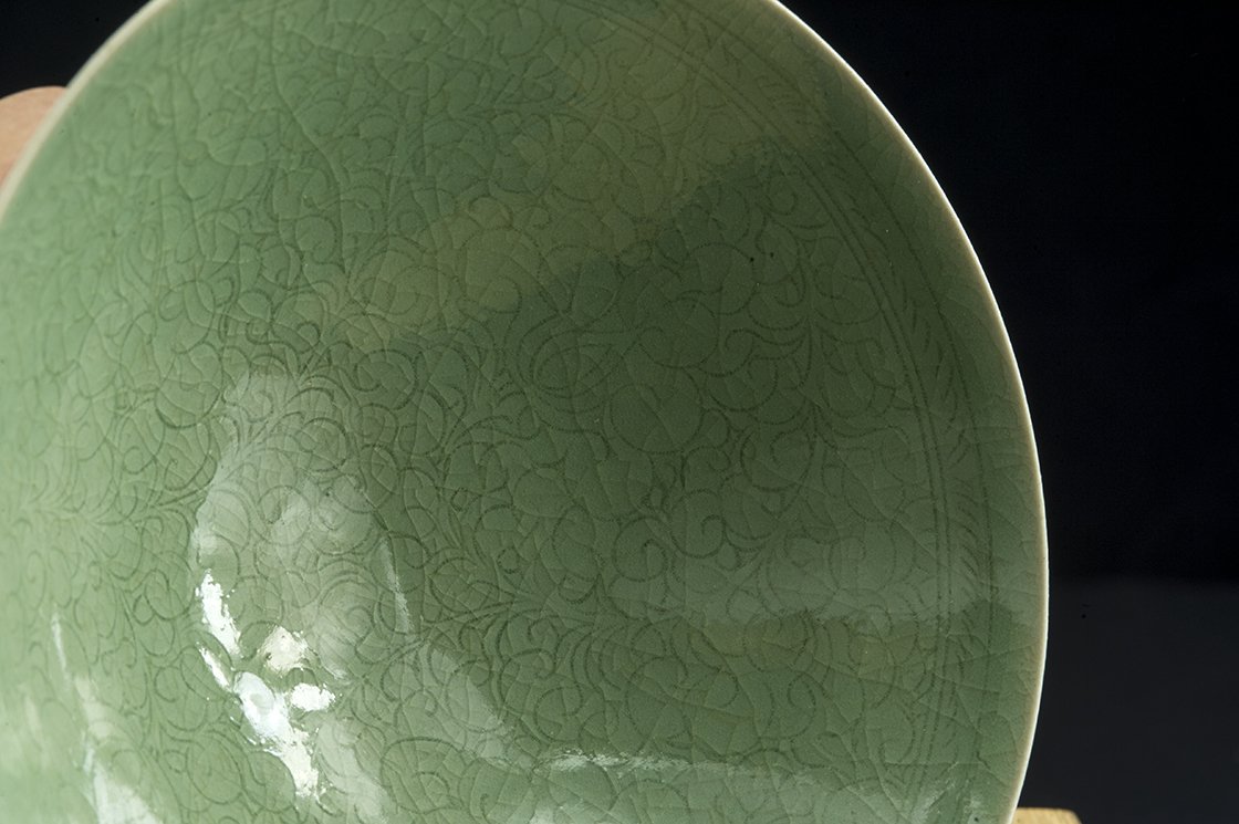 A csésze pont olyan finom és könnyed, mint az egymásba boruló éteri felhőminták a felszínén.  A koreai celadon díszítése nagyrészt ugyanazokat a mintákat követi, a fényes máz alatt festett minták úgy tűnnek, mintha mélyen a felszín alatt történne minden.