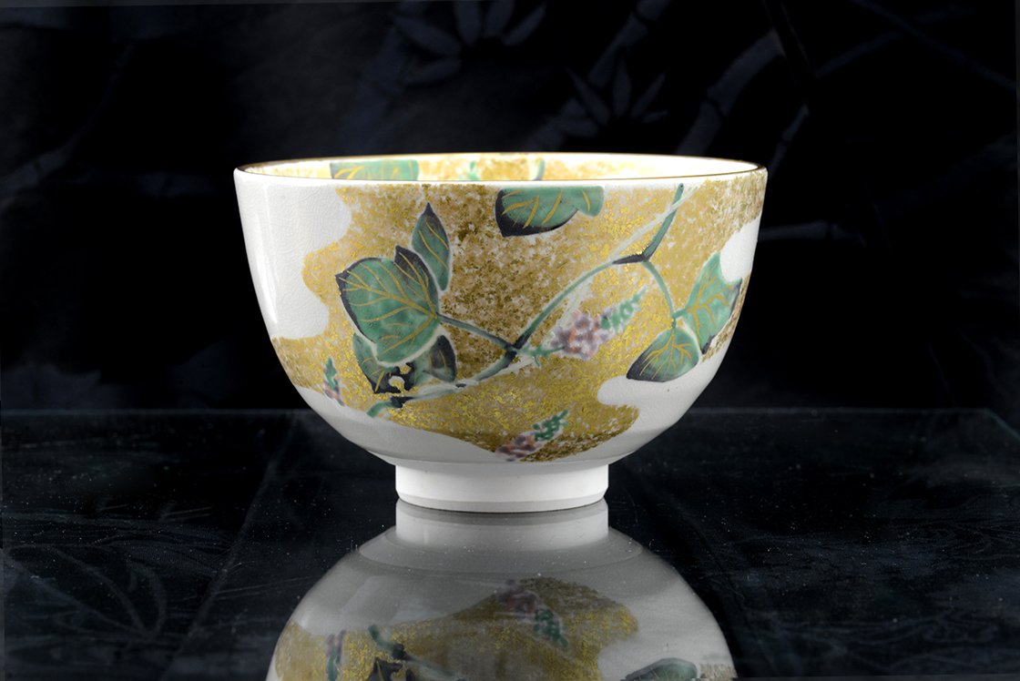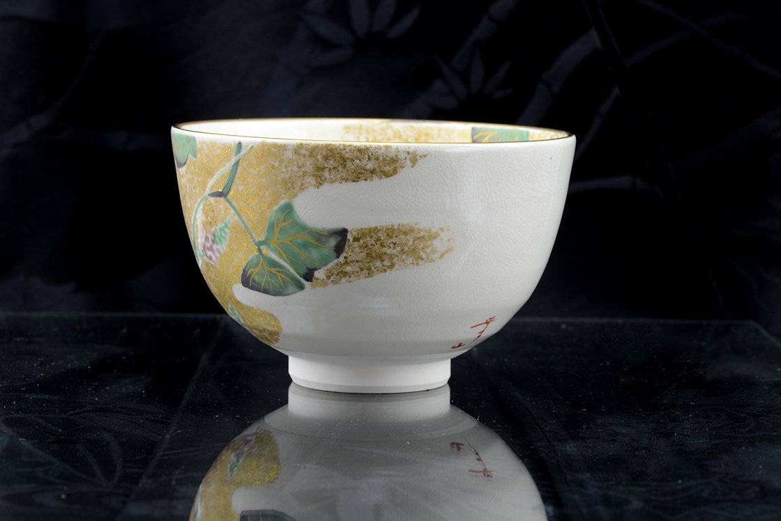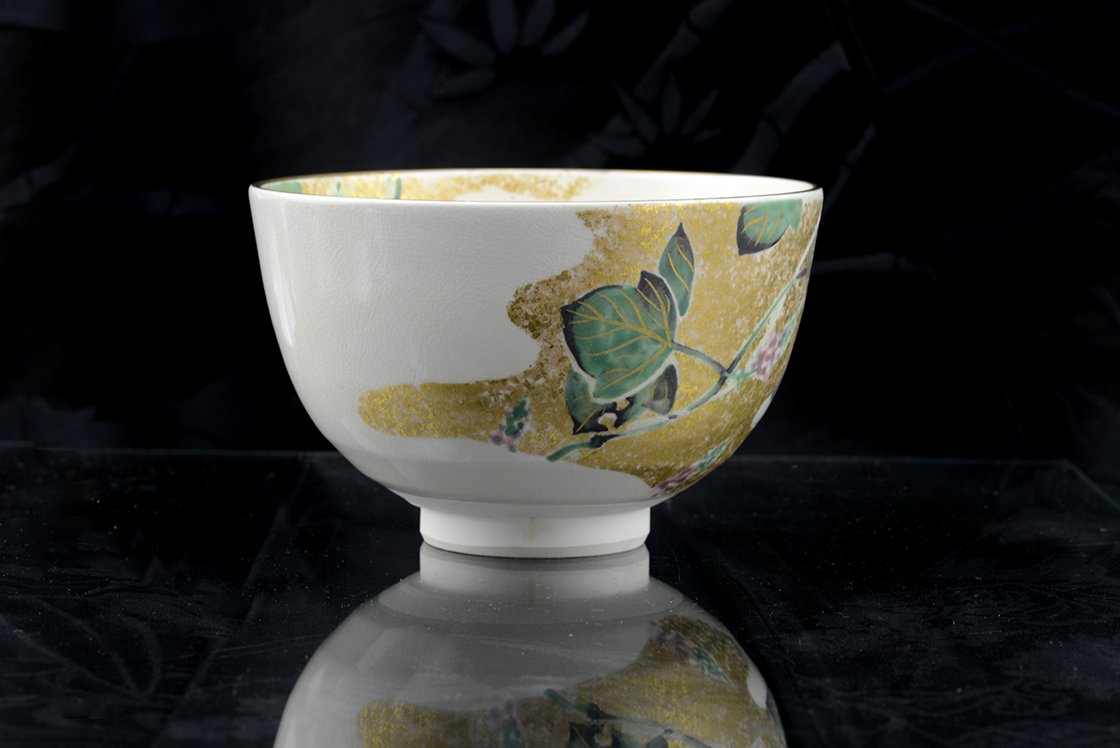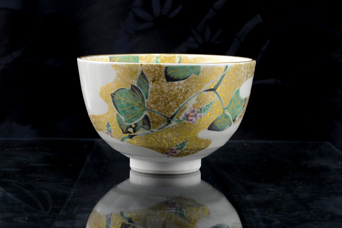 12,3 cm átmérőjű, 7,1 cm magas, arannyal és kézzel festett matcha teáscsésze, Kozan Yamazaki műhelyéből. A kisszámú Kutani kerámiaműhely a kyotói képes festészetet fejlesztette tovább a XVIII. században és hozott létre a nemes-harcos-szamuráj kultúra díszeként és melléktermékeként aranyos, színpompásan díszített stílust. Kora modern kori válsága után a Kutani ma nagyon is élő, díszes és csillogó, nagyon színes, időnként aranyozott.