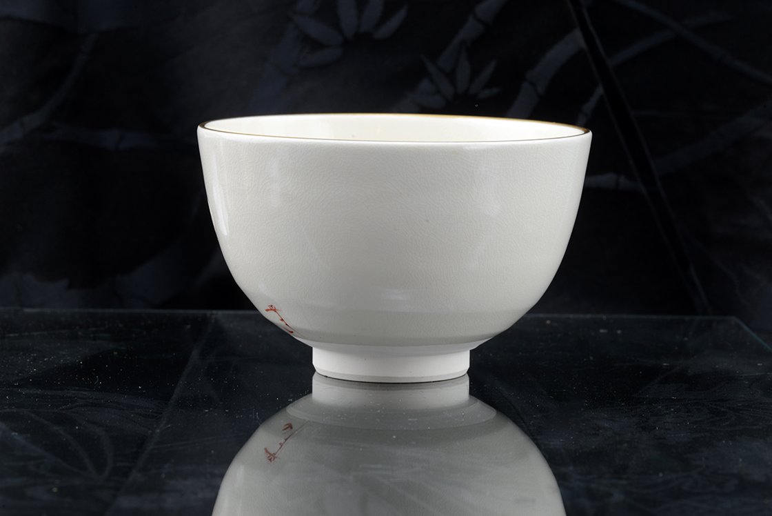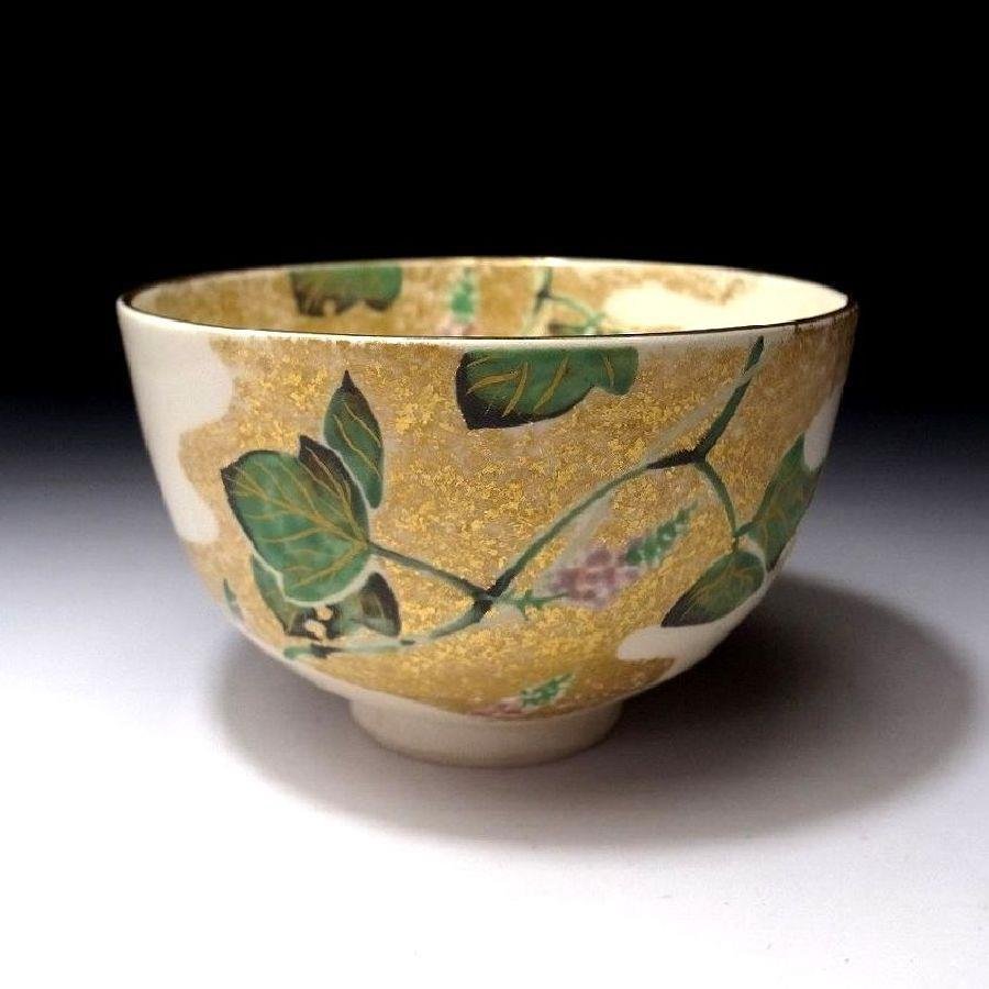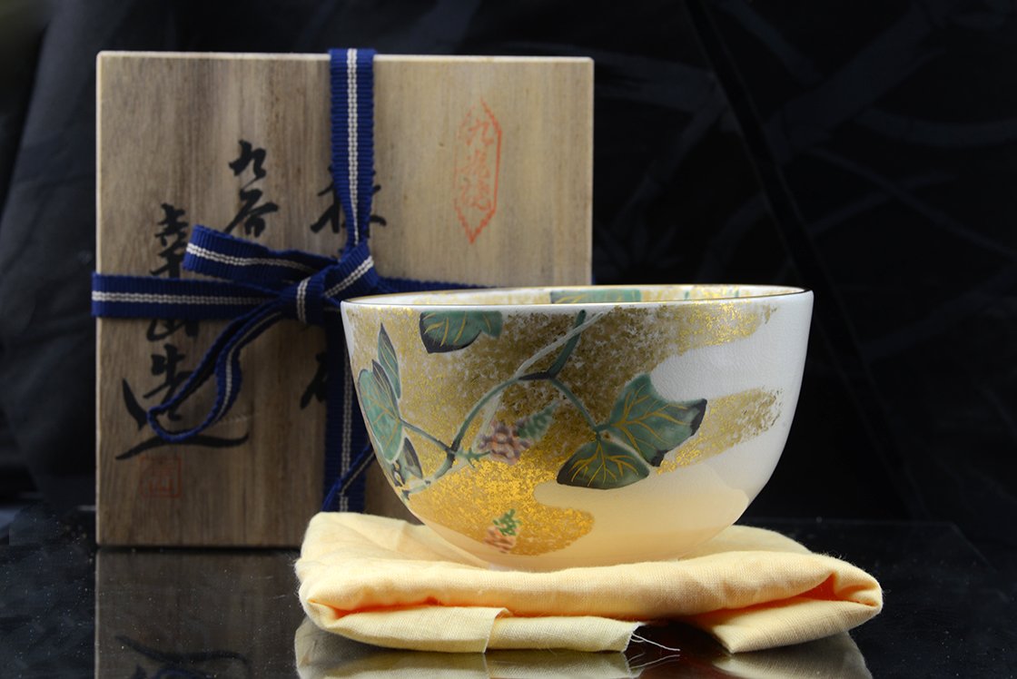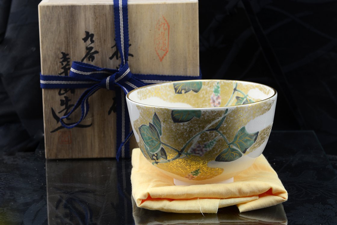 12,3 cm átmérőjű, 7,1 cm magas, arannyal és kézzel festett matcha teáscsésze, Kozan Yamazaki műhelyéből. A kisszámú Kutani kerámiaműhely a kyotói képes festészetet fejlesztette tovább a XVIII. században és hozott létre a nemes-harcos-szamuráj kultúra díszeként és melléktermékeként aranyos, színpompásan díszített stílust. Kora modern kori válsága után a Kutani ma nagyon is élő, díszes és csillogó, nagyon színes, időnként aranyozott.