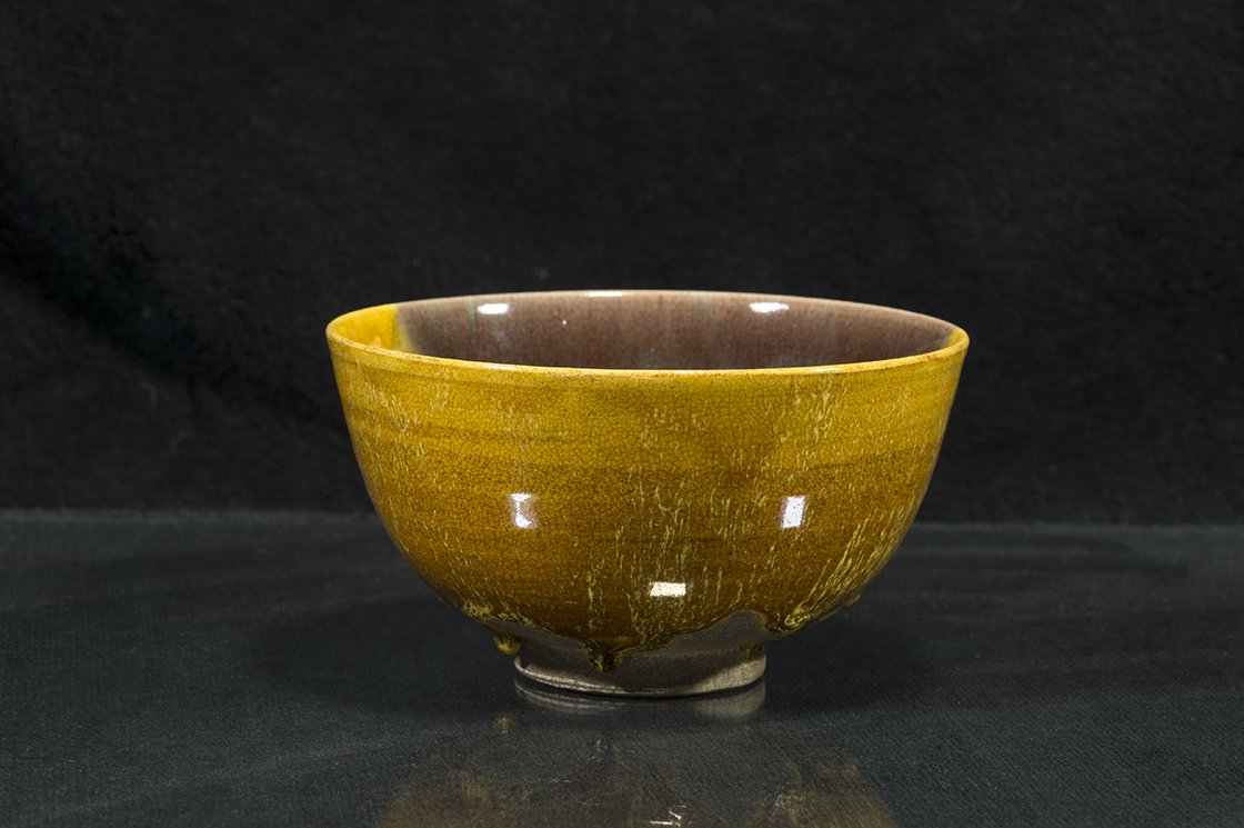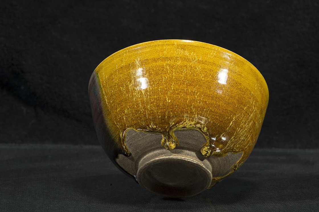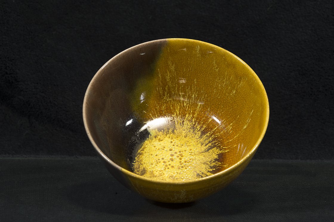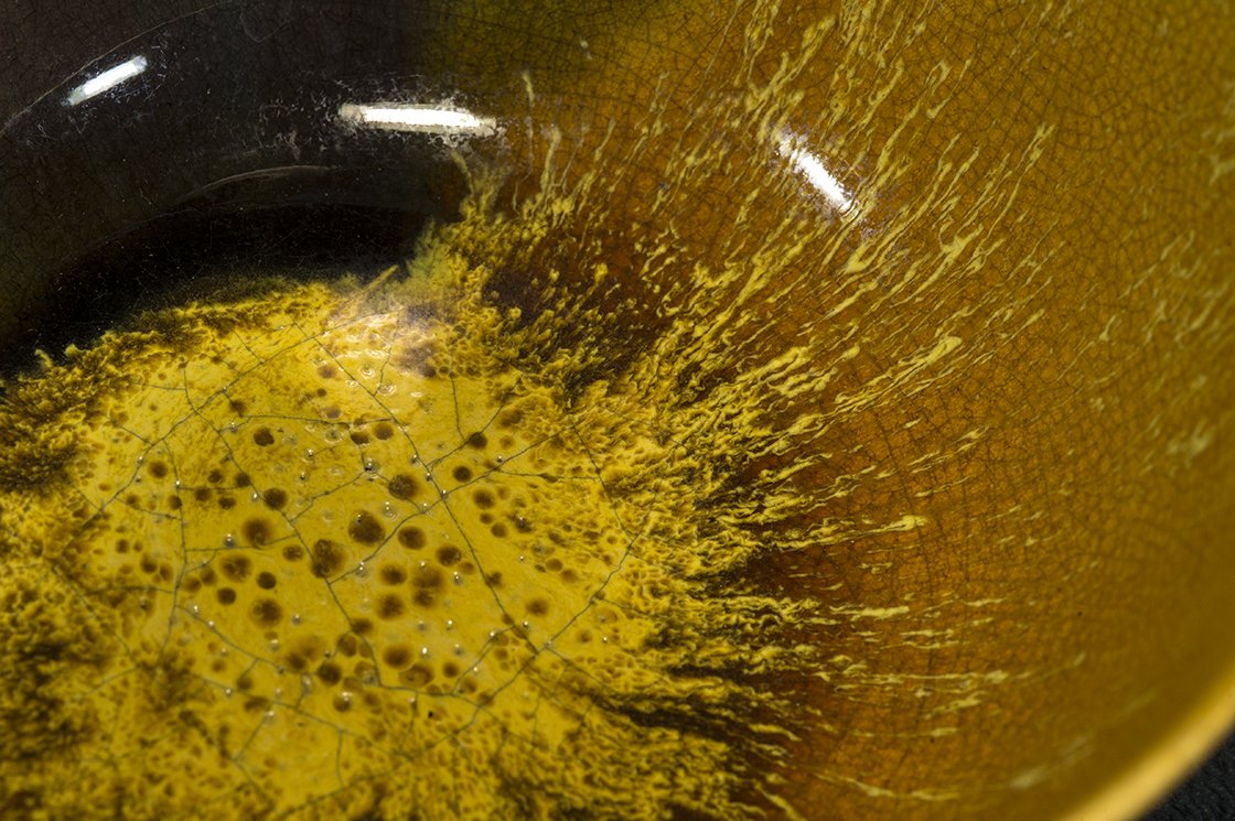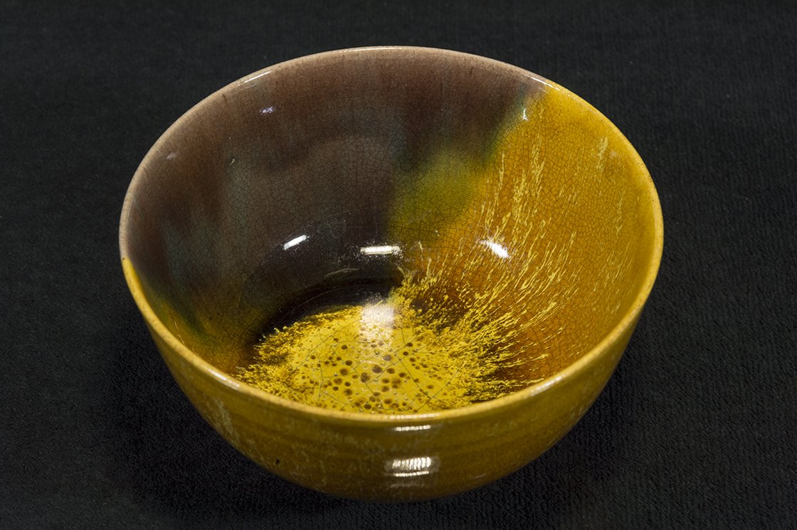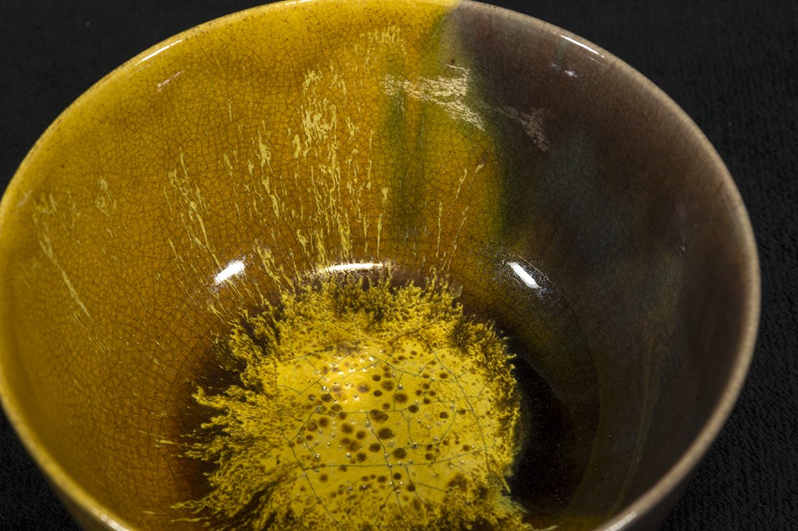 Borostyánsárga lángokkal ég a tűz a kutani máz fénye alatt. A csésze bőséges, 13,5 cm átmérőjű, 7,3 cm magas és az aranyosságát kiemelő kontraszttal egy fekete dobozban lakik.