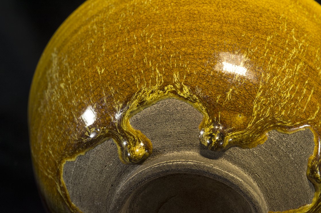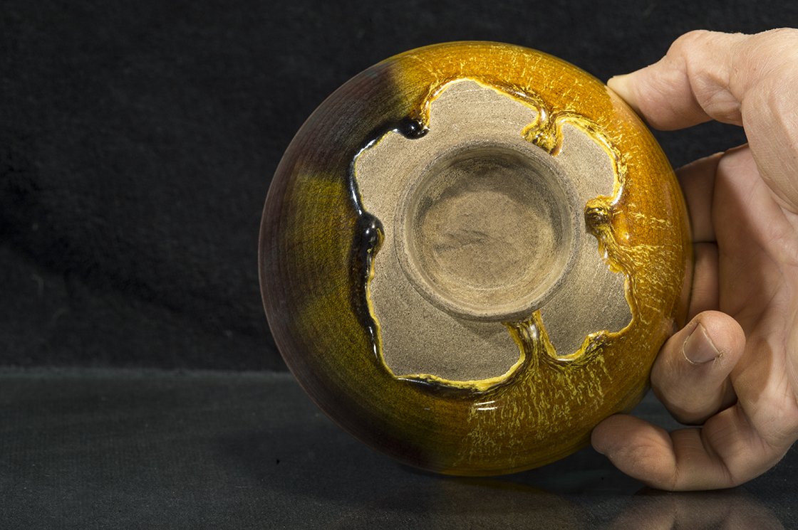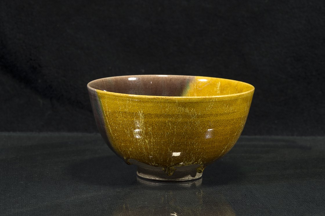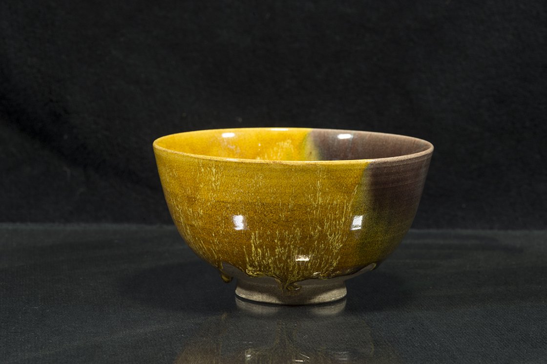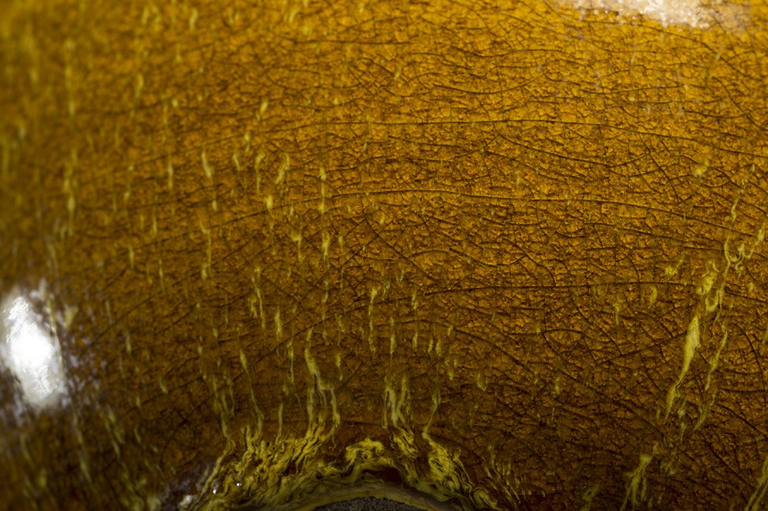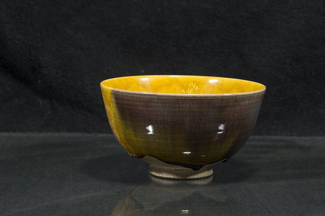 Borostyánsárga lángokkal ég a tűz a kutani máz fénye alatt. A csésze bőséges, 13,5 cm átmérőjű, 7,3 cm magas és az aranyosságát kiemelő kontraszttal egy fekete dobozban lakik.