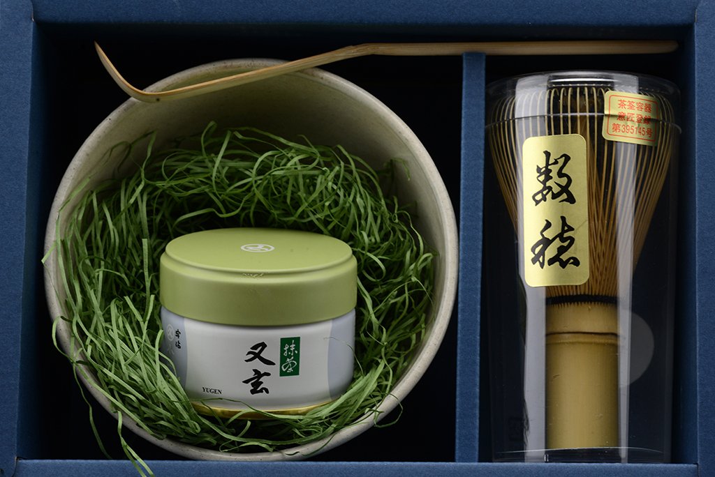 Matcha készlet Marukyu-Koyamaentől, ami a következőket tartalmazza: