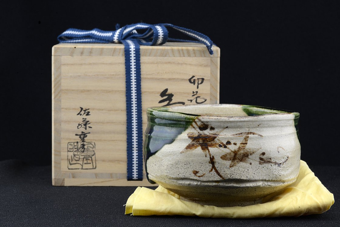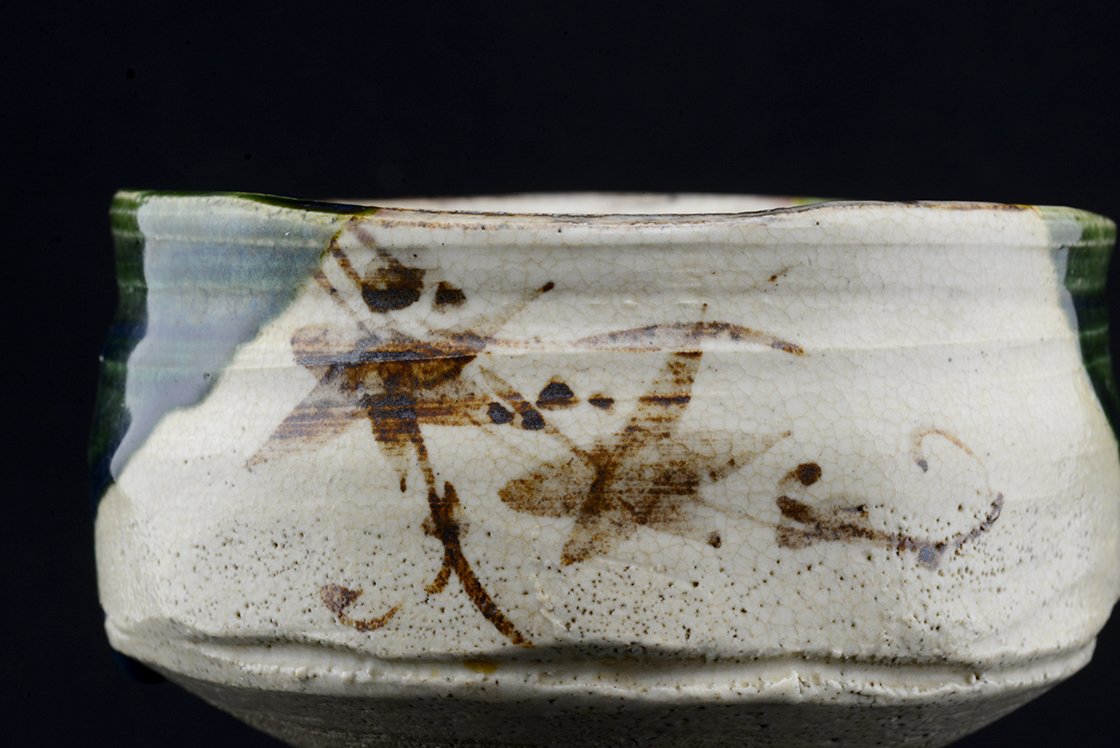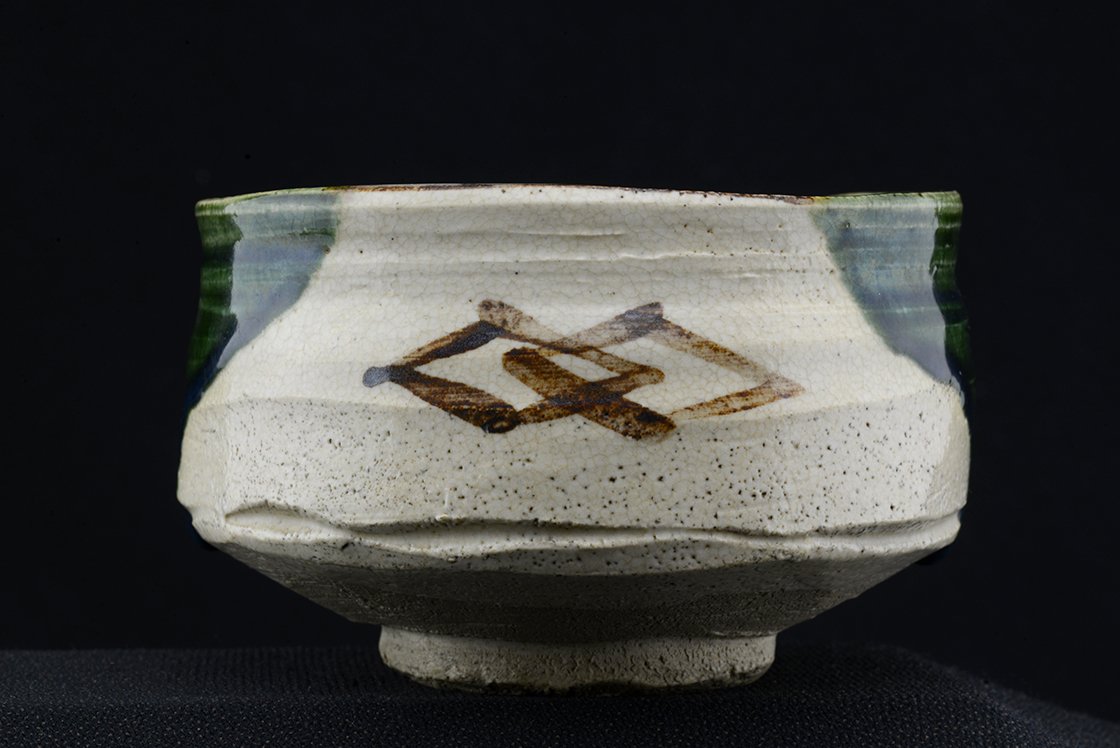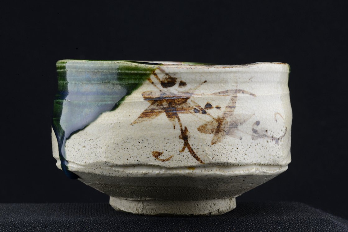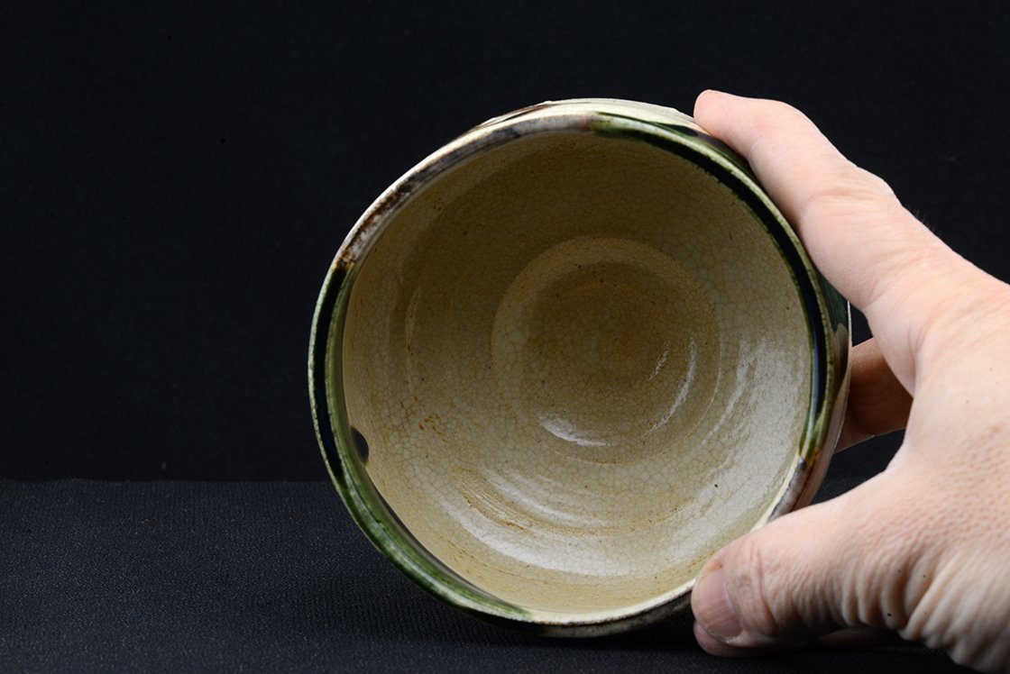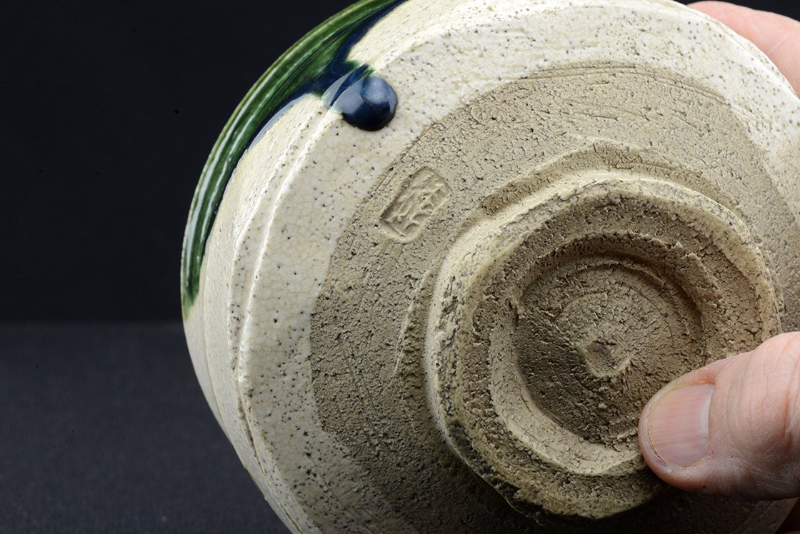 Jyuzo Sato (1943-) Jyubei nevű műhelyében született bájos Oribe chawana, ami 12 cm átmérőjű, 8 cm magas. Az Oribéről sokszor írtunk, könnyed, sokszor népies, vagy naiv mintákkal díszített fekete, sárga, zöld mázzal kerített szabálytalan alakot formázó különleges stílus, amit Furuta Oribe (1536-1598) a nagyhatású teamester talált fel a népszerű Mino kerámia megújításaként.