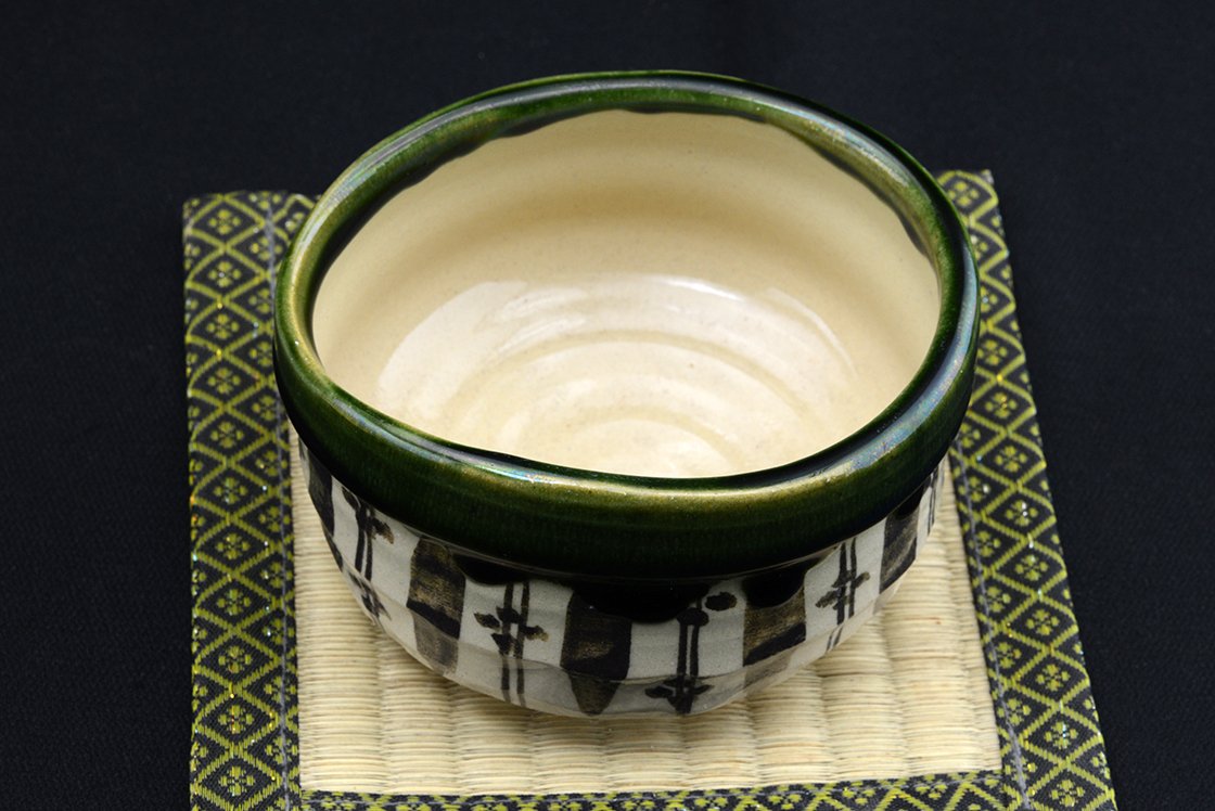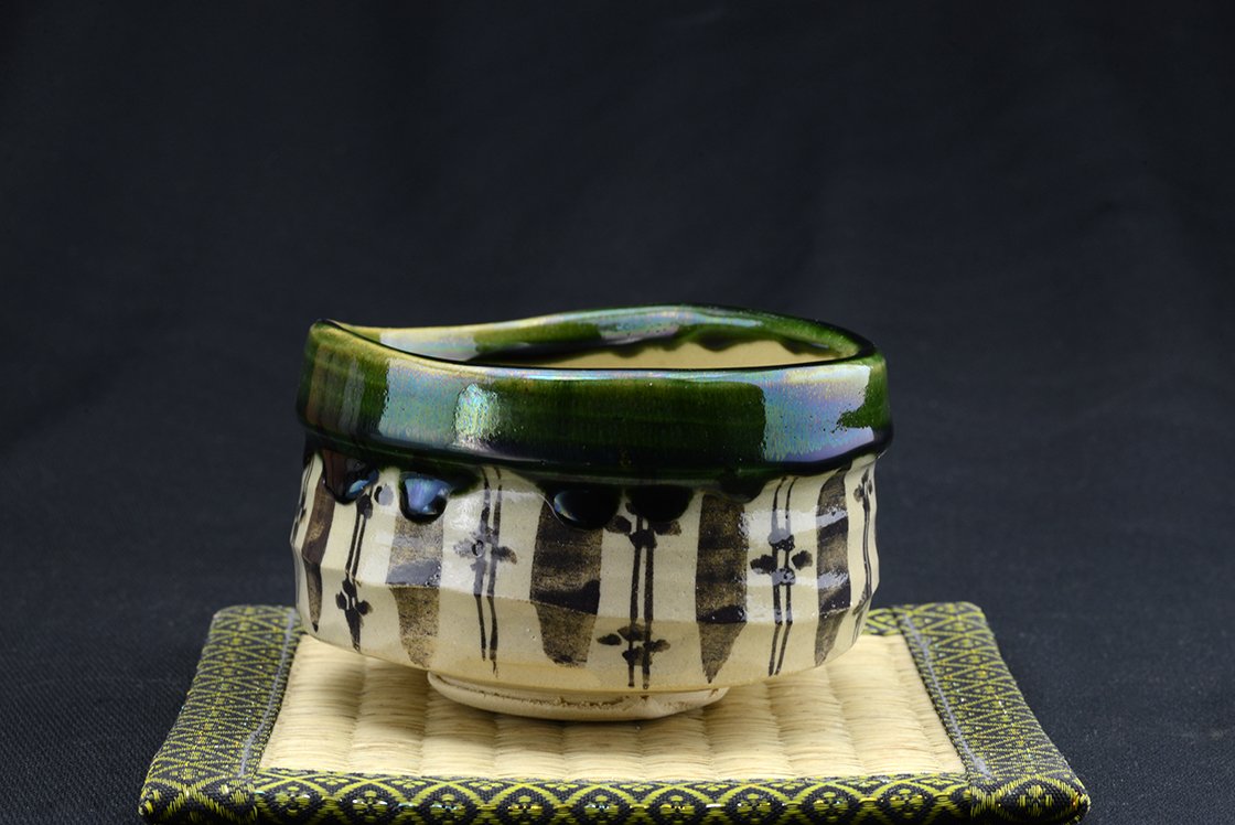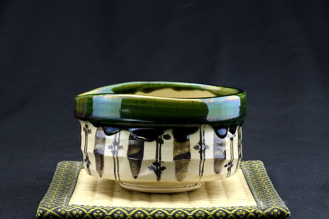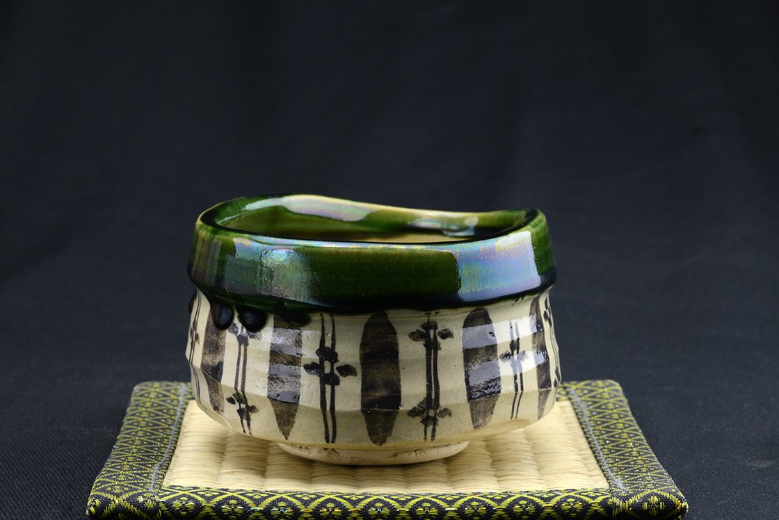 Az Oribe kerámia minden jellegzetességét bemutató naiv mintázatú chawan teáscsésze.