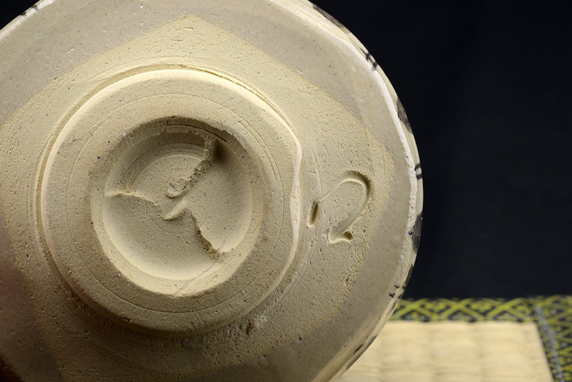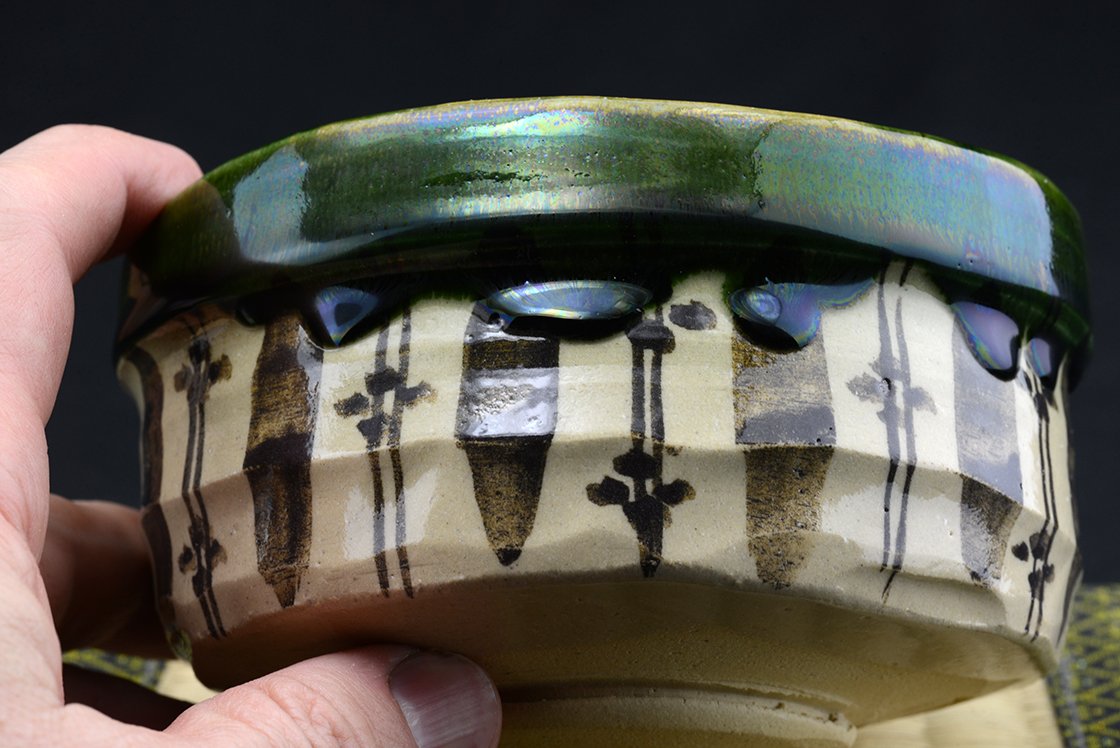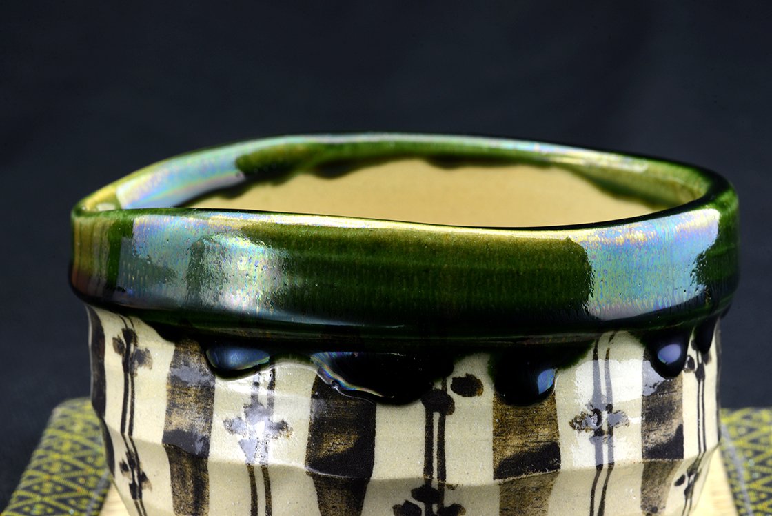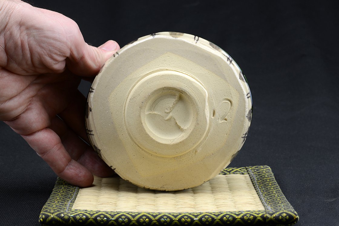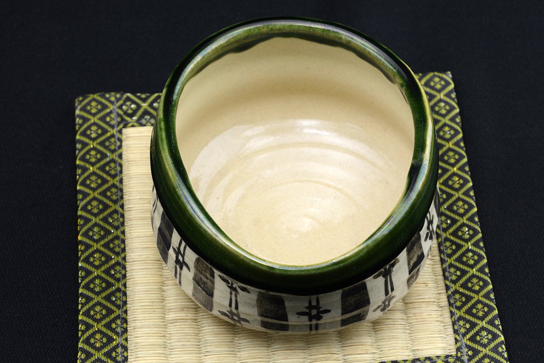 Az Oribe kerámia minden jellegzetességét bemutató naiv mintázatú chawan teáscsésze.