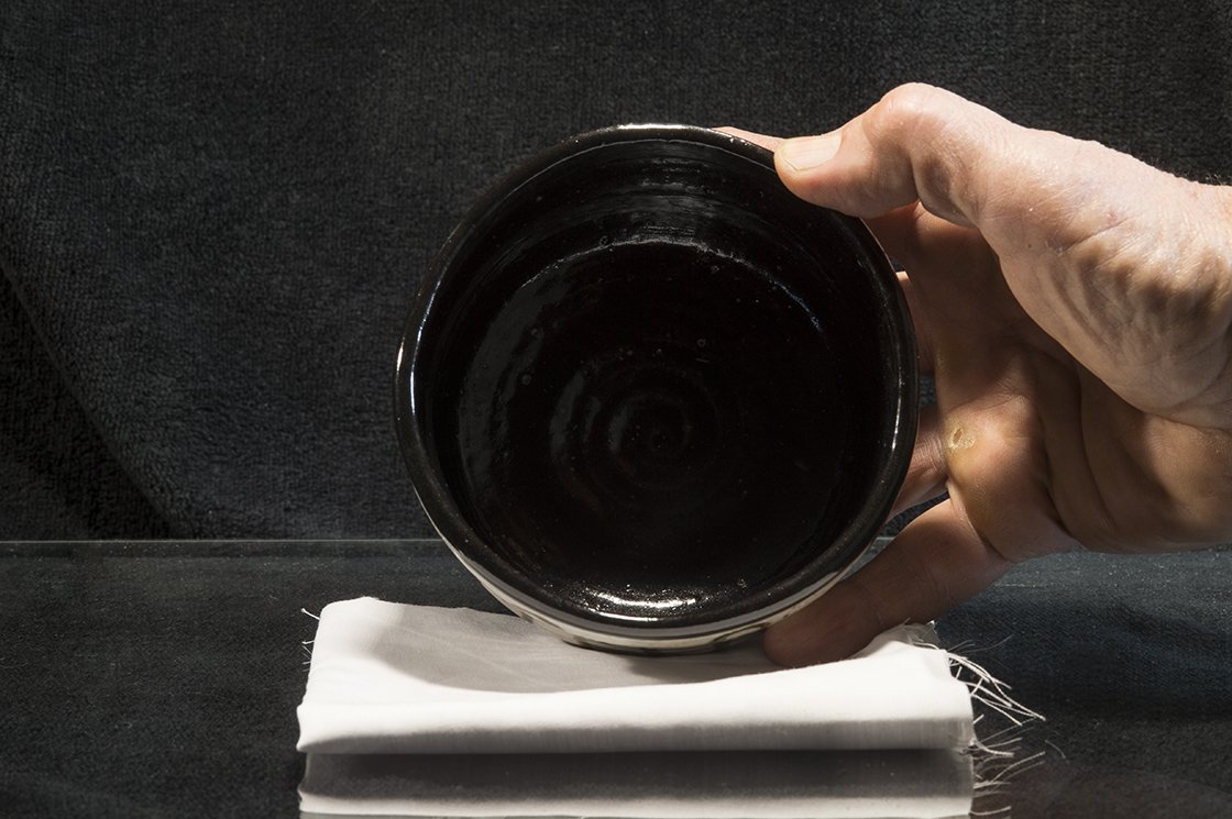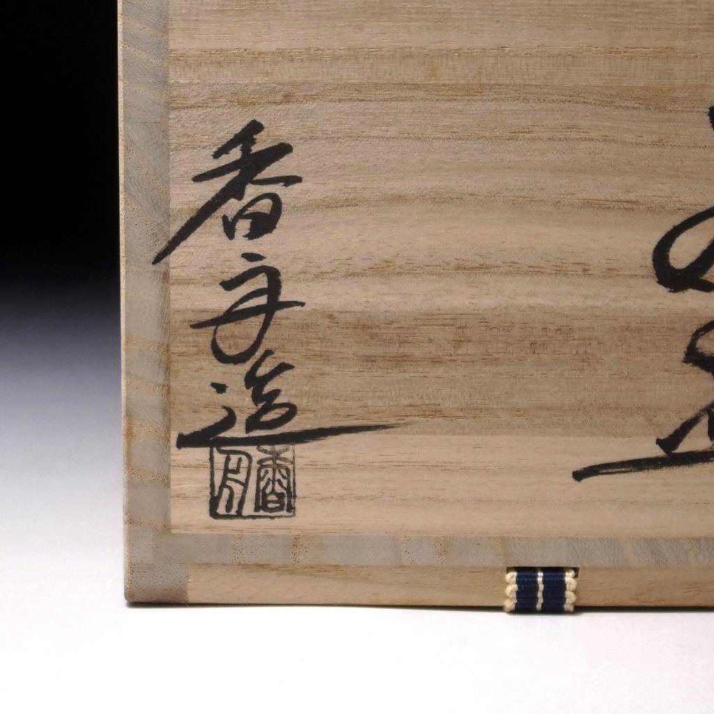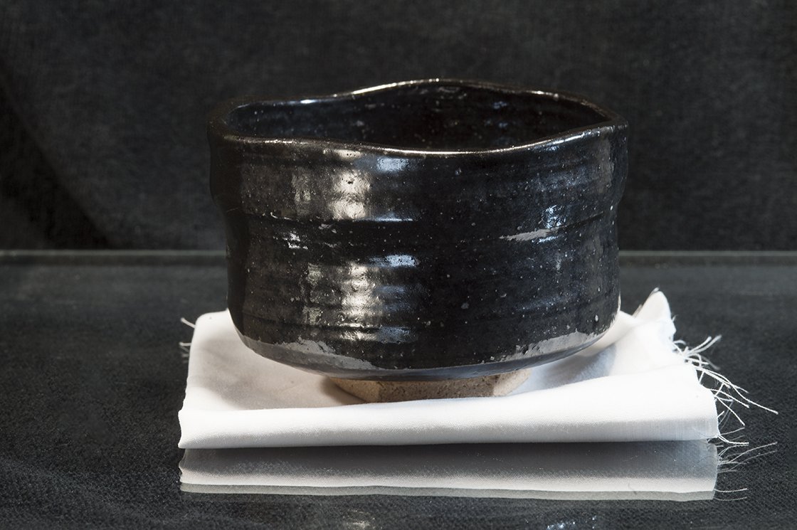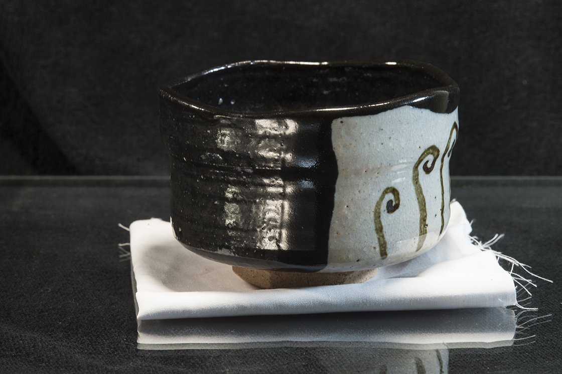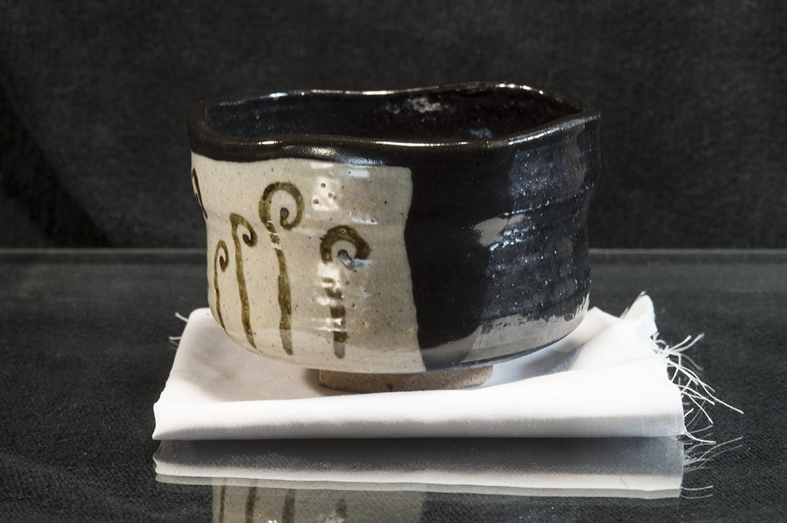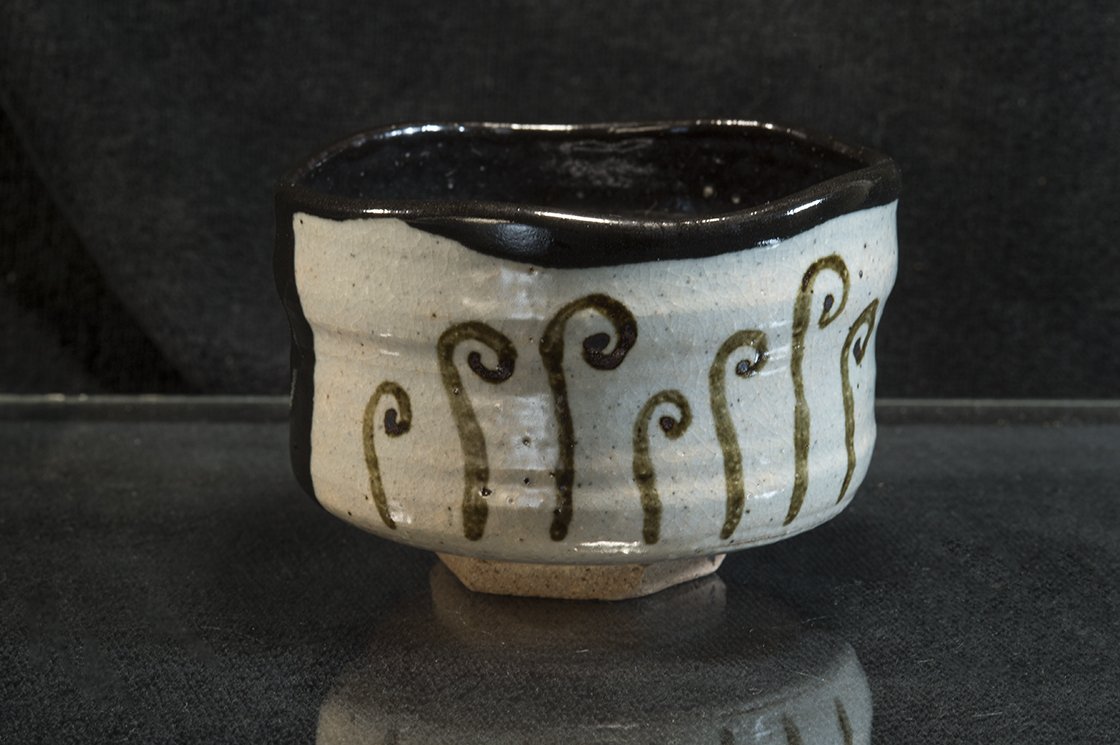 12 cm átmérőjű, 8,2 cm magas, kézzel festett Oribe chawan Koshuo Nishiko (1950 – ) műhelyéből. Nishiko shigaraki kerámiával foglalkozik, ez a csésze ujjgyakorlat az Oribe fanyar humorú világában.