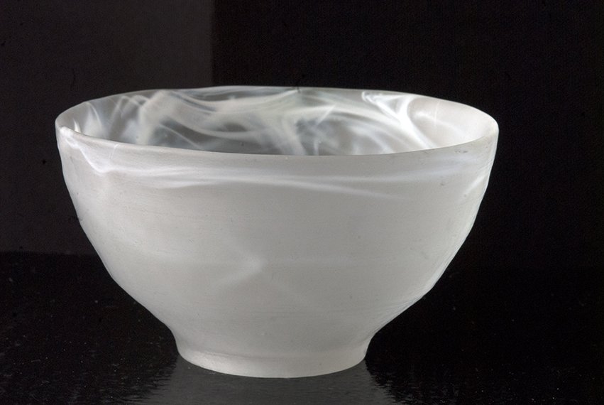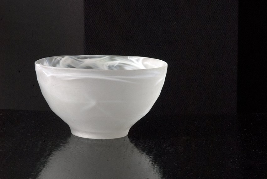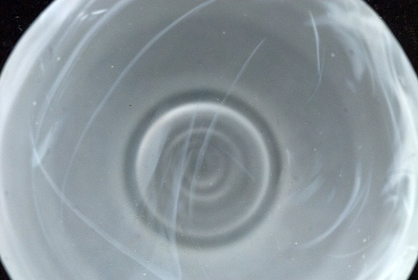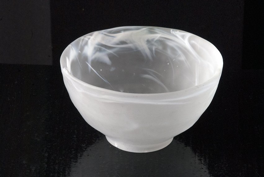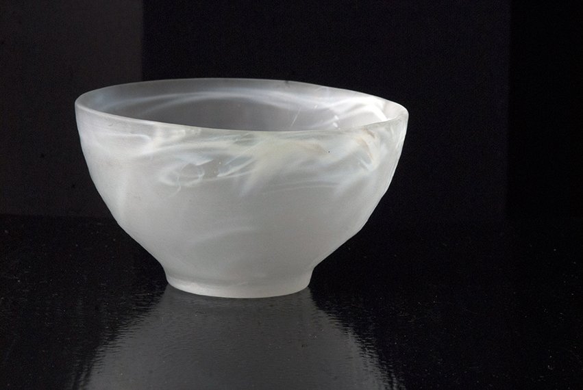 Elég fura szó ez a minőséget támasztani és termelni kívánő „kézműves”, holott tudjuk mind, hogy a minőség se ettől, se a gépektől nem függ. Különösen az üveg művészetben megtalálhatjuk mindkét gyártási formában a minőséget. Ez a darab mindenesetre kézműves üvegművészeti darab. Japánban már vagy ötven éve rátaláltak a művészi színvonalú üveg teában való használatának örömére, fantasztikus darabokat hozva létre. Az üveg frissességet, tisztaságot, áttetszőséget kölcsönöz a teának, és jól hűti is. Ez a „kézműves” üveg chawan 12,5 cm átmérőjű, 6,6 cm magas.