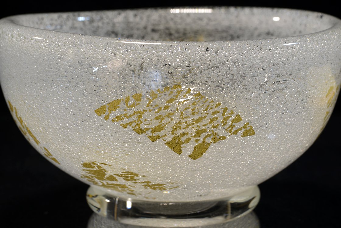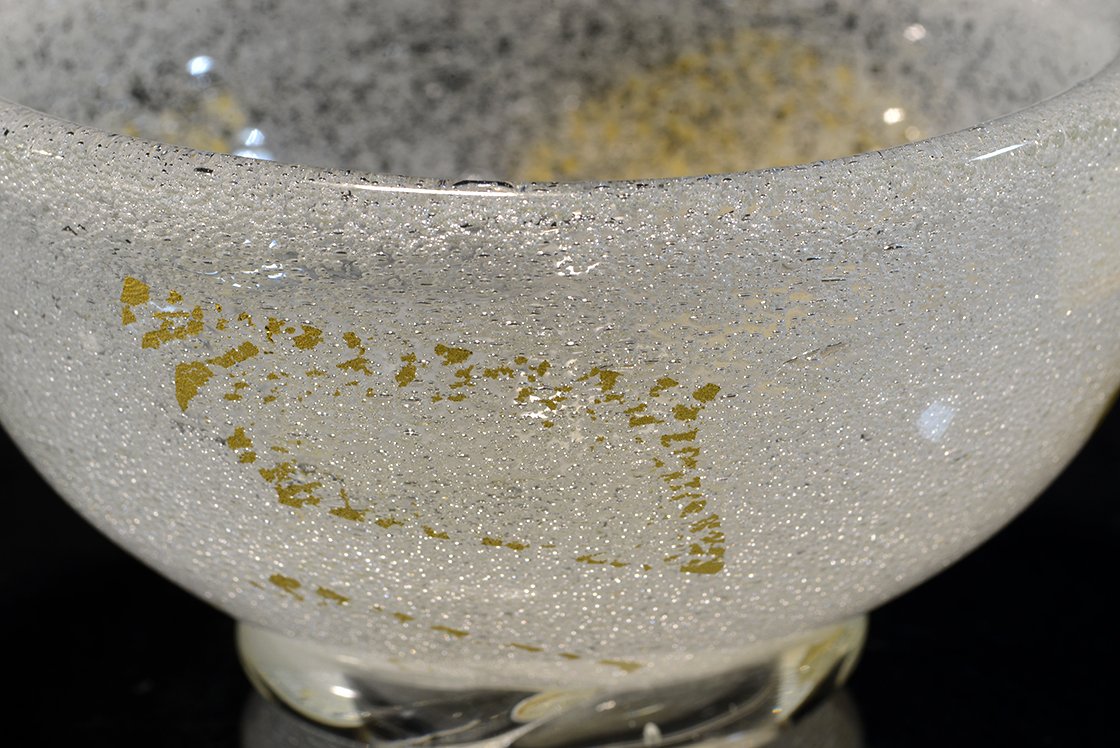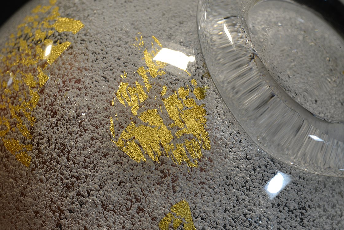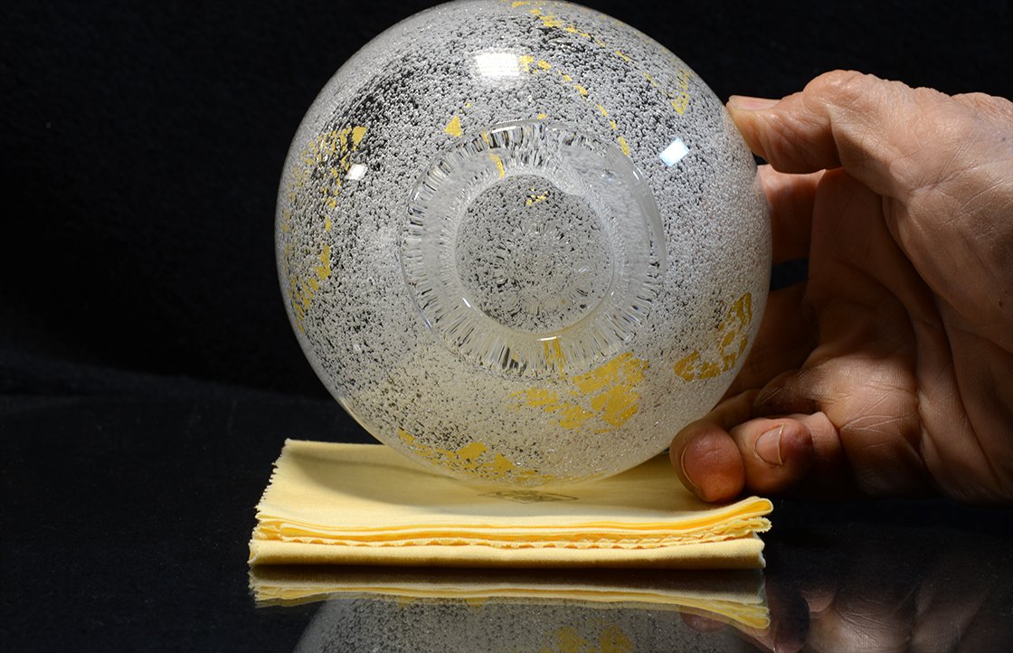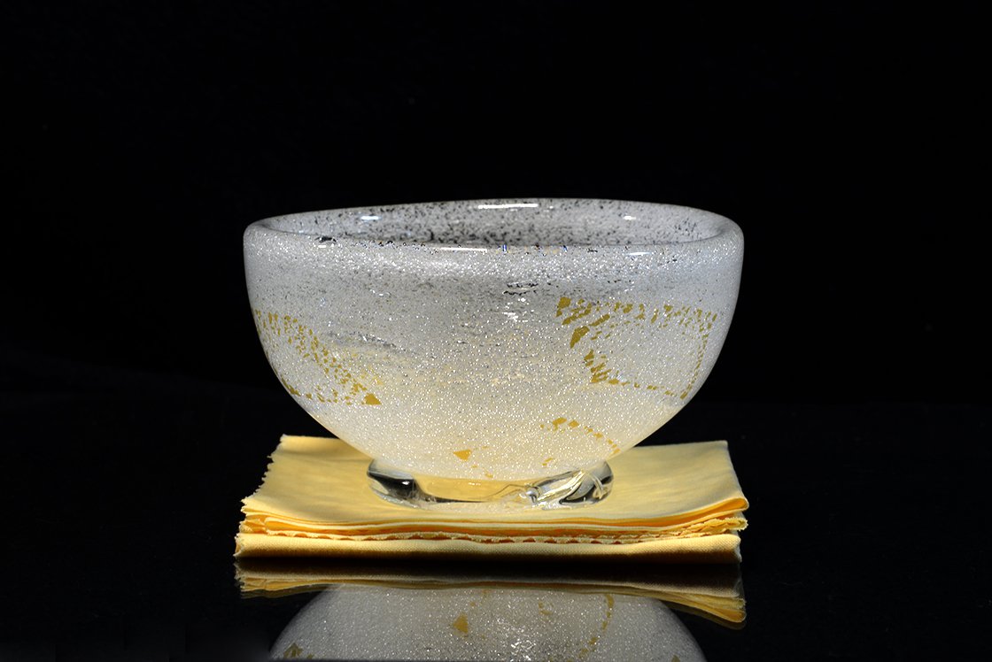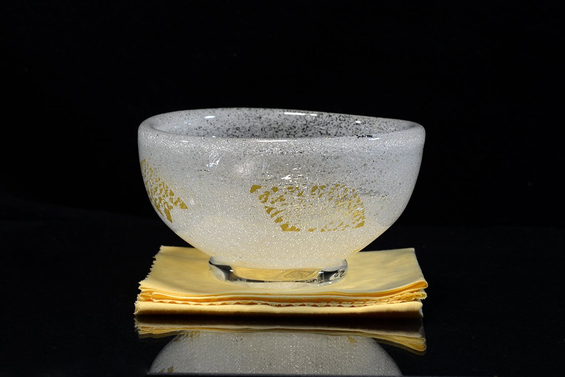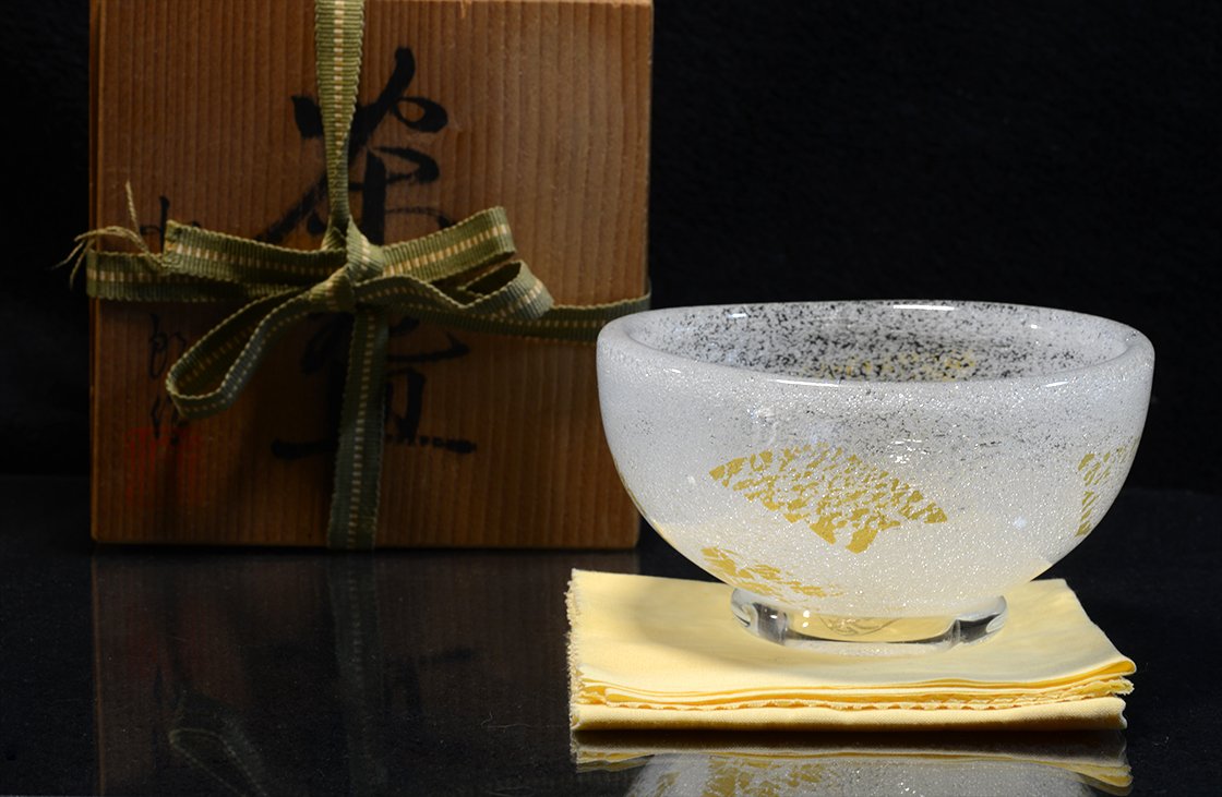 Remekbeszabott, kézzel készített és fújt üveg chawan Sosaburo Kato keramikus műhelyéből. A csésze súlyos, gyönyörű, 13 cm átmérőjű, 7,5 cm magas.