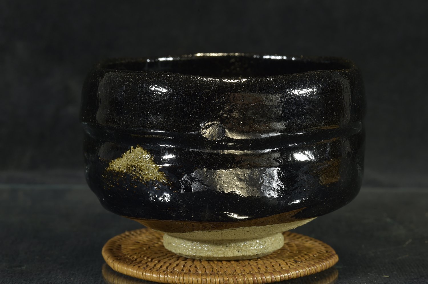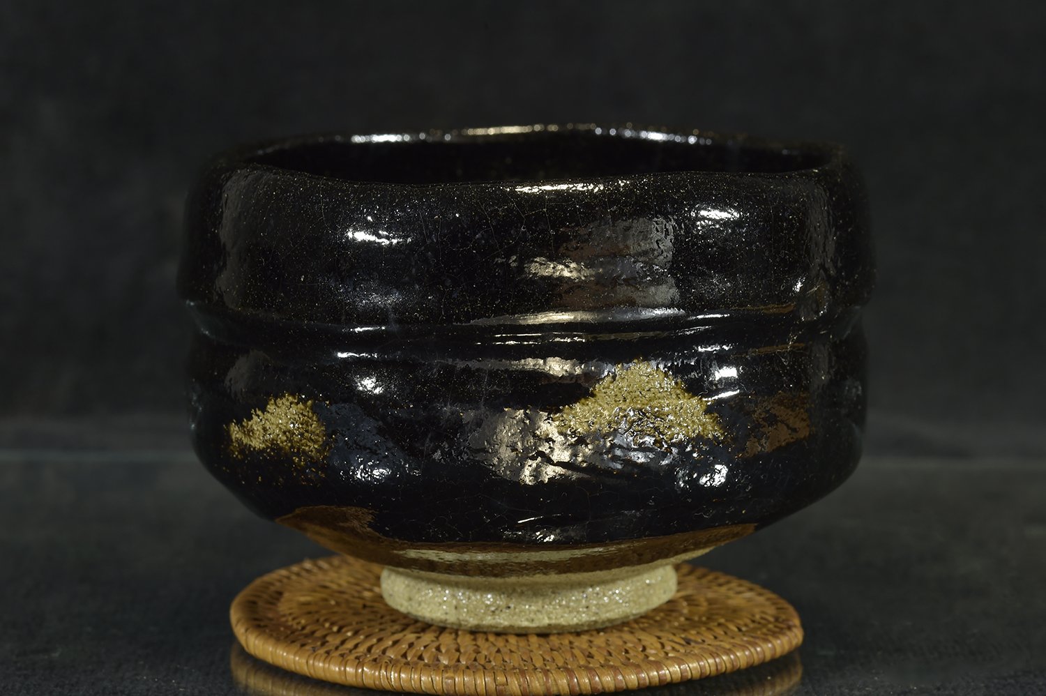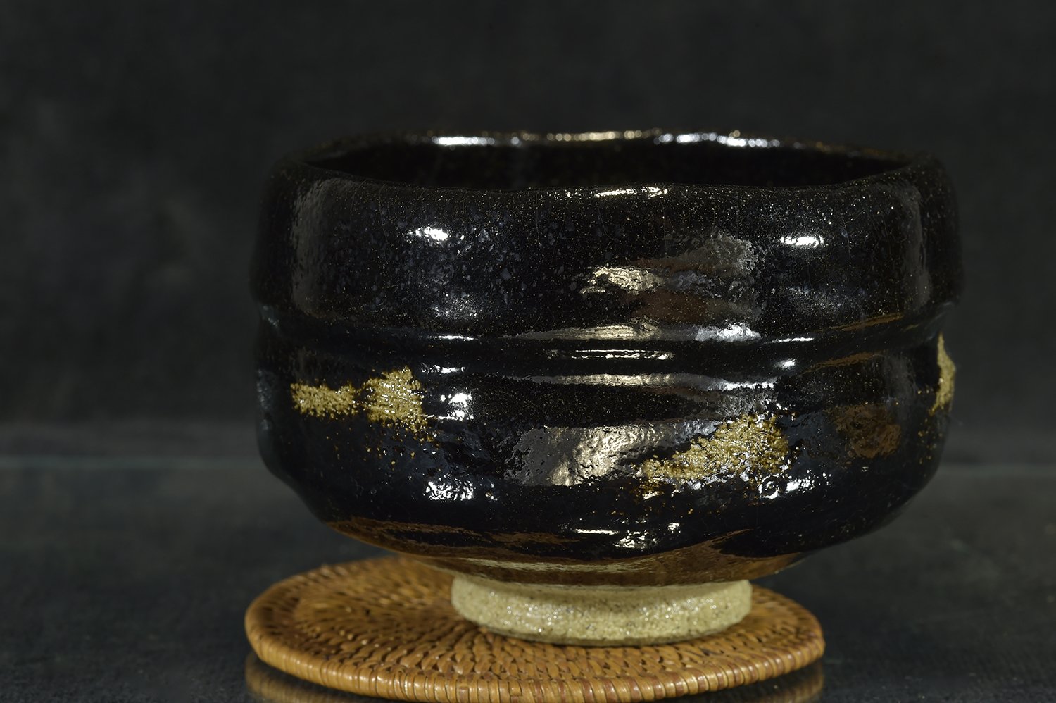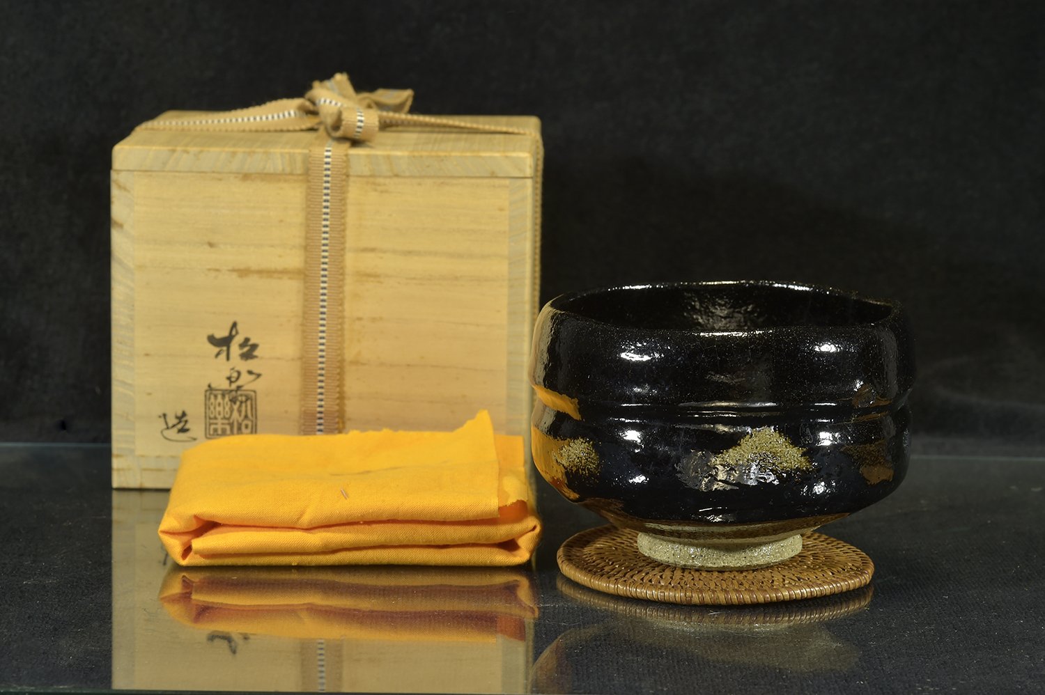 11,8r cm átmérőjű, 8,2 cm magas kuro raku chawan Shoraku Sasaki műhelyéből. A chawan a Daitokuji templom részére készült, amelynek hivatalos keramikusa más magasan jegyzett keramikusok mellett Sasaki műhelye.