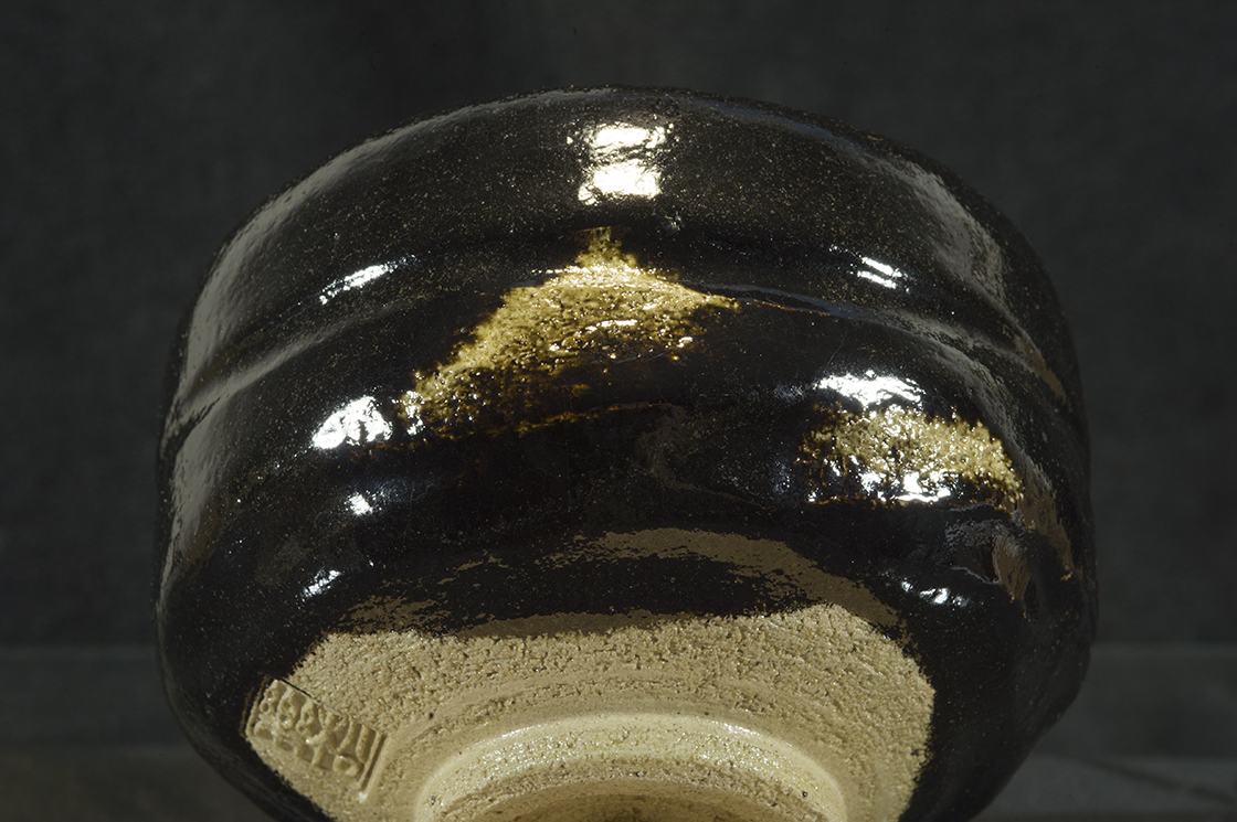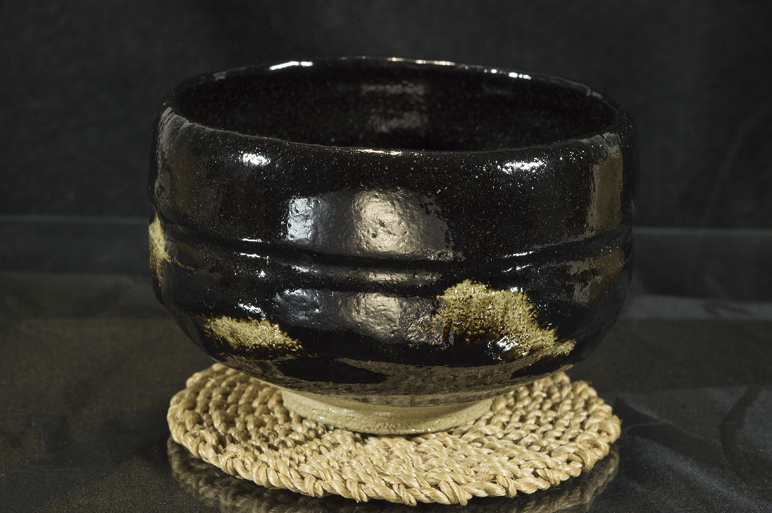 Daitokuji-zen-templom-kuro-raku-chawan-18A Daitokuji zen templom kuro raku matcha csésze #18 11,7 cm átmérőjű, 7,8 cm magas kuro raku chawan Shoraku Sasaki műhelyéből. A chawan a Daitokuji templom részére készült, amelynek hivatalos keramikusa más magasan jegyzett keramikusok mellett Sasaki műhelye.
